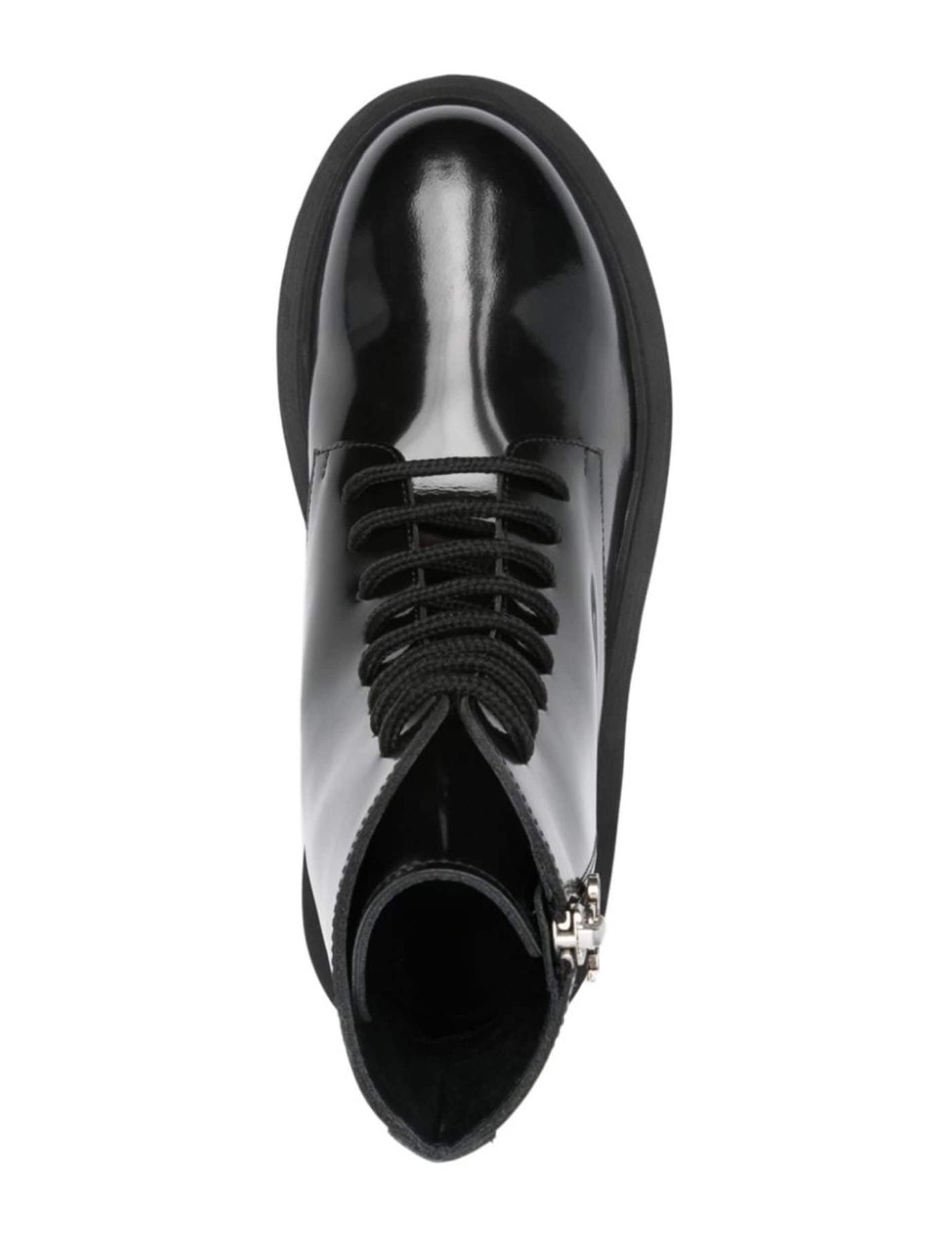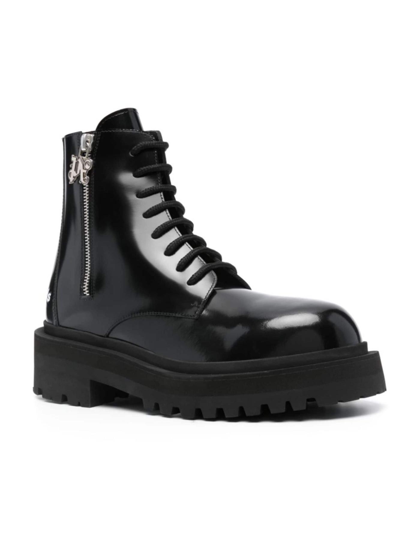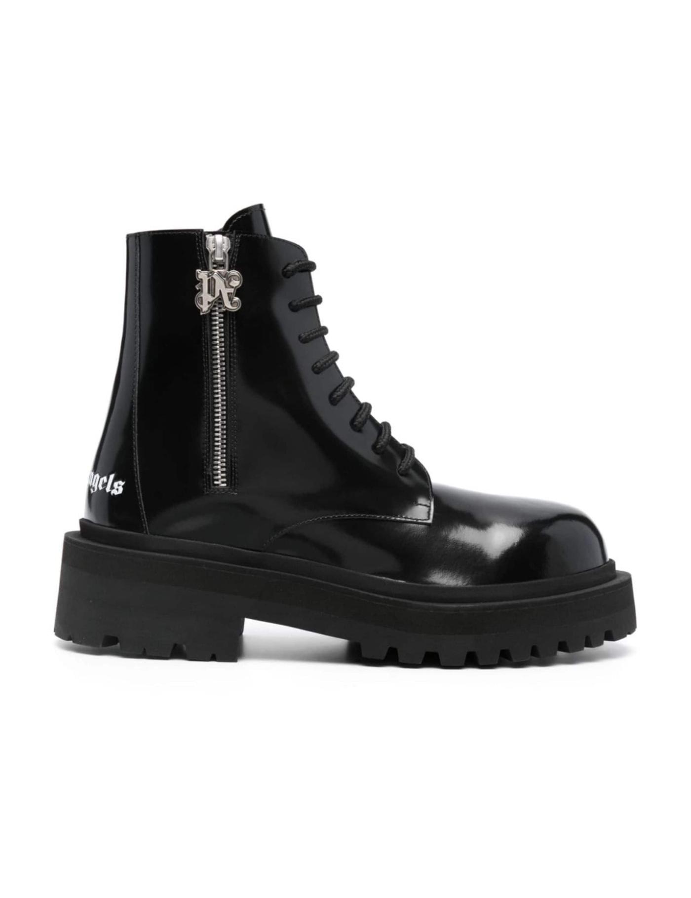 Crafted from leather in a bold high-shine finish, these Palm Angels lace-up ankle boots sit atop a chunky low heel. They're embellished with a contrasting logo print at the heel for a branded touch.