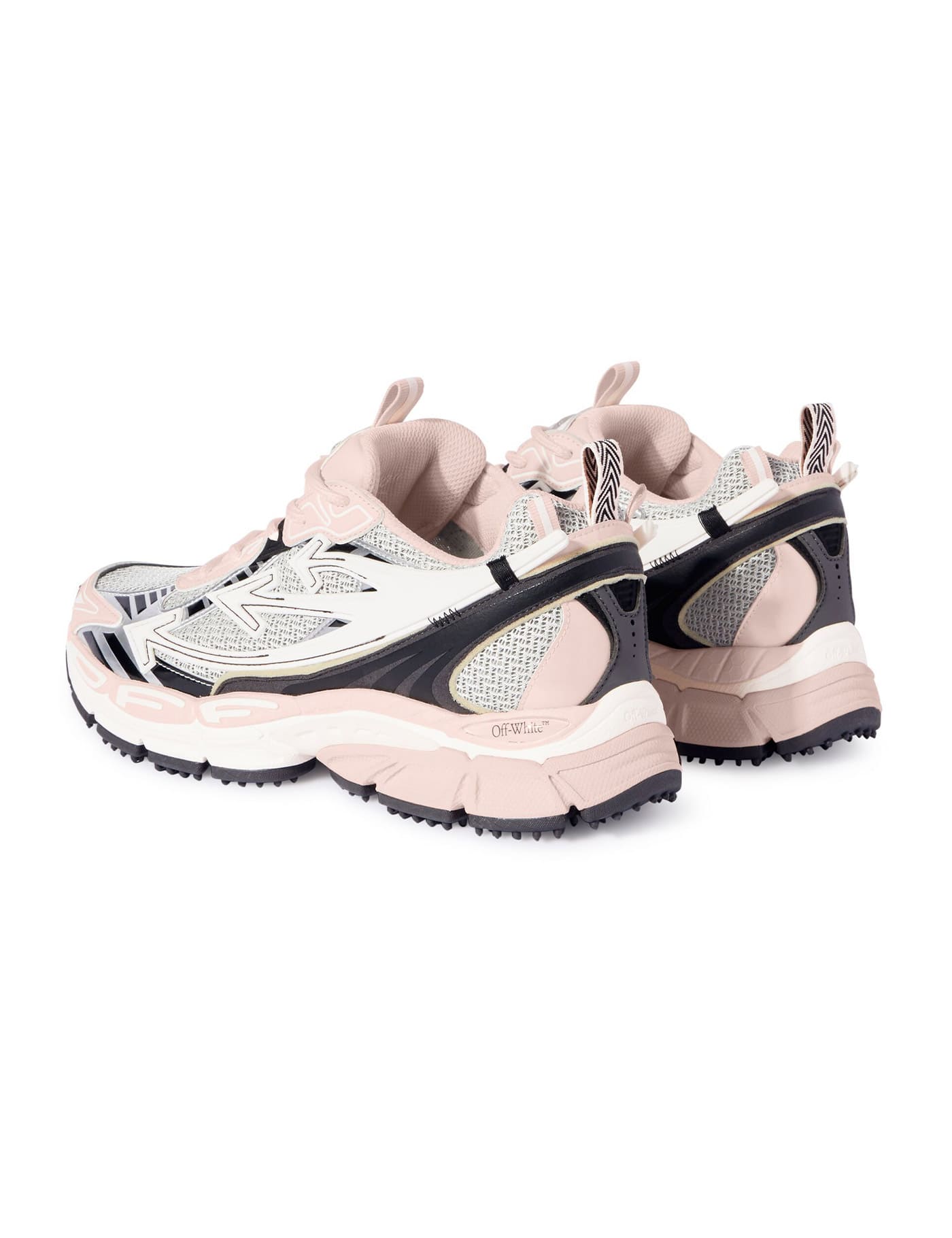Light pink/multicolour panelled design mesh panelling signature arrows motif logo patch at the tongue logo tag double pull-tab at the opening almond toe front lace-up fastening branded insole chunky rubber sole