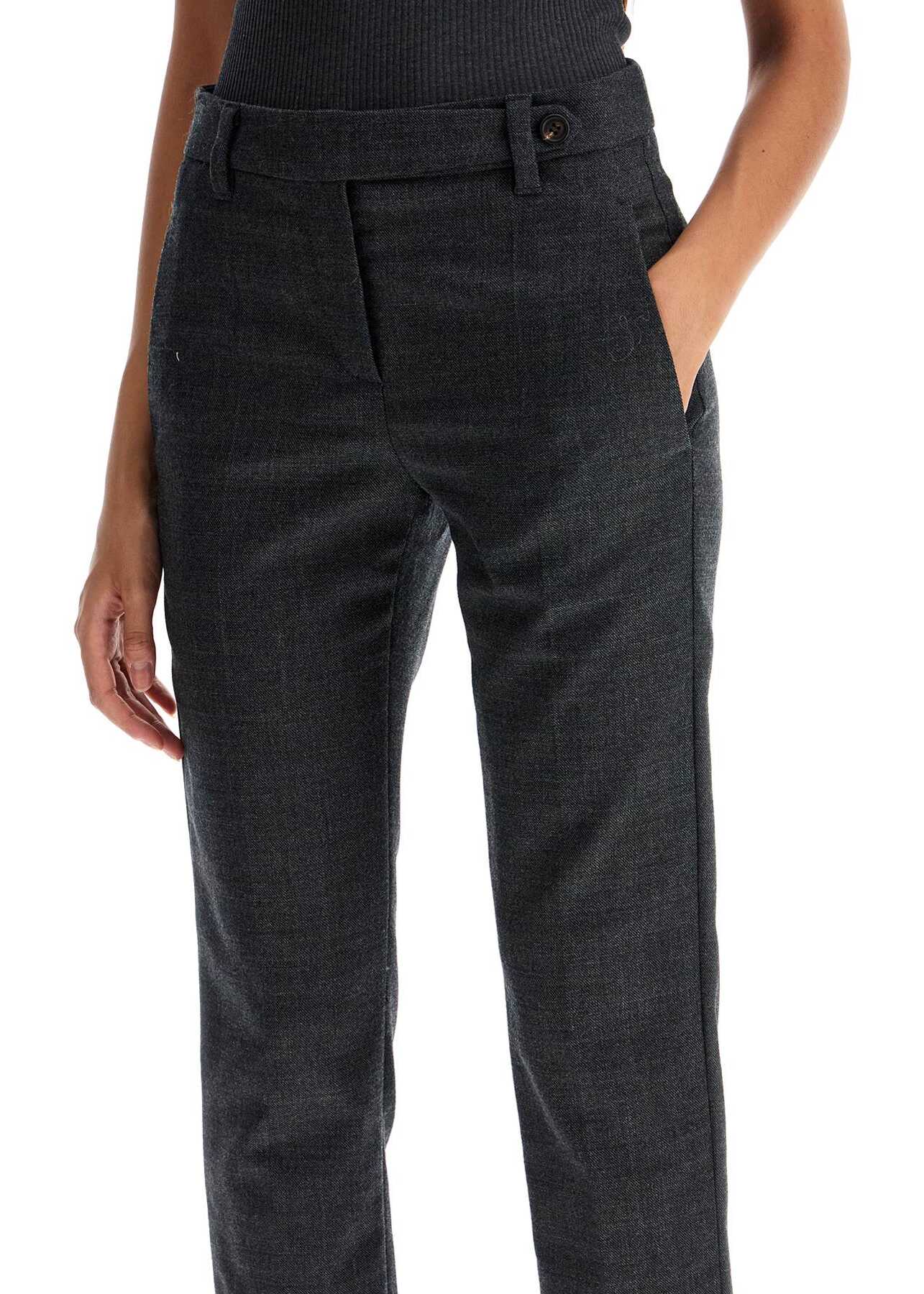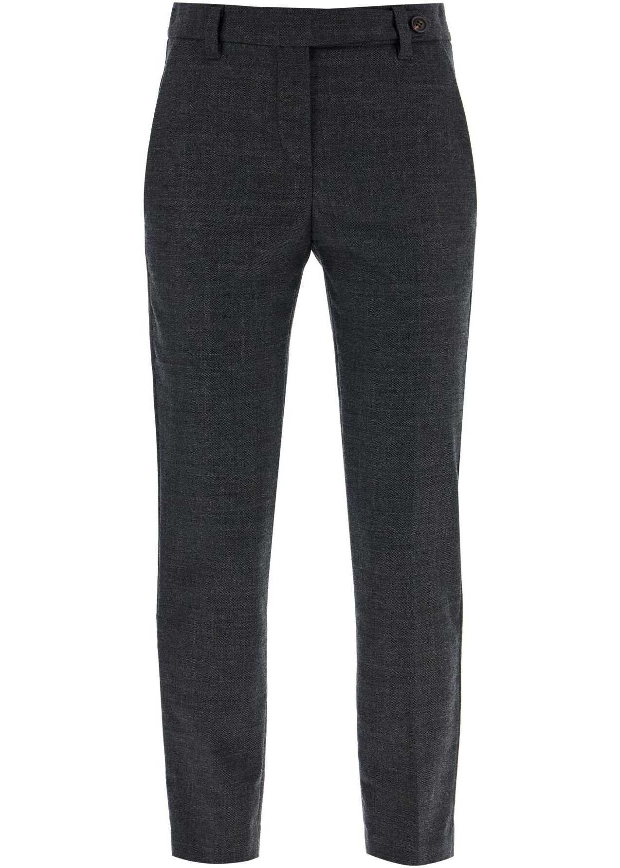 These Brunello Cucinelli trousers, with a cigarette design and high waistline, are made of virgin wool in a grey shade. They are embellished by a shiny monile on the back belt loop. Featuring a zip and concealed hook closure, French front pockets, welt back pockets, pressed creases, and cropped hem. The model is 177 cm tall and wears size IT 38.