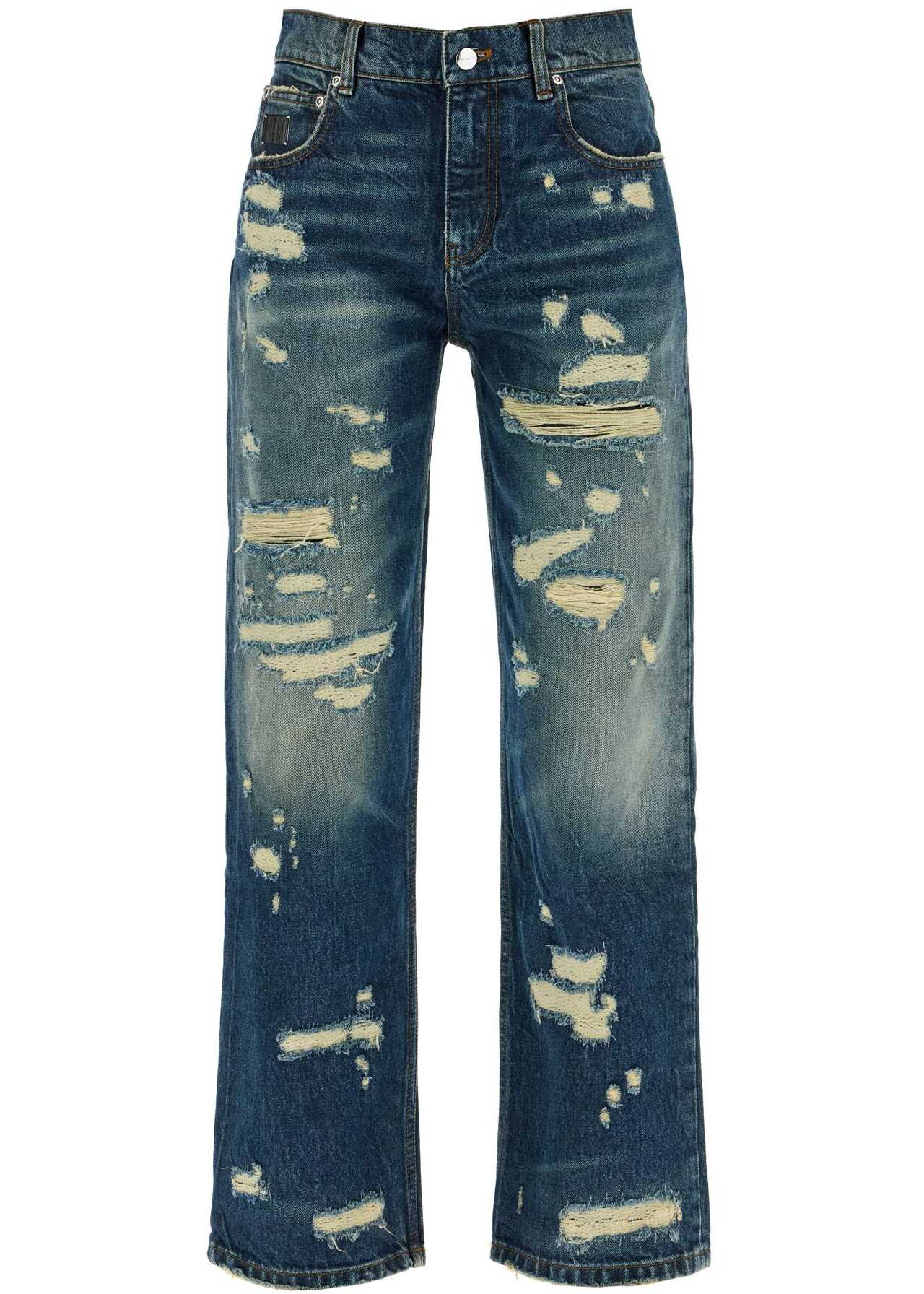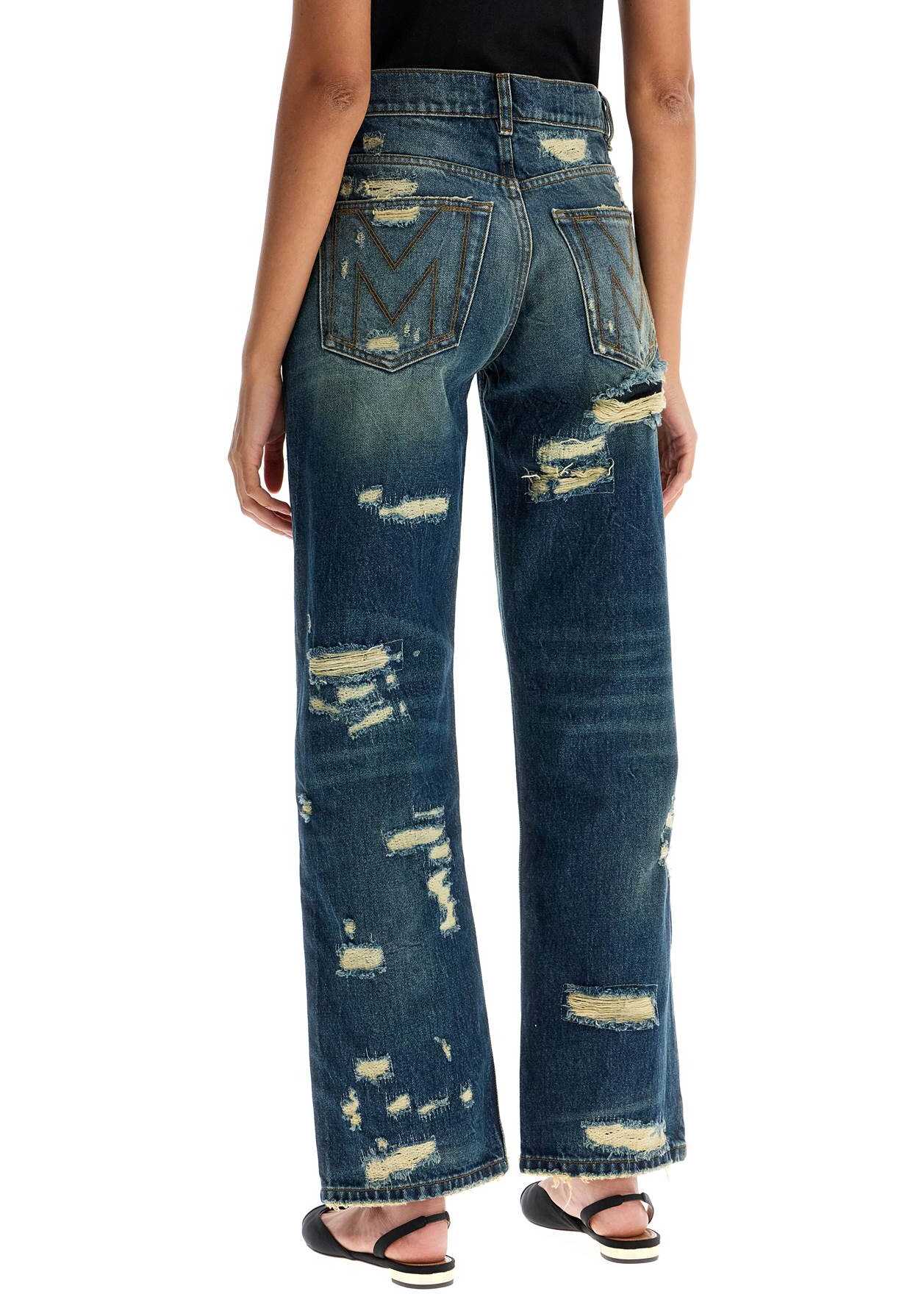 The Marc Jacobs Rip & Repair Jeans are made of 100% cotton denim with a used wash and a destroyed design throughout. They have a mid-rise waist, hidden zip and button closure, and five pockets including one adorned with a metal logo plaque. The back features decorative M-shaped stitching. These jeans have a regular fit and straight leg. The model is 177 cm tall and wears a size 26.