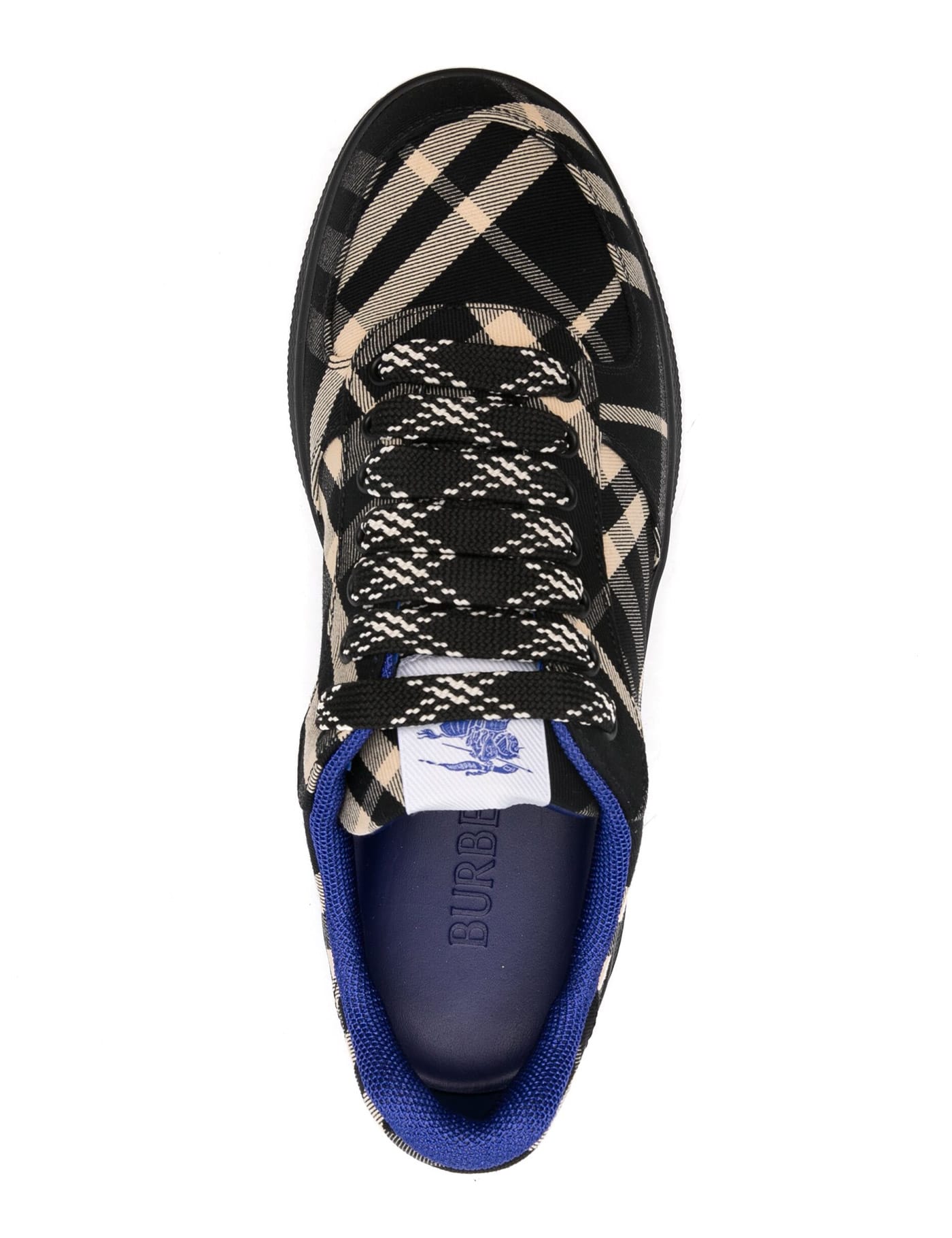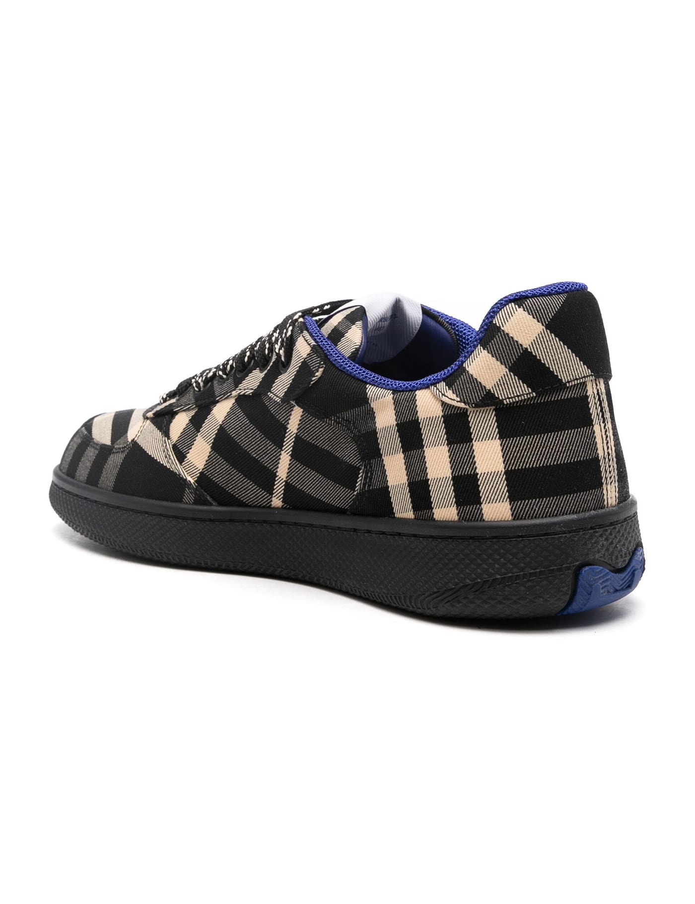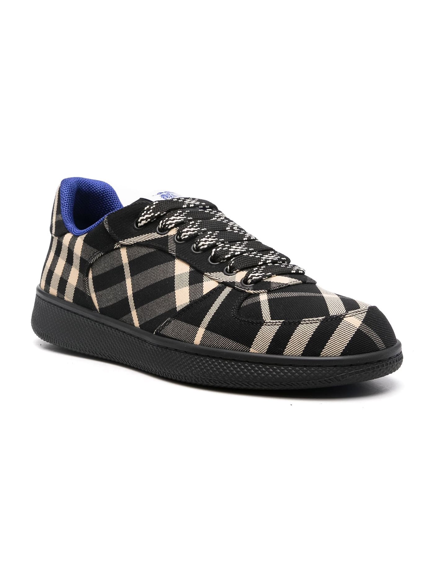 The Burberry Terrace Check Sneakers feature a twill cotton blend upper with the iconic Burberry Check pattern. They have a front lace-up closure, an Equestrian Knight Design label on the tongue, and a fabric interior with a removable leather insole. The rubber sole provides comfort and durability. These sneakers also come with spare laces for added convenience.