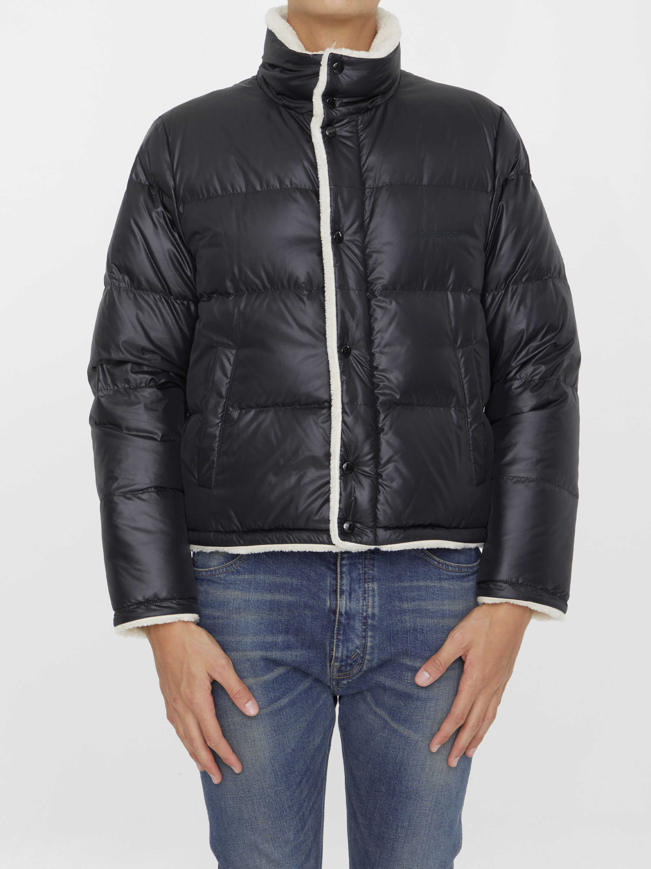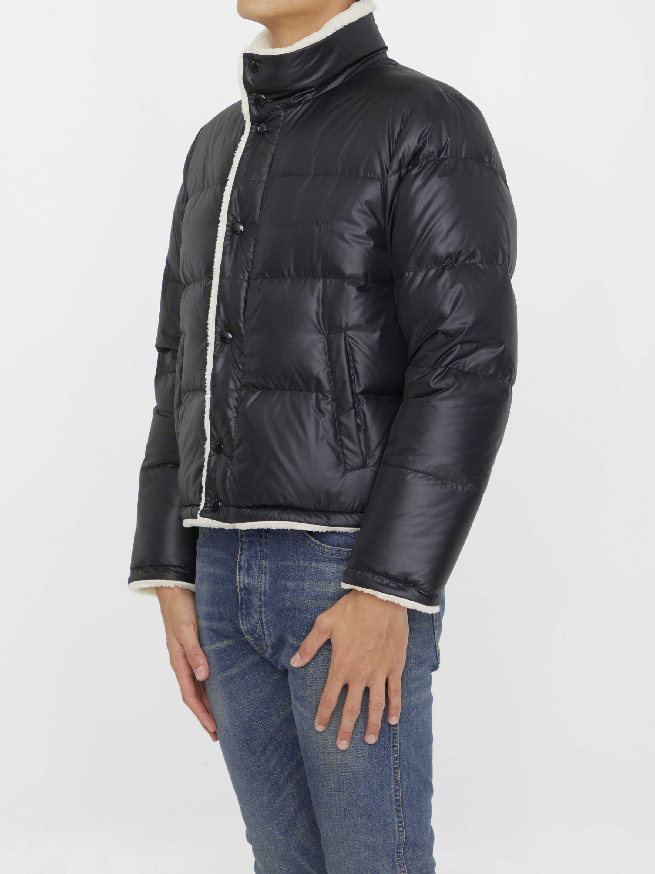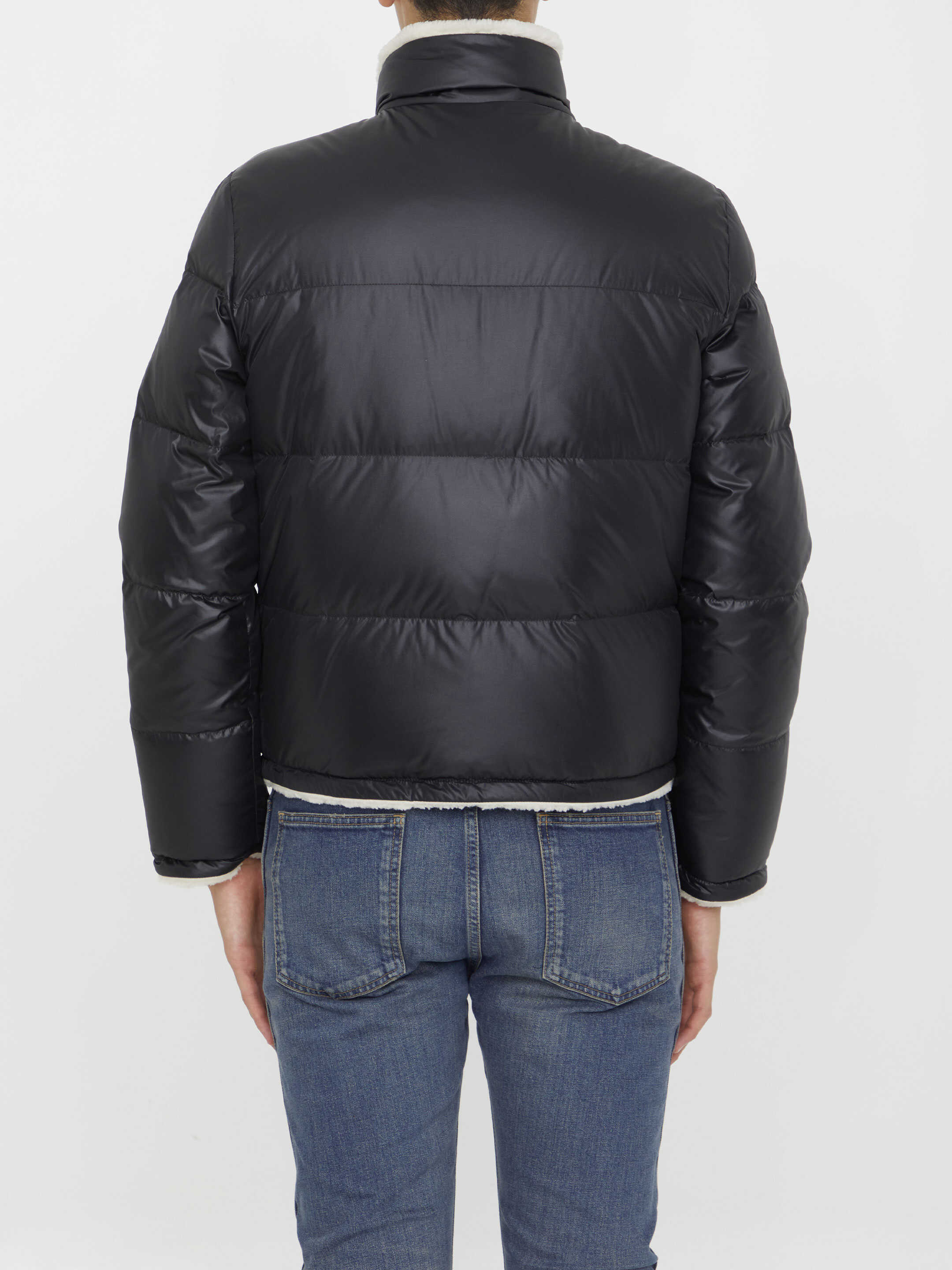 Down jacket in black padded nylon with faux shearling lining. It features stand-up collar, front zip and press-stud closure, two side press-stud pockets and Saint Laurent embroidery on chest. Regular fit.