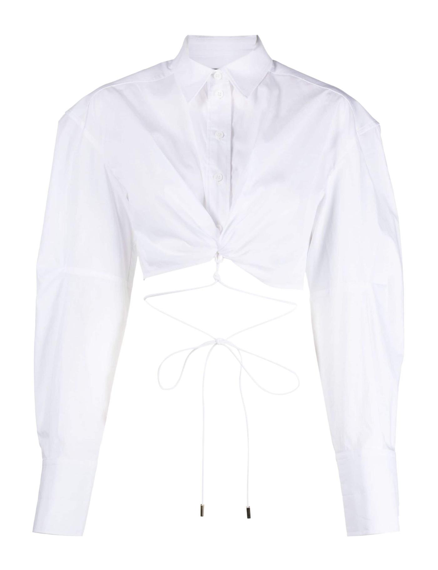 Jacquemus puts an experimental twist on the classic white shirt: this one's crafted to a cropped silhouette with voluminous sleeves and elongated ties that wrap around the waist. A gold-tone logo-engraved clasp at the front secures the drawstrings in place.