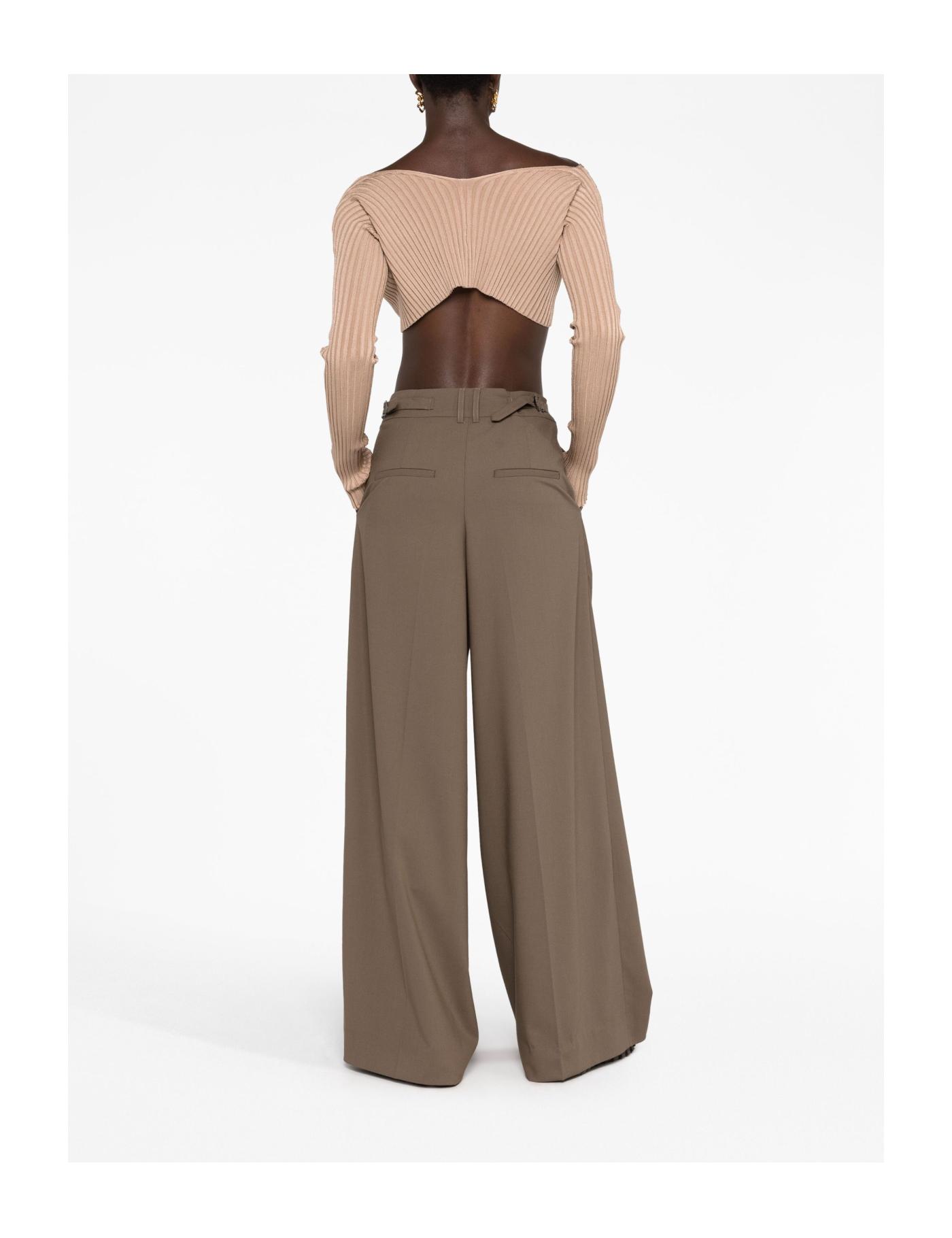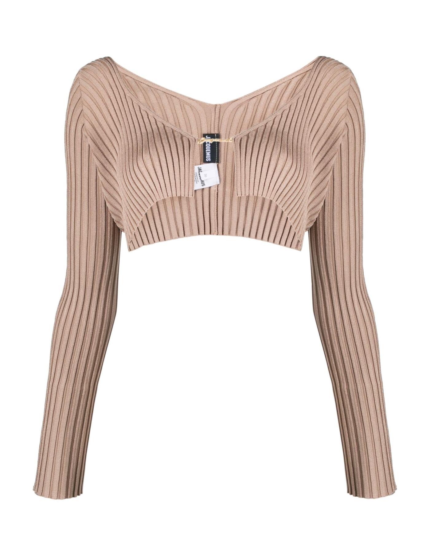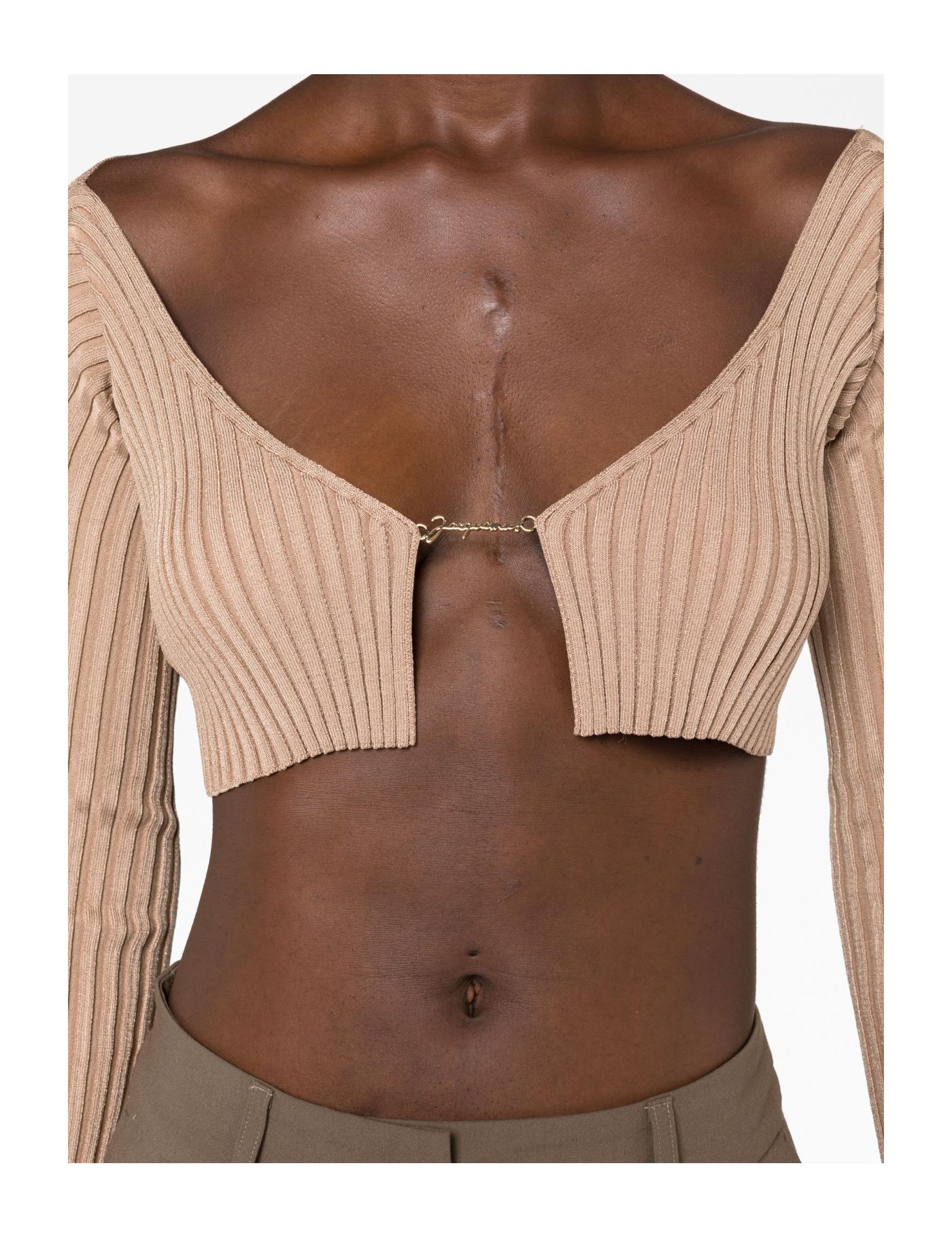 Jacquemus puts a signature daring spin on this ribbed-knit La Maille Pralù cardigan, cropping the hem to sit just under the bust and leaving the front open save for a gold-tone logo plaque fastening. Long sleeves help visually balance the figure-baring design.