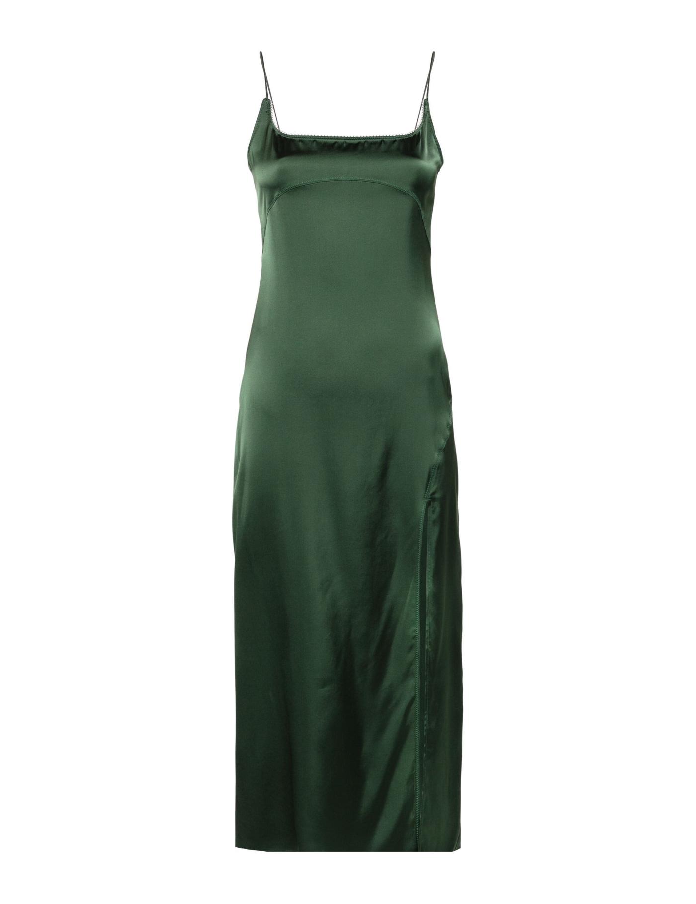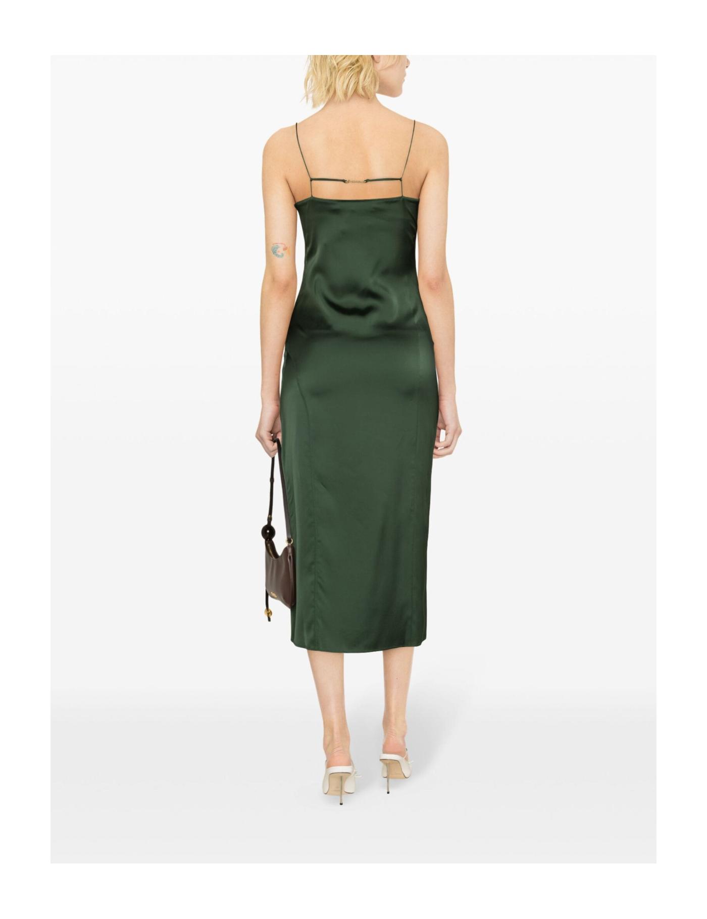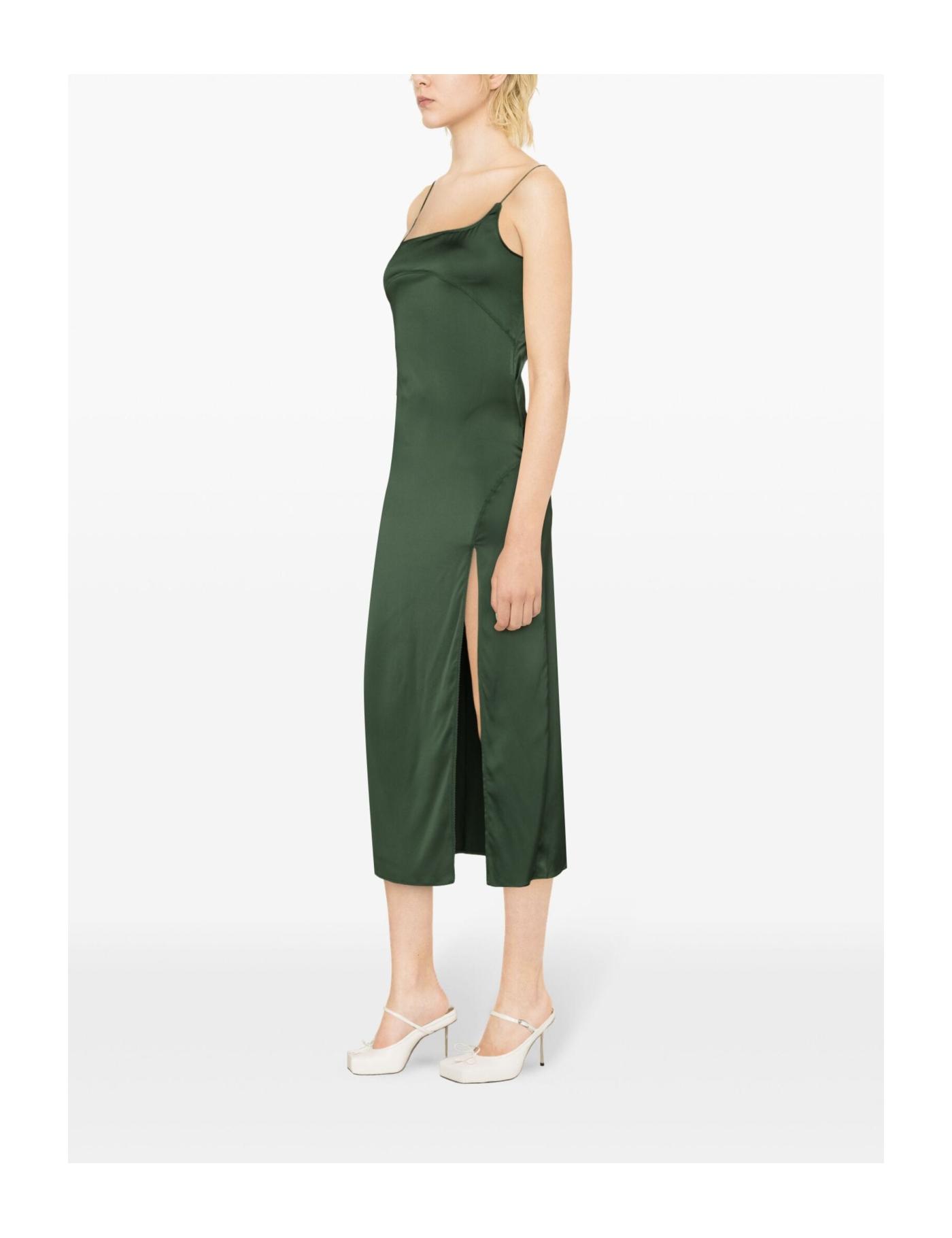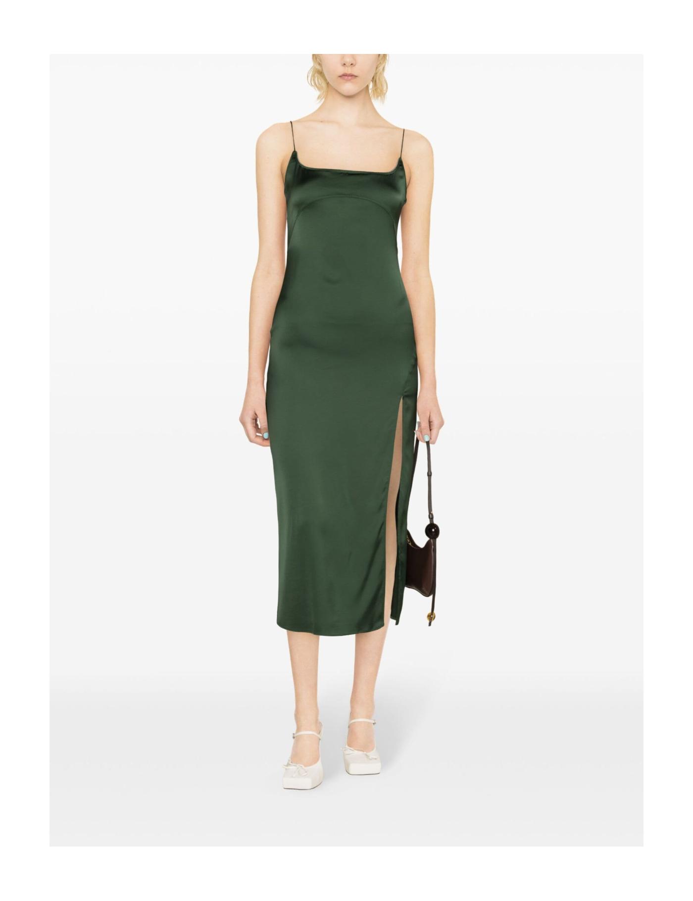 Sleek and minimalistic, this satin slip dress by Jacquemus is imagined in a captivating dark green hue. It's detailed with an alluring side slit and gold-tone logo plaque at the rear strap.