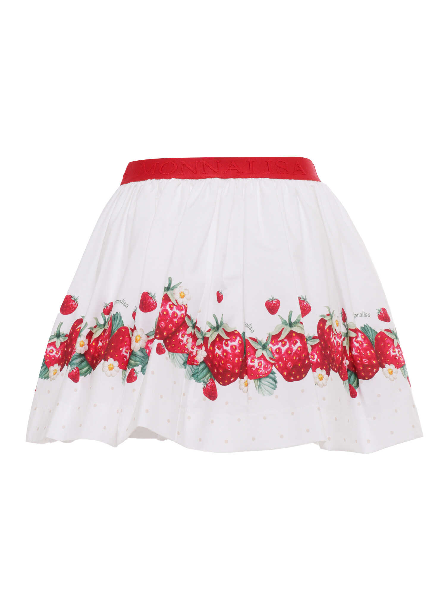 White poplin skirt for girls with all-over strawberry pattern, contrasting red strap.