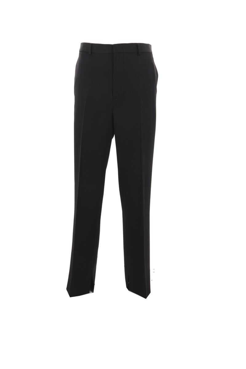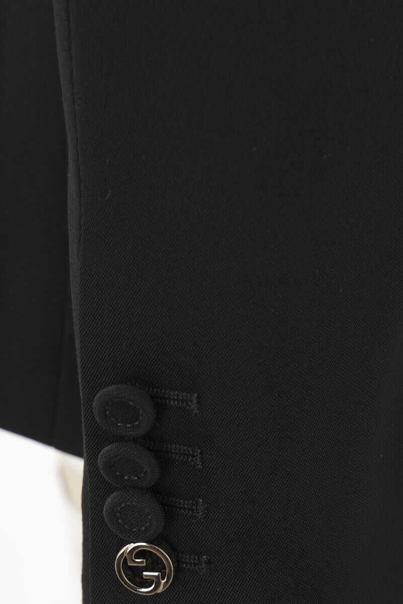 Gucci's two-pieces suit crafted in black wool. The double-breasted jacket features peak lapel, structured shoulders, button closure, long sleeves with buttoned cuffs, front pockets and back central vent. Lined interior. The regular-fit pants feature front hook / button / zip closure, belt loops, multiple pockets, central pressed crease and side slits at the hem. Partially lined interior.