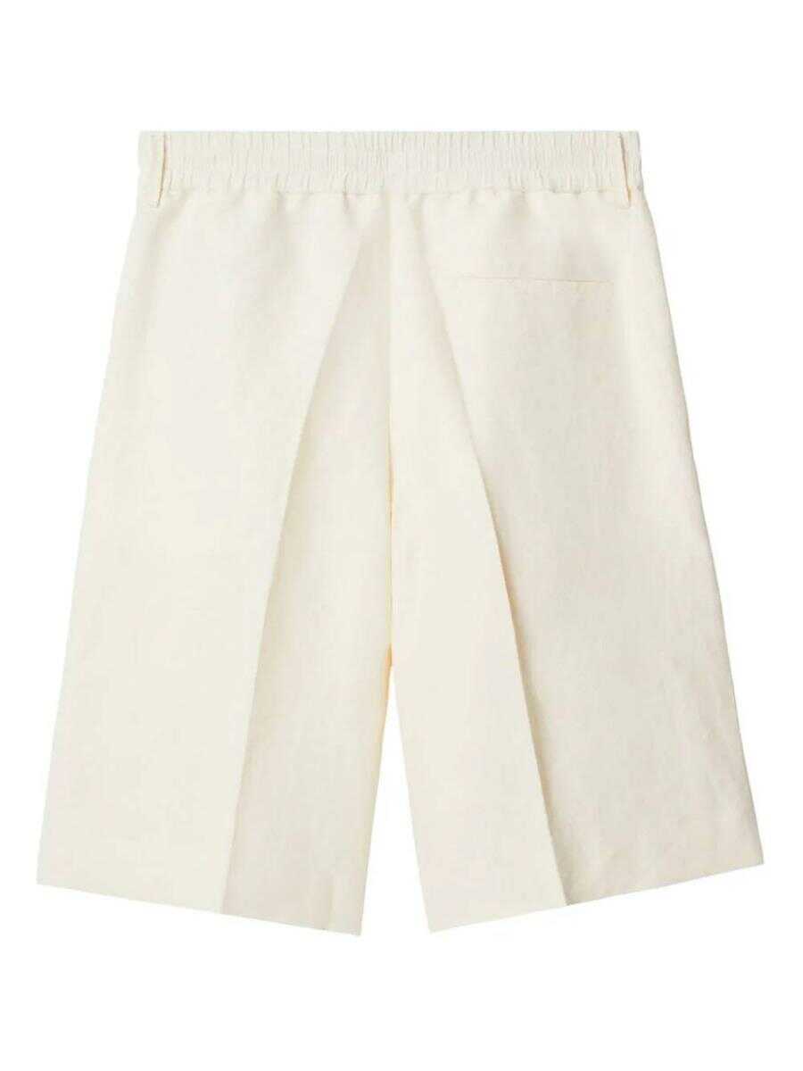 off-white canvas tailored cut elasticated drawstring waistband front zip fastening slip pockets to the sides rear button-fastening pocket pressed crease straight leg knee-length