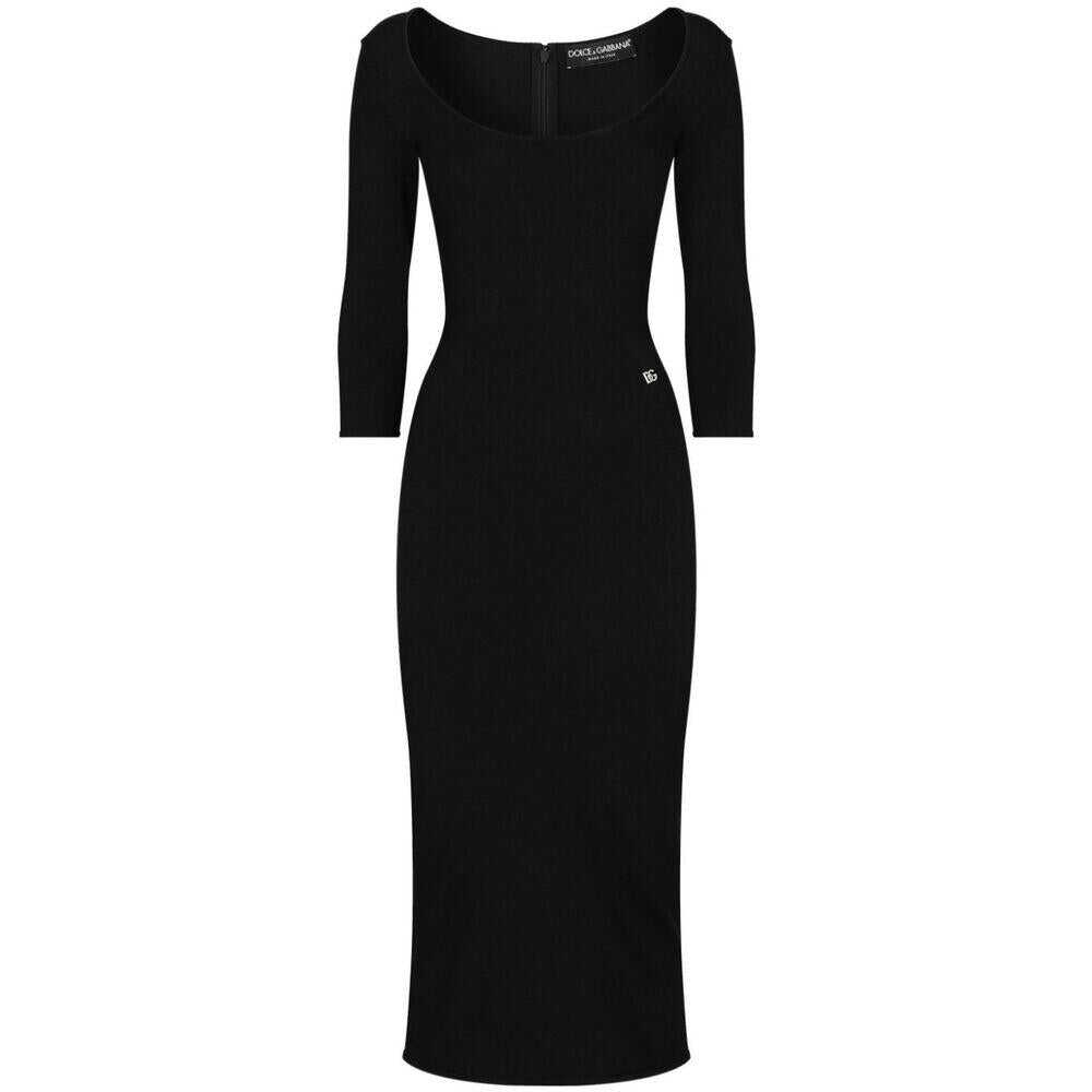 Black stretch-design logo plaque at the hip scoop neck three-quarter length sleeves rear zip fastening fitted waistline pencil skirt mid-length straight hem