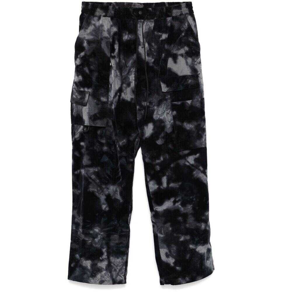 Black/grey recycled polyester velour abstract pattern print front press-stud and zip fastening high-waisted elasticated drawstring waistband belt loops two diagonal pockets to the sides multiple cargo pockets two rear flap pockets wide leg this item is made from at least 50% recycled or upcycled materials. for recycled synthetic clothing products, we highly recommend using a microfibre-catching washing bag to ensure that no microplastics that can pollute water are released in the process. we've partnered with good on you — an independent agency that rates how brands perform in relation to their impact on the planet, people and animals, with a multi-criteria rating simplified to a five points scale. in order to be awarded our conscious label, larger brands need to score a minimum of four out of five ('good'), while smaller brands must score at least three out of five ('it's a start'). this item comes from a brand rated five out of five ('great') by good on you at the time it was added
