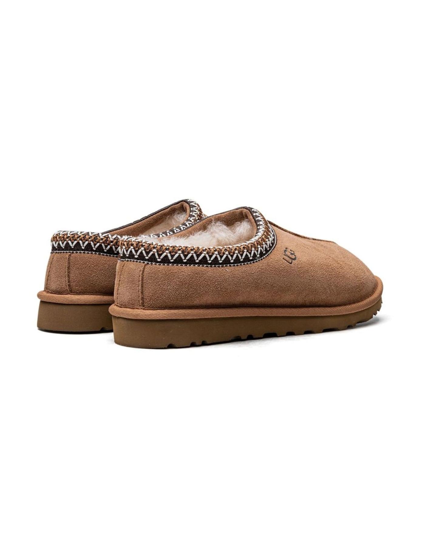 The Tasman slippers are a popular silhouette of the Australian brand UGG. This chestnut brown iteration is crafted from a supple suede outer, lined with a plush shearling interior that offers a warm and cosy sensation. Underfoot, a thick rubber sole allows for both outdoor and indoor use.