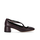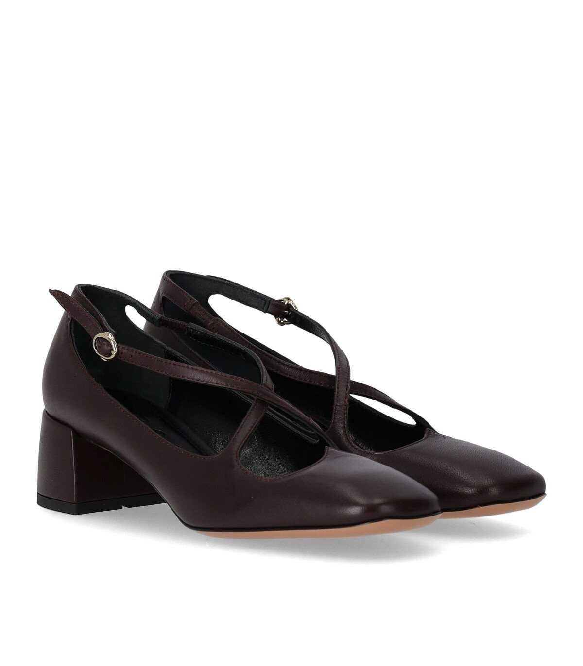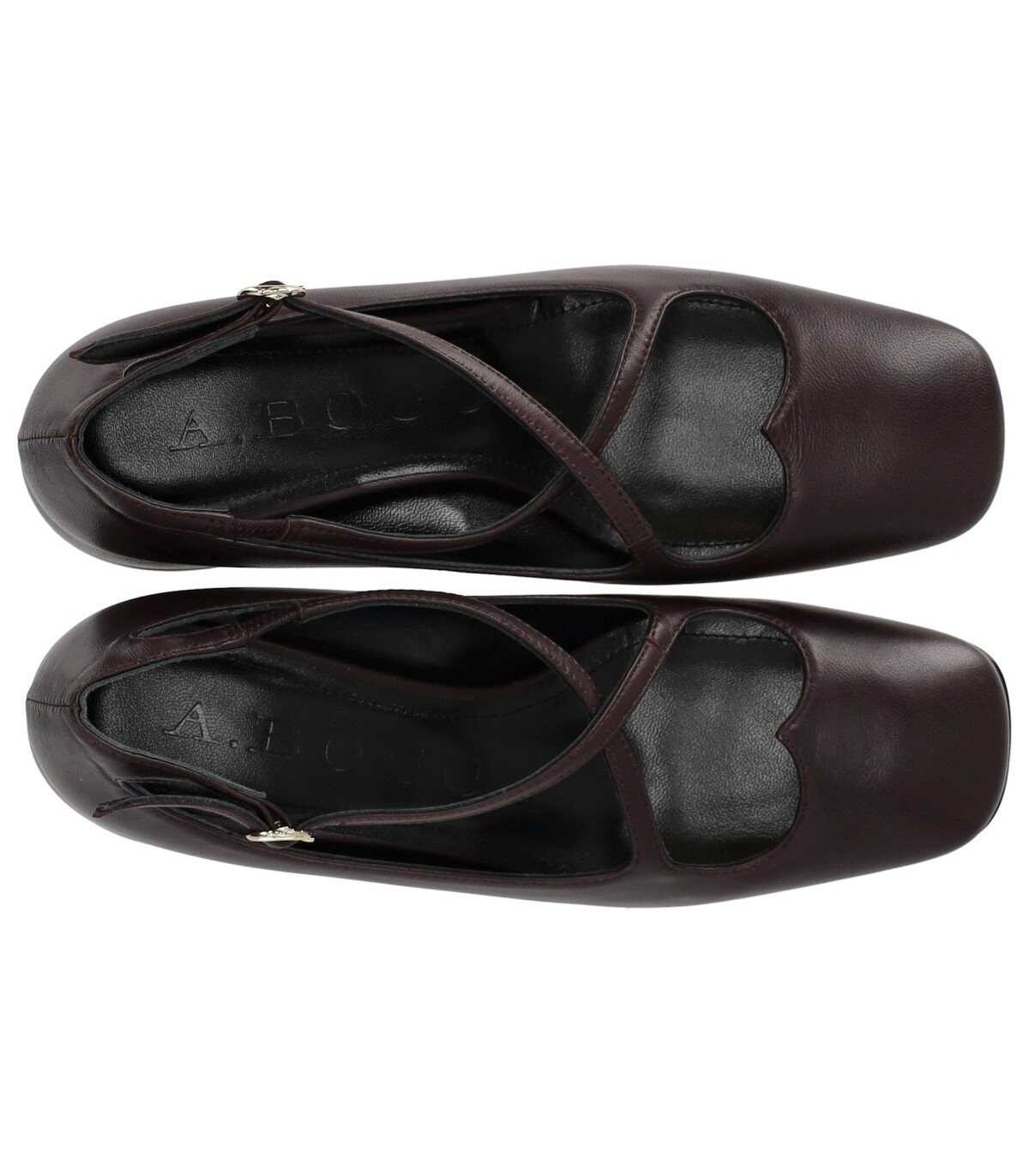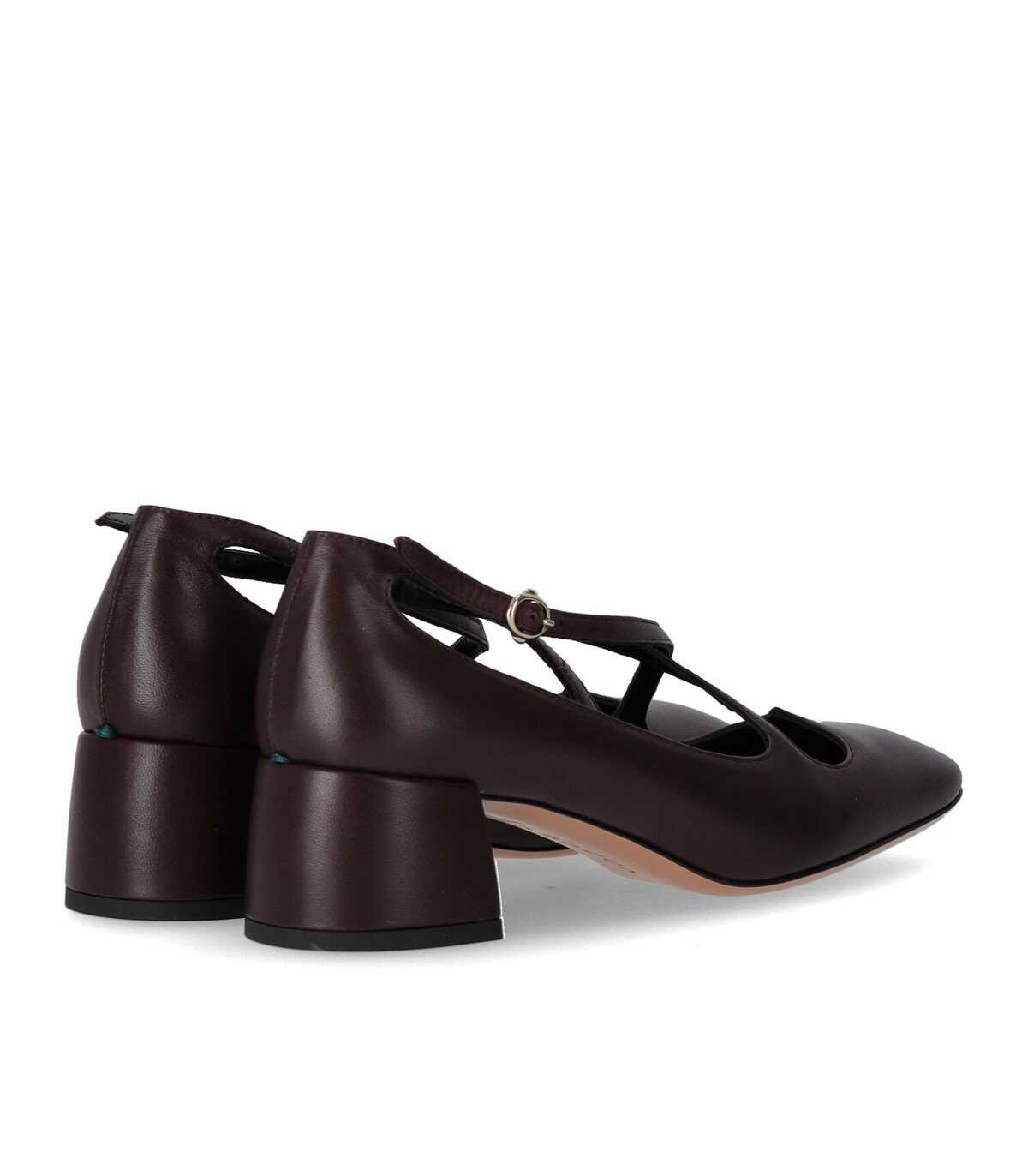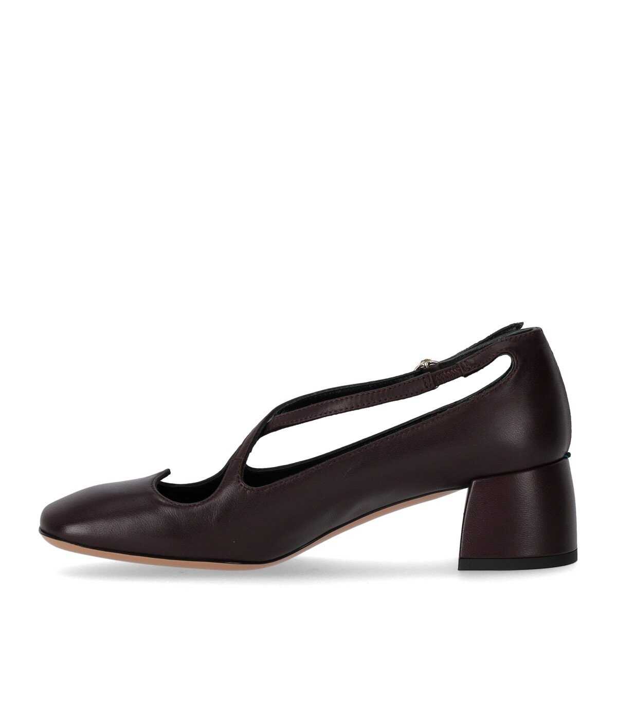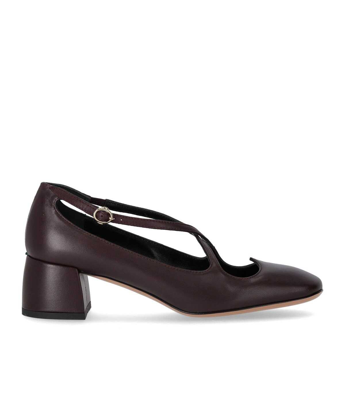 A.Bocca pump made of soft burgundy nappa, enhanced by a heart-shaped opening at the front. Slightly squared toe, leather interior, and ankle strap closure. Leather sole, heel height 5 cm.