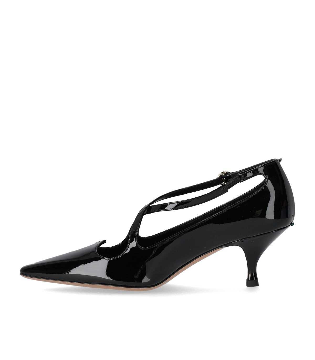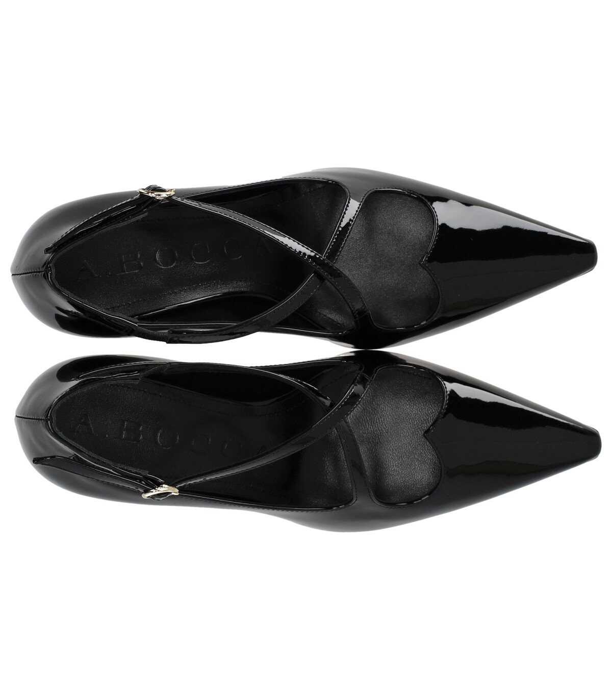 A.Bocca pump made of black patent leather, characterized by a pointed toe and a heart-shaped opening on the instep. Leather lining and ankle strap closure. Leather sole, low spool heel. Height 6.5 cm.