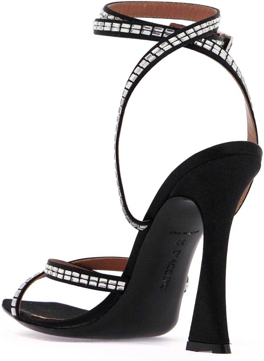 D'ACCORI Square Sandals made of satin and embellished with rhinestones applied on the straps, creating the classic cut-out design, and on the adjustable ankle strap. Leather insole, covered curved heel and leather sole.