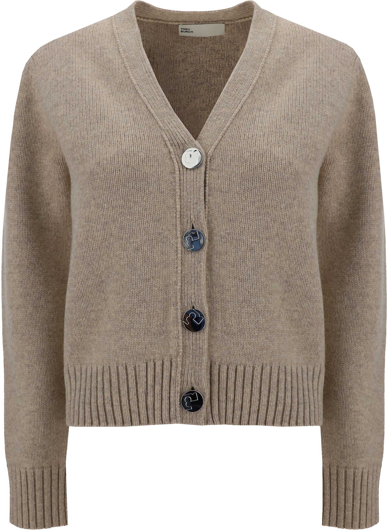 Wool Cardigan by Tory Burch featuring contrasting button front closure, ribbed cuffs, V-neck with ribbed trim, ribbed hem, mélange pattern, regular fit.