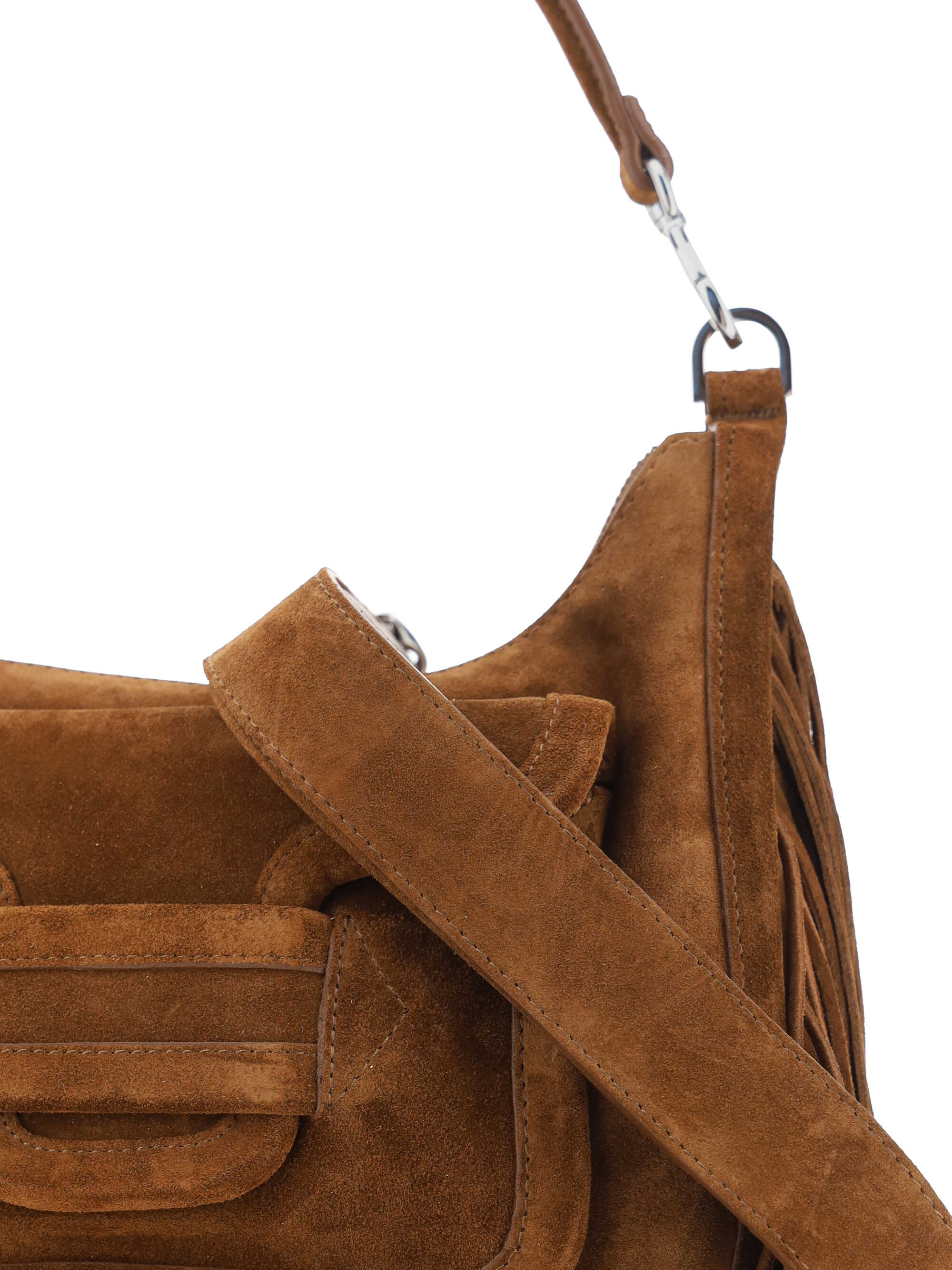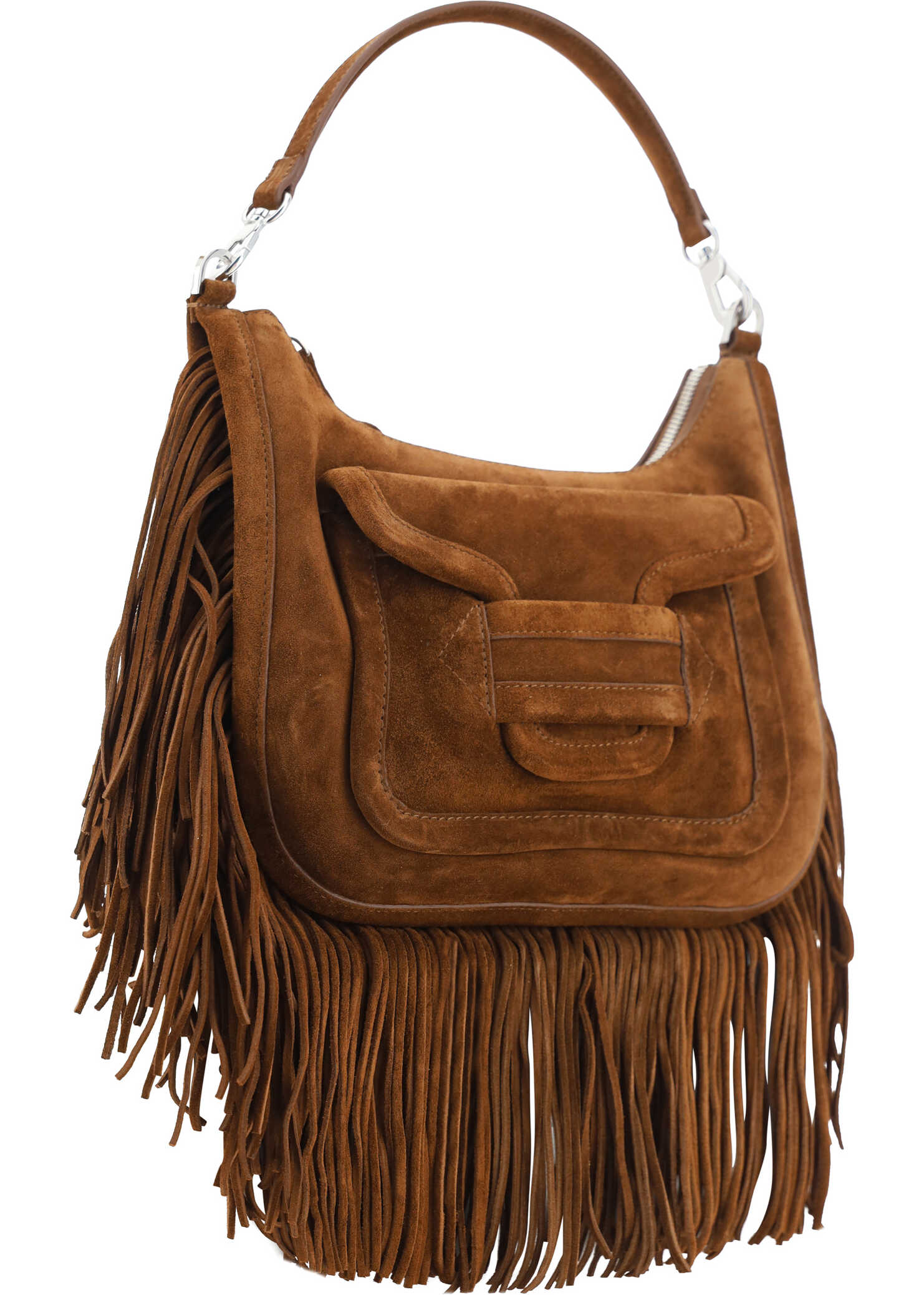 Calfskin Alpha Day Miss Texas Shoulder Bag from Pierre Hardy featuring a removable flat handle, a removable and adjustable shoulder strap, a top zipper closure, a flap patch pocket on the front with an interlocking closure, and a fringed bottom design.