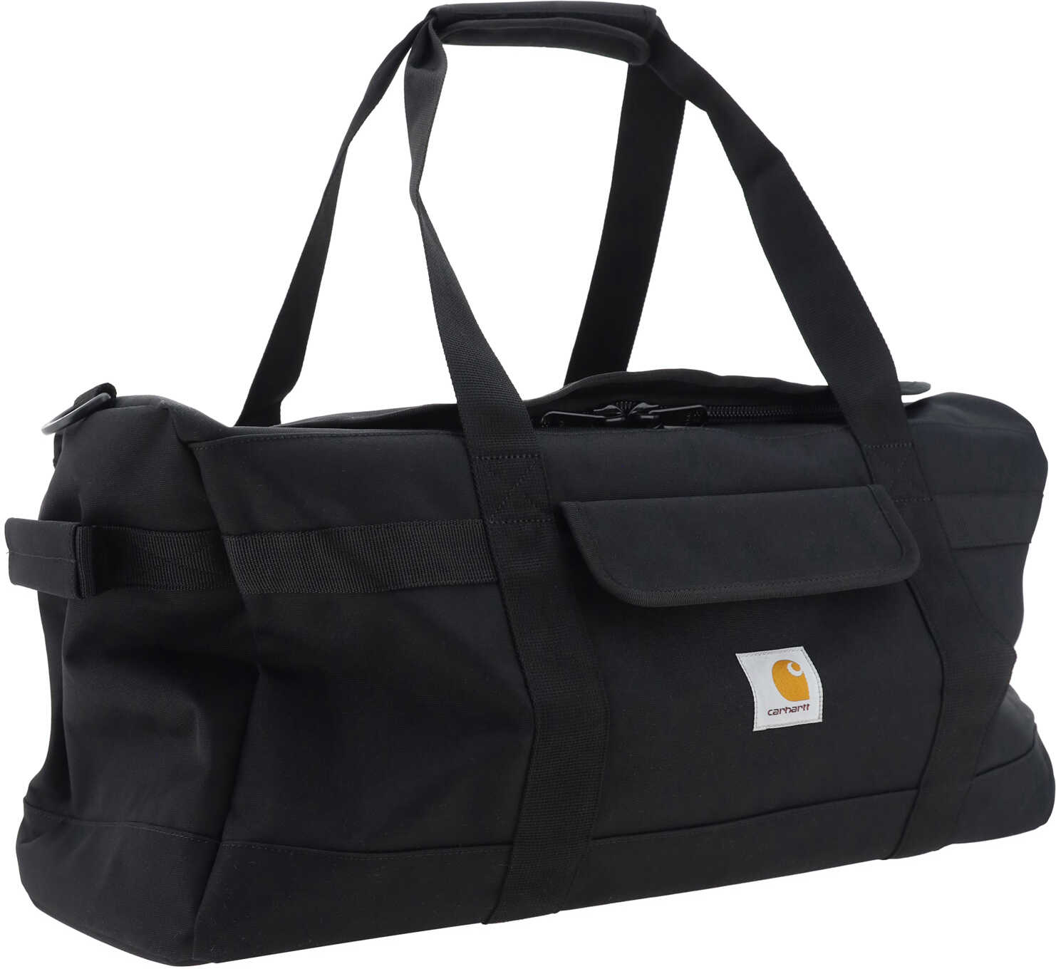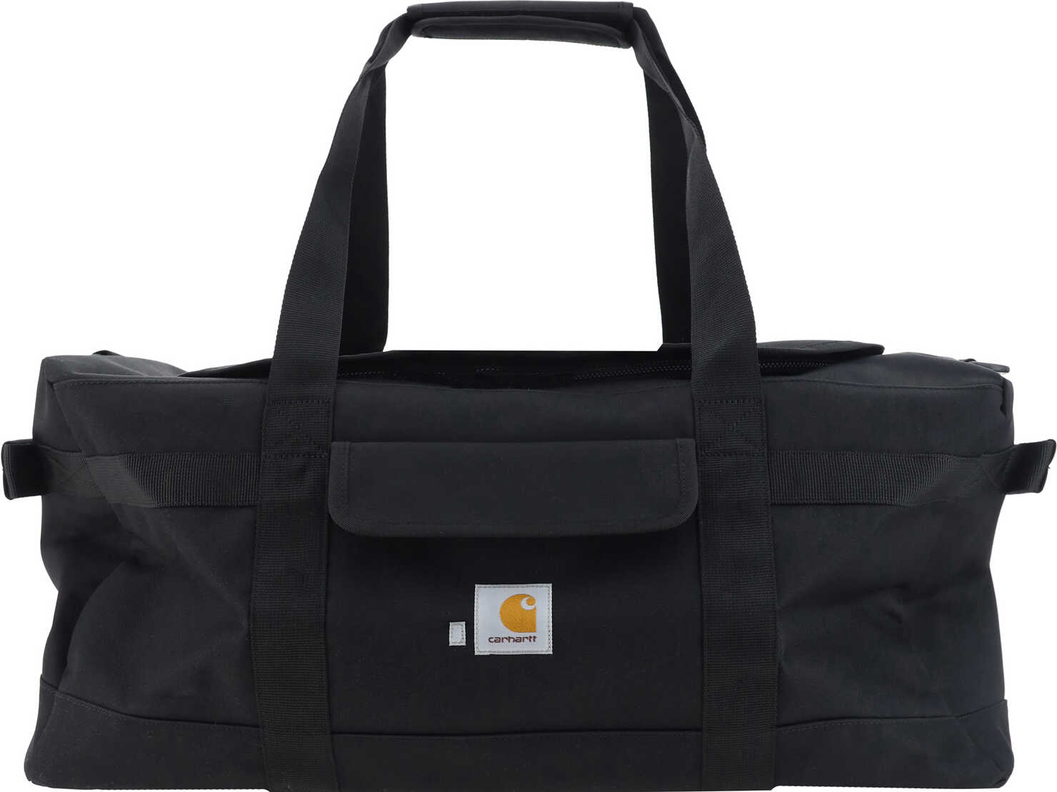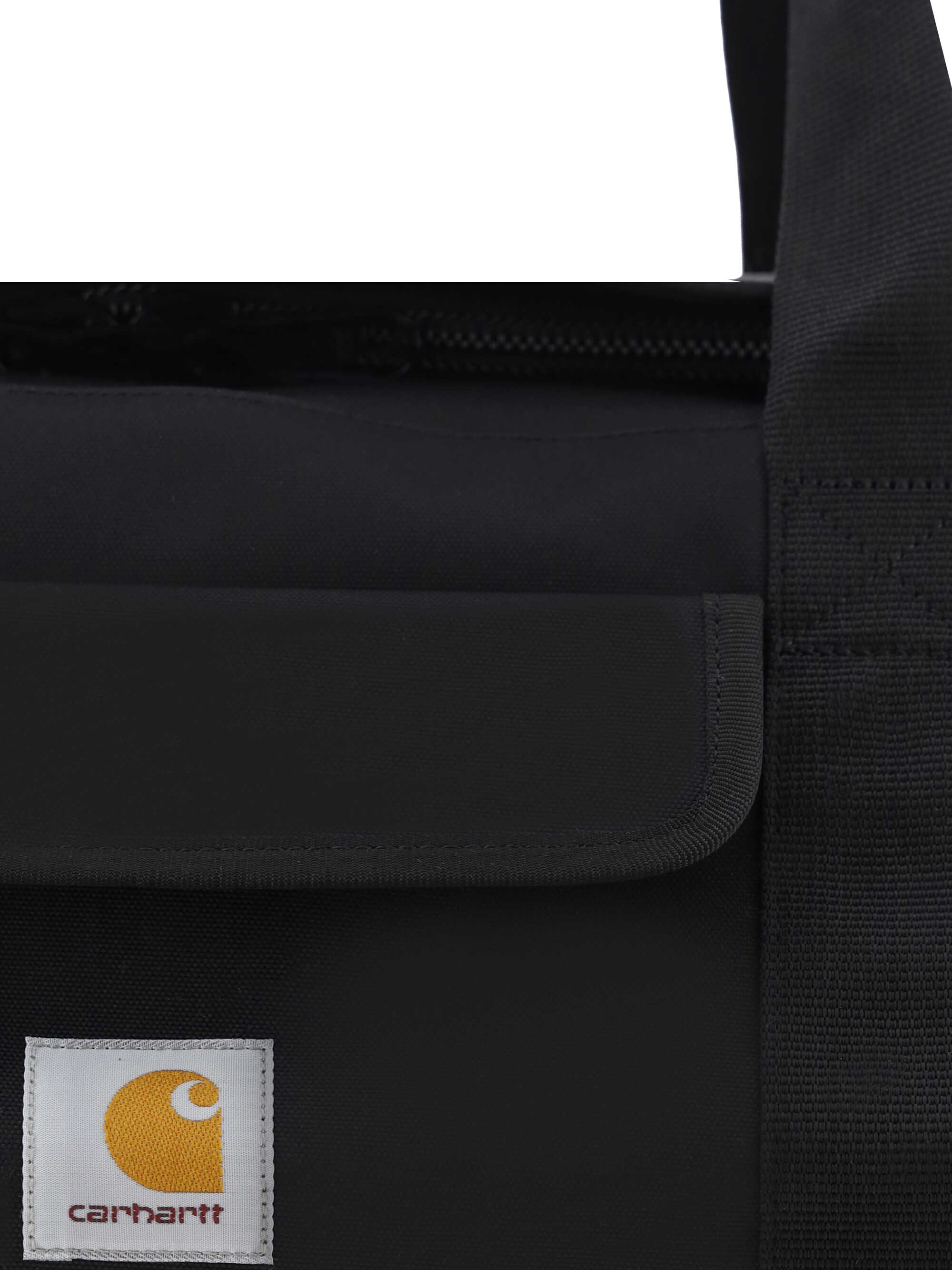Cotton Travel Bag by Carhartt Wip, two flat top handles, zipper closure at top, flap patch pocket with iconic brand monogram patch detail on front, adjustable and removable shoulder strap, single interior compartment.