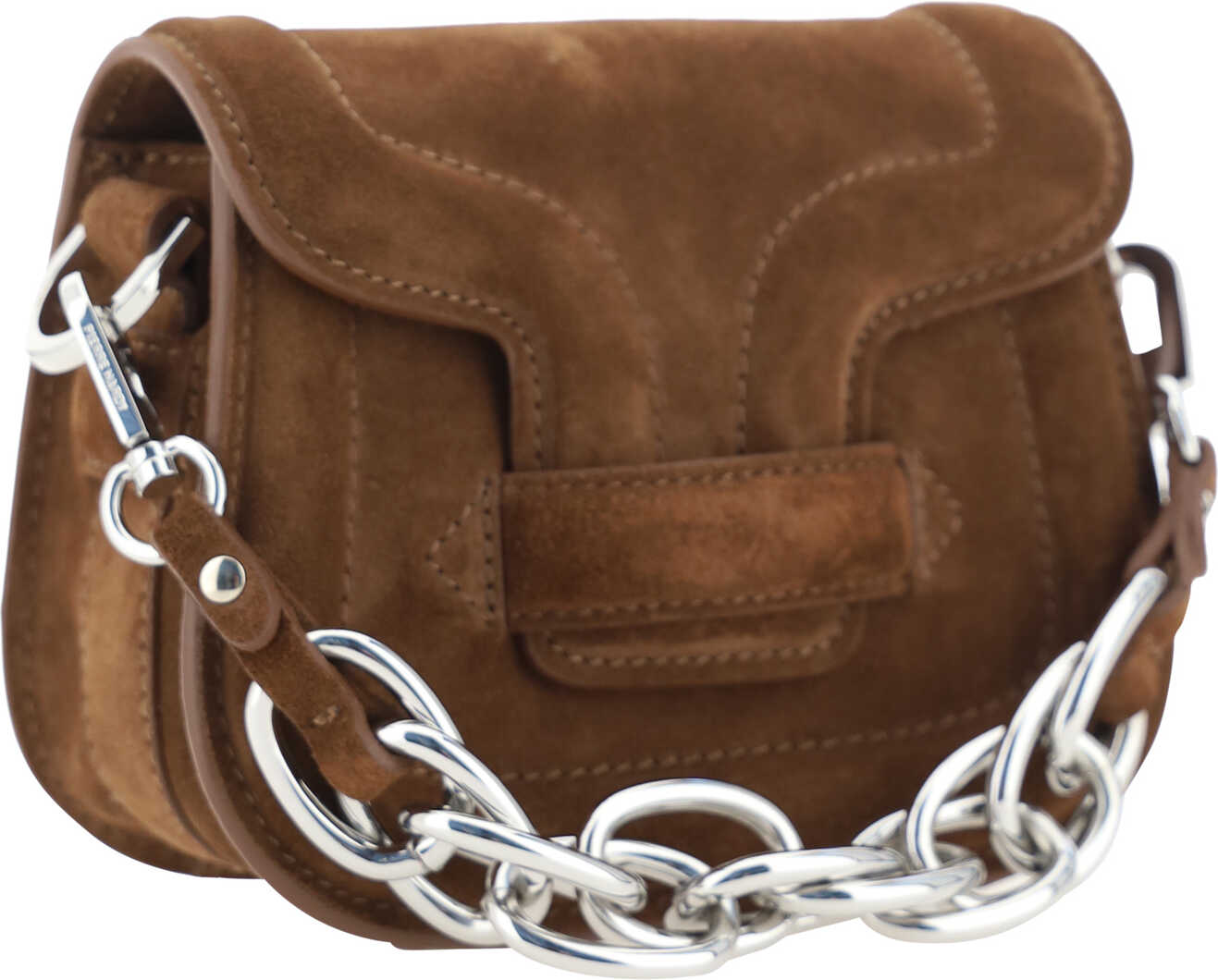 Calfskin Alphaville Handbag by Pierre Hardy, handle on top with matching chain, front pocket with interlocking flap, back slit pocket, adjustable and removable flat shoulder strap, magnetic button closure, interior compartment with two slit pockets.