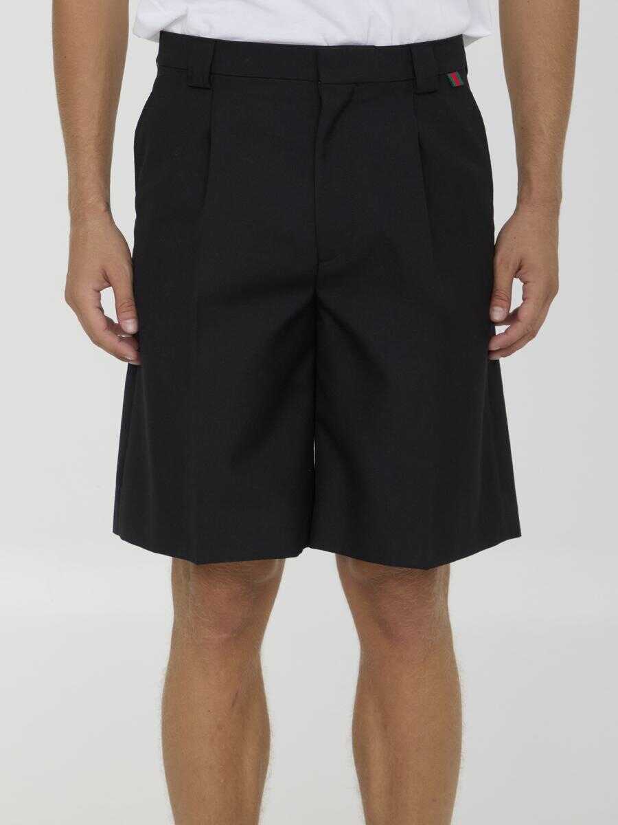 Bermuda shorts in black wool blend with green and red Web loop tab on the front. It features zip, button and hook-and-eye closure, two side welt pockets, two rear welt pockets and belt loops. Regular fit.