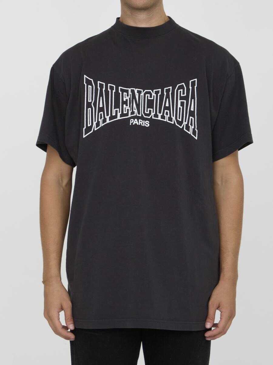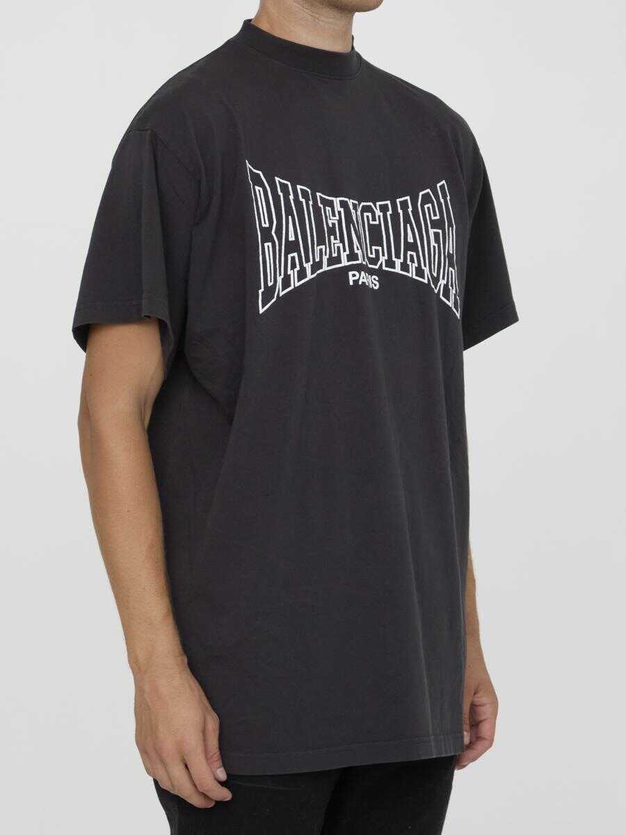 Short-sleeved crewneck t-shirt in black cotton with craquelé-effect Balenciaga Paris motif printed on the front. Ribbed collar. Oversized fit.