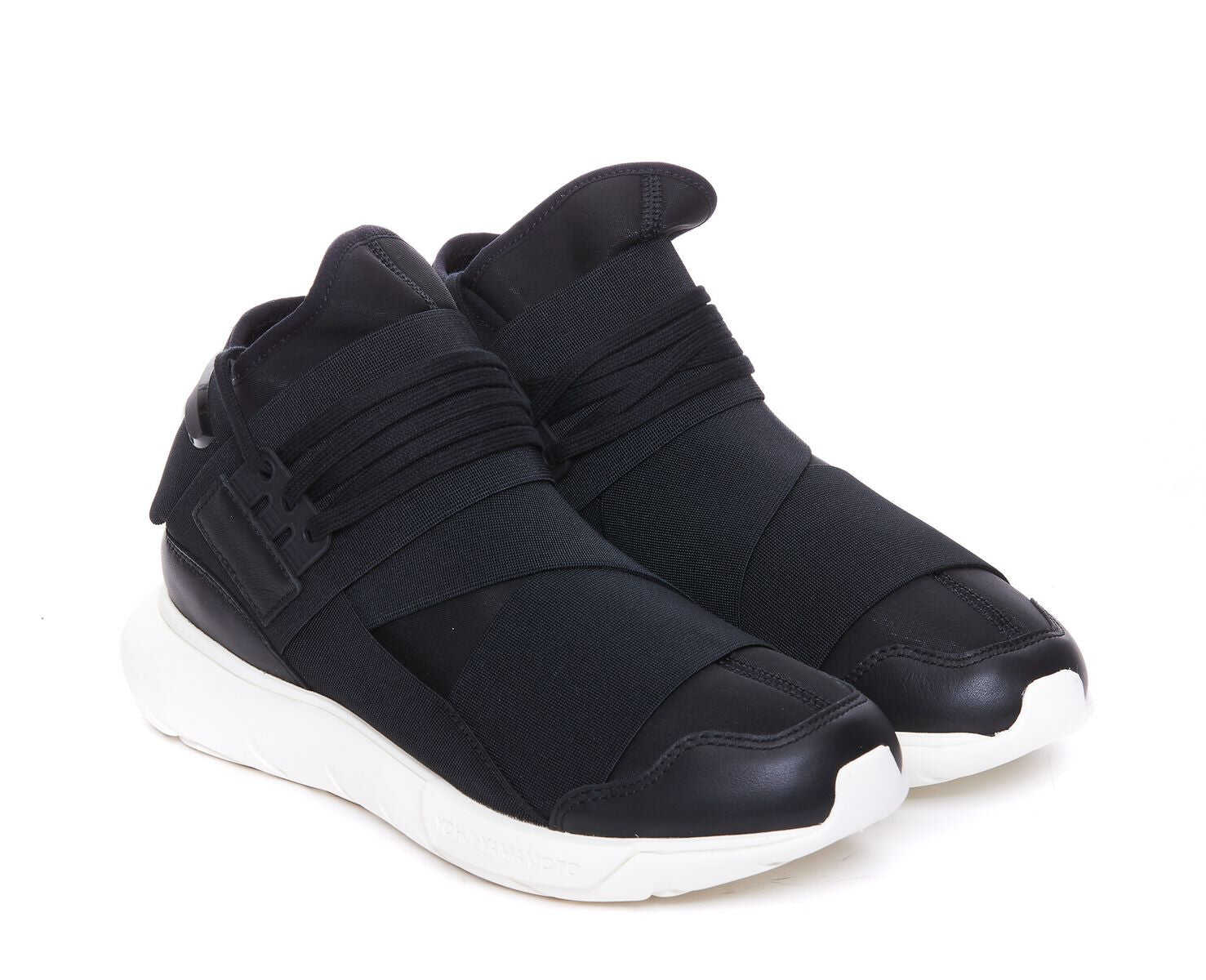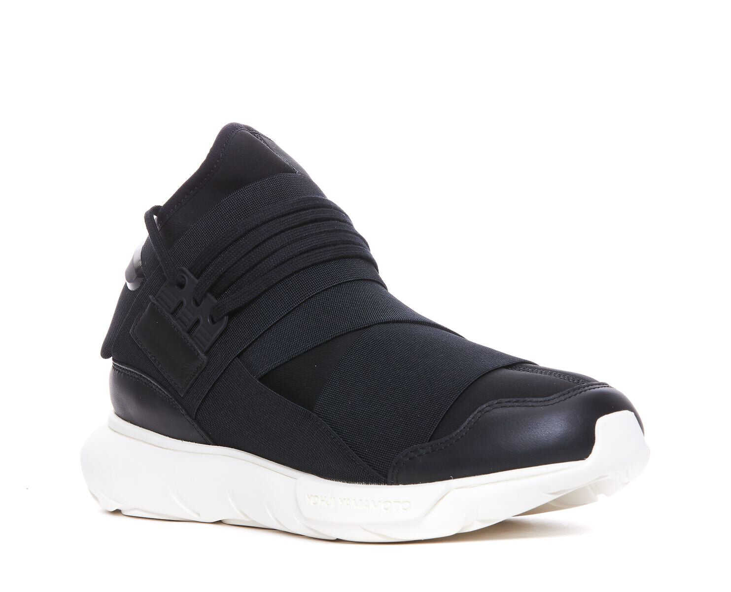 Sneakers Y-3 "Qasa" made of Black fabric upper. Elastic mesh. Leather inserts. Round tip. Laced. Tone-on-tone laces. Tone-on-tone "Y-3" logo on the back. Elasticated bands. Heel with suede lining. Cream contrasting tubular rubber sole. Logo with "Yohji Yamamoto" writing. Lining