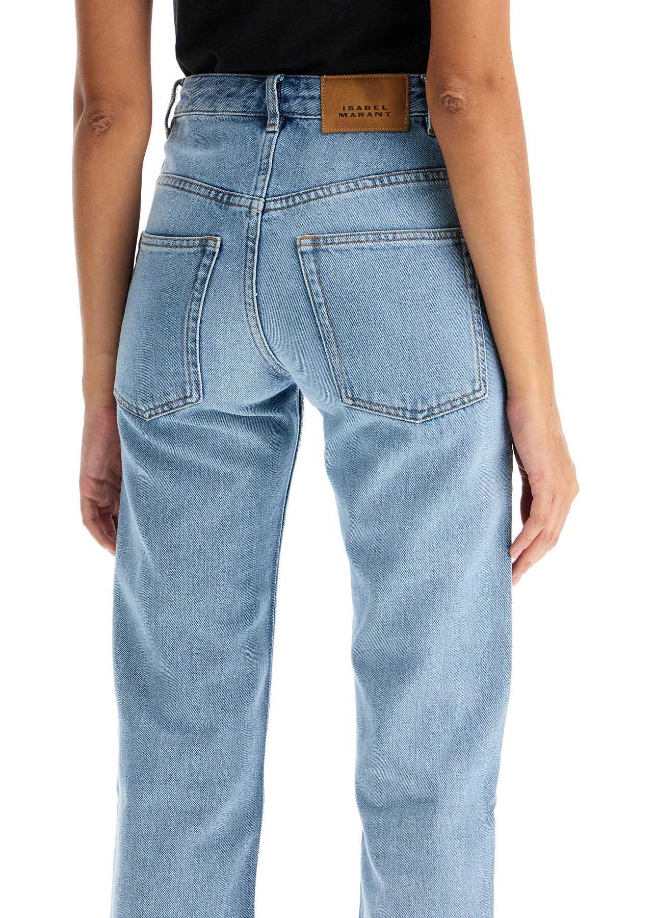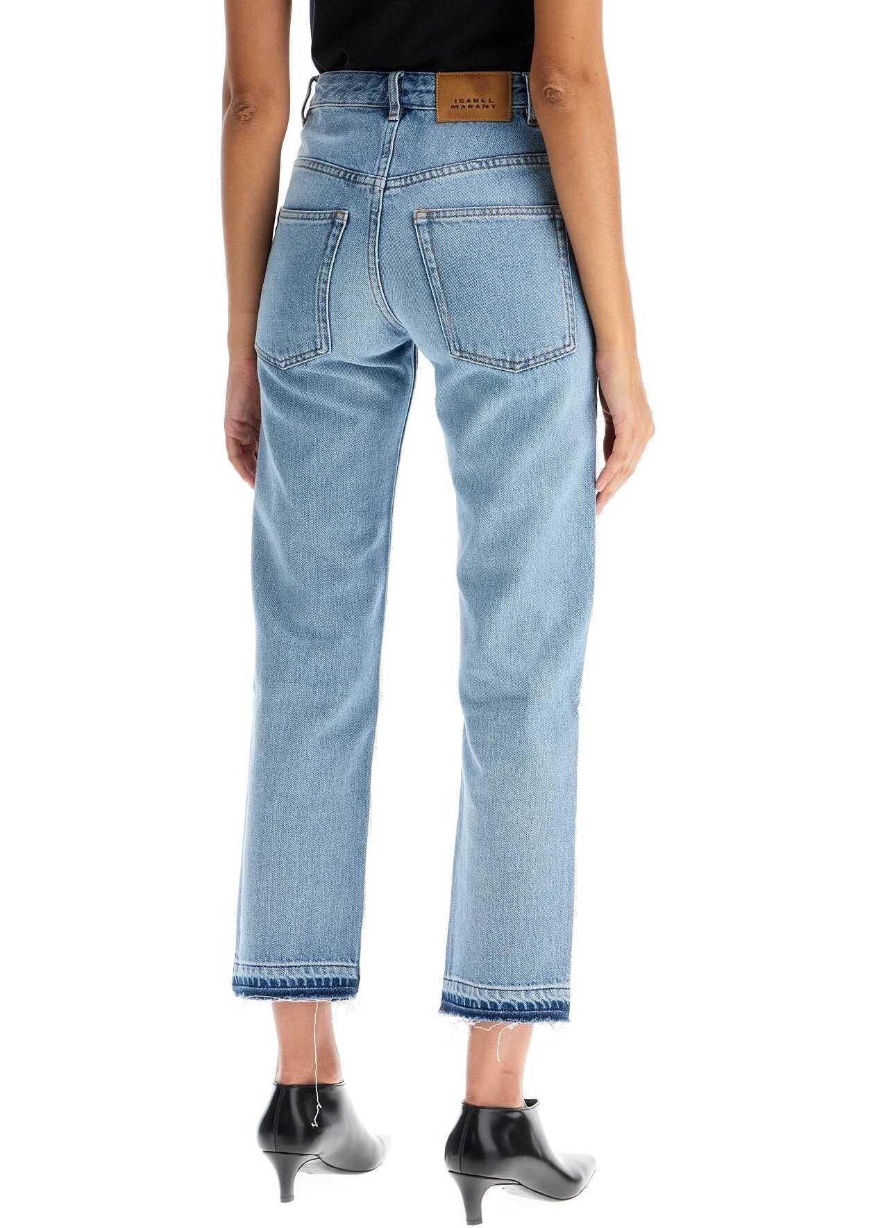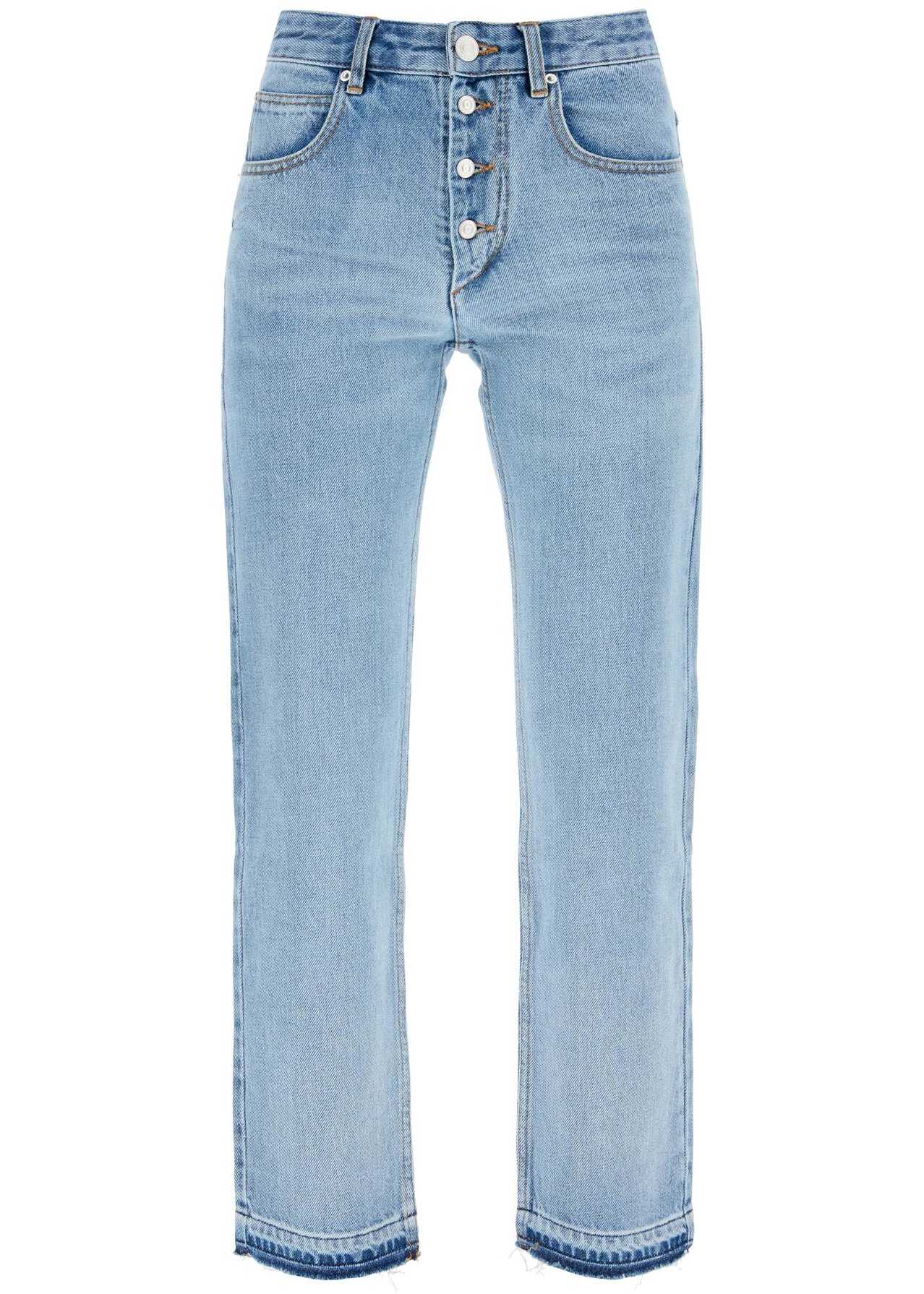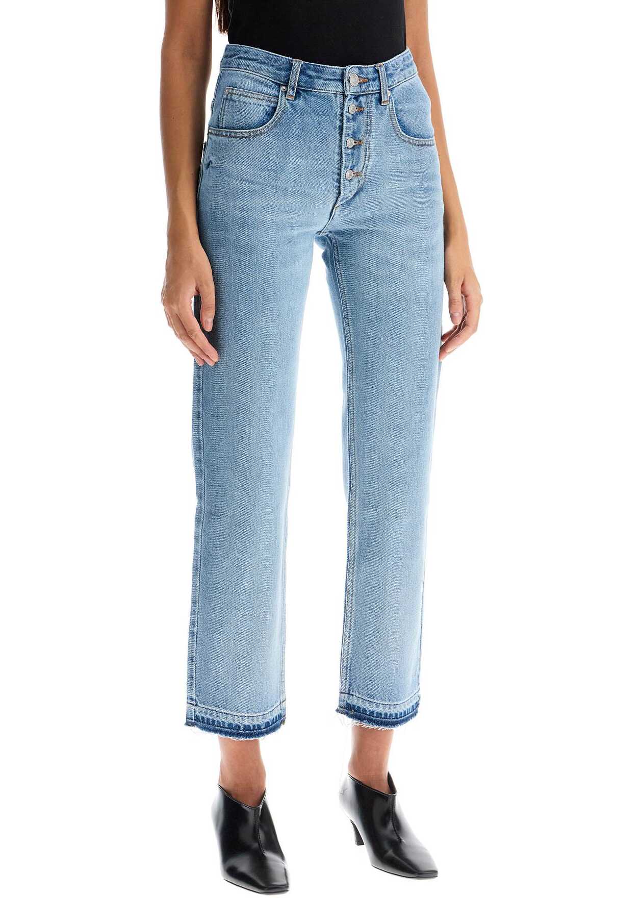 The Jemina cropped jeans by Isabel Marant are made of cotton denim and feature a button closure, raw cut and frayed hems. They have a high waist and slim fit with five pockets. The model is 177 cm tall and wears size FR 34.