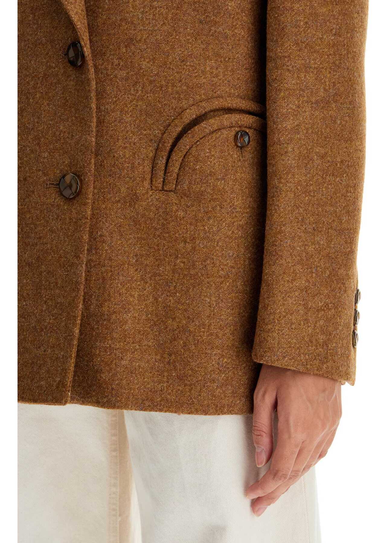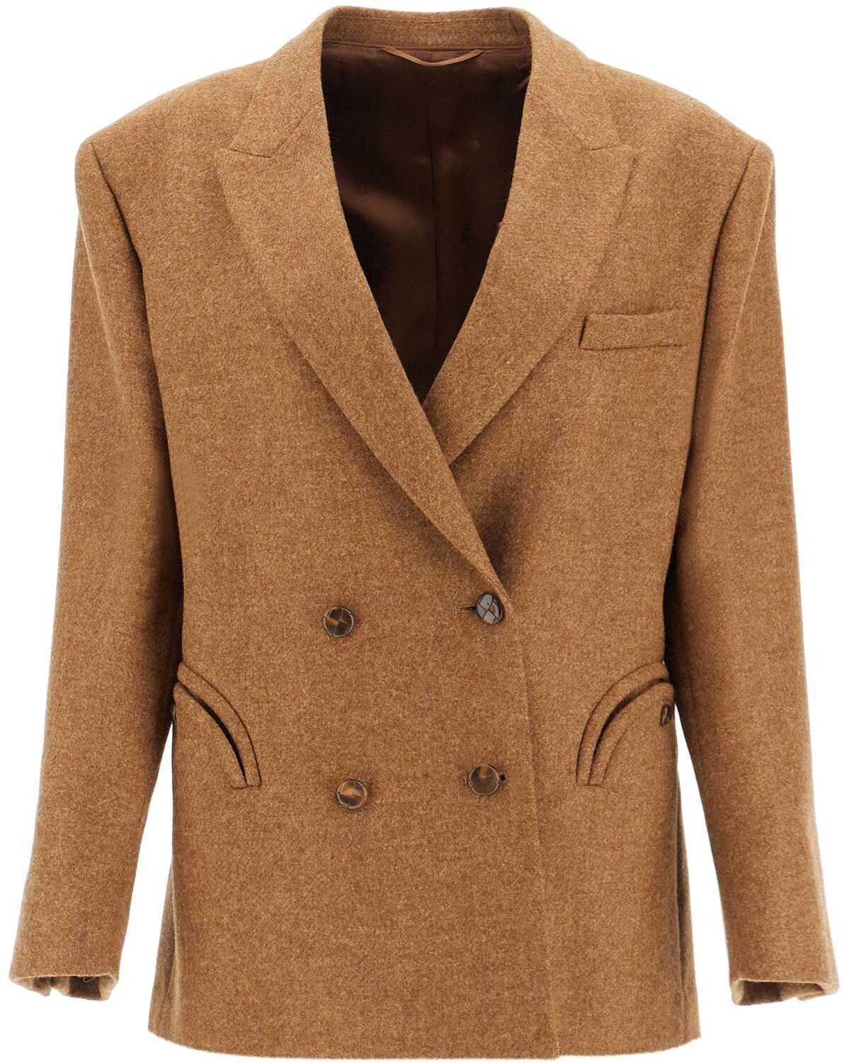 The Awatea Nightbreak double-breasted blazer by Blazé Milano is made of wool and features a boxy design with dropped shoulders. It has peak lapels, classic Smiley pockets, and is fully lined with two additional welt pockets. The model is 177 cm tall and wears size 0 from Blazé Milano.