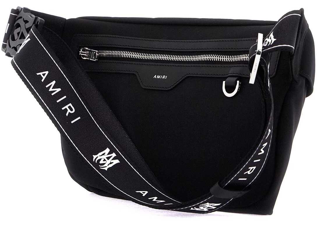The Amiri Marsupio is made of technical gabardine and features a contrasting Arts District print on the front. It has a hidden zip closure with two pulls, a nylon-lined interior, an additional back pocket with a zip, a D-ring on the back, and an adjustable Monogram tonal ribbon belt with buckle. The hardware is silver-finished metal.