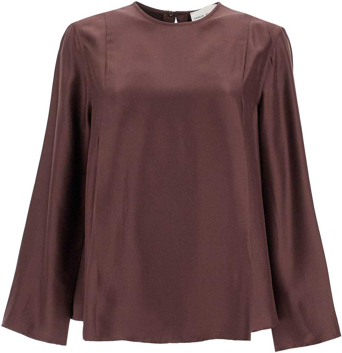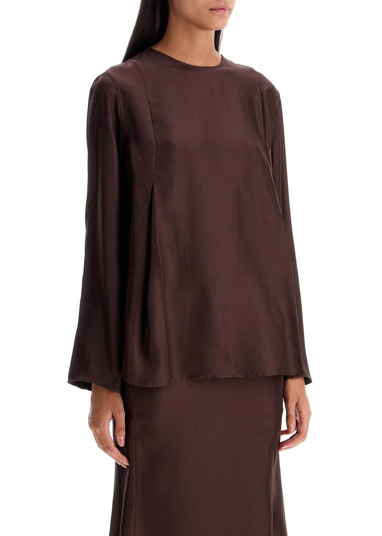 The Loulou Studio round neck blouse is made of pure silk twill with long sleeves and no cuffs. It stands out for its loose fit highlighted by pleats on the front and back. The closure is a hidden button at the back of the neck. The model is 177 cm tall and wears size XS.