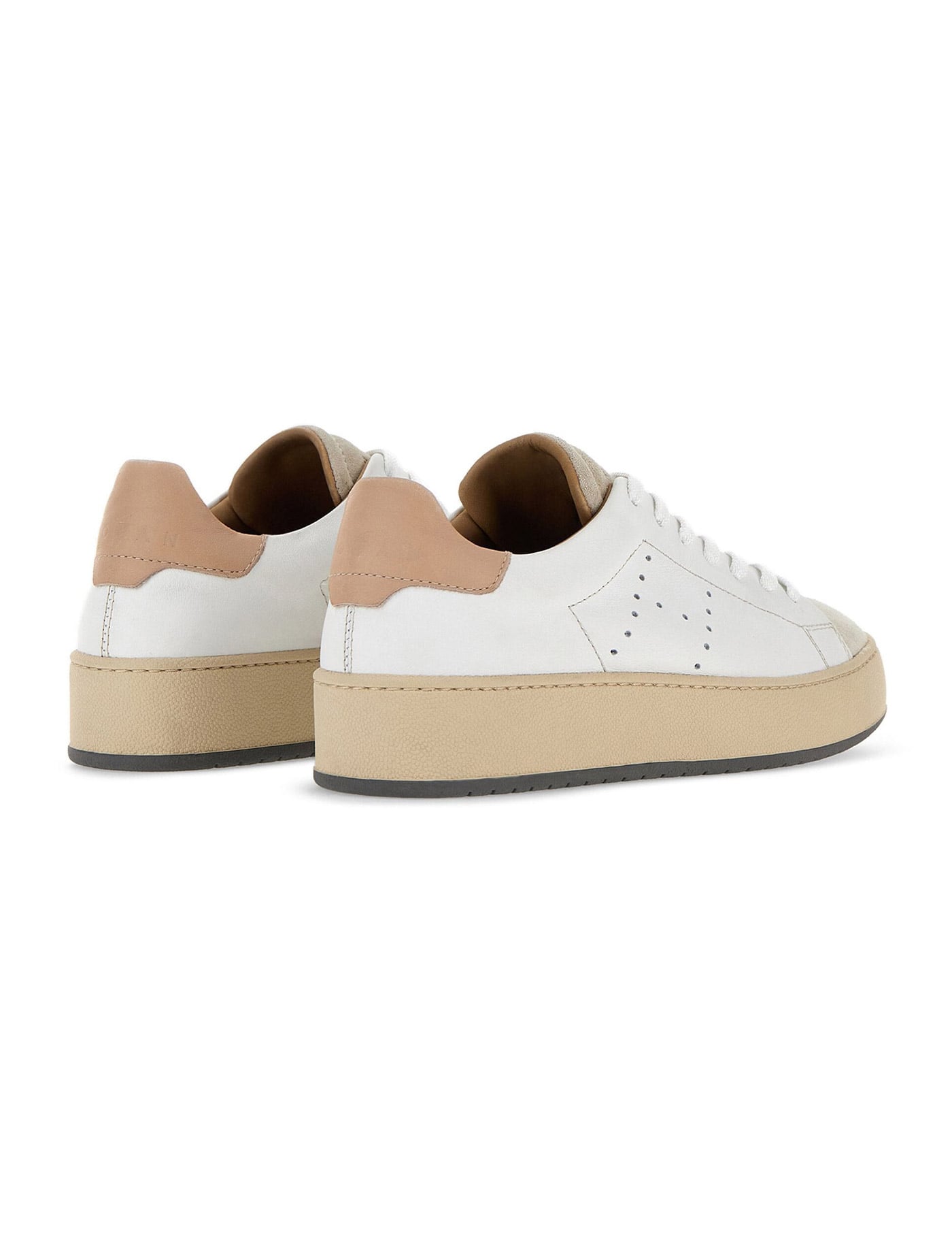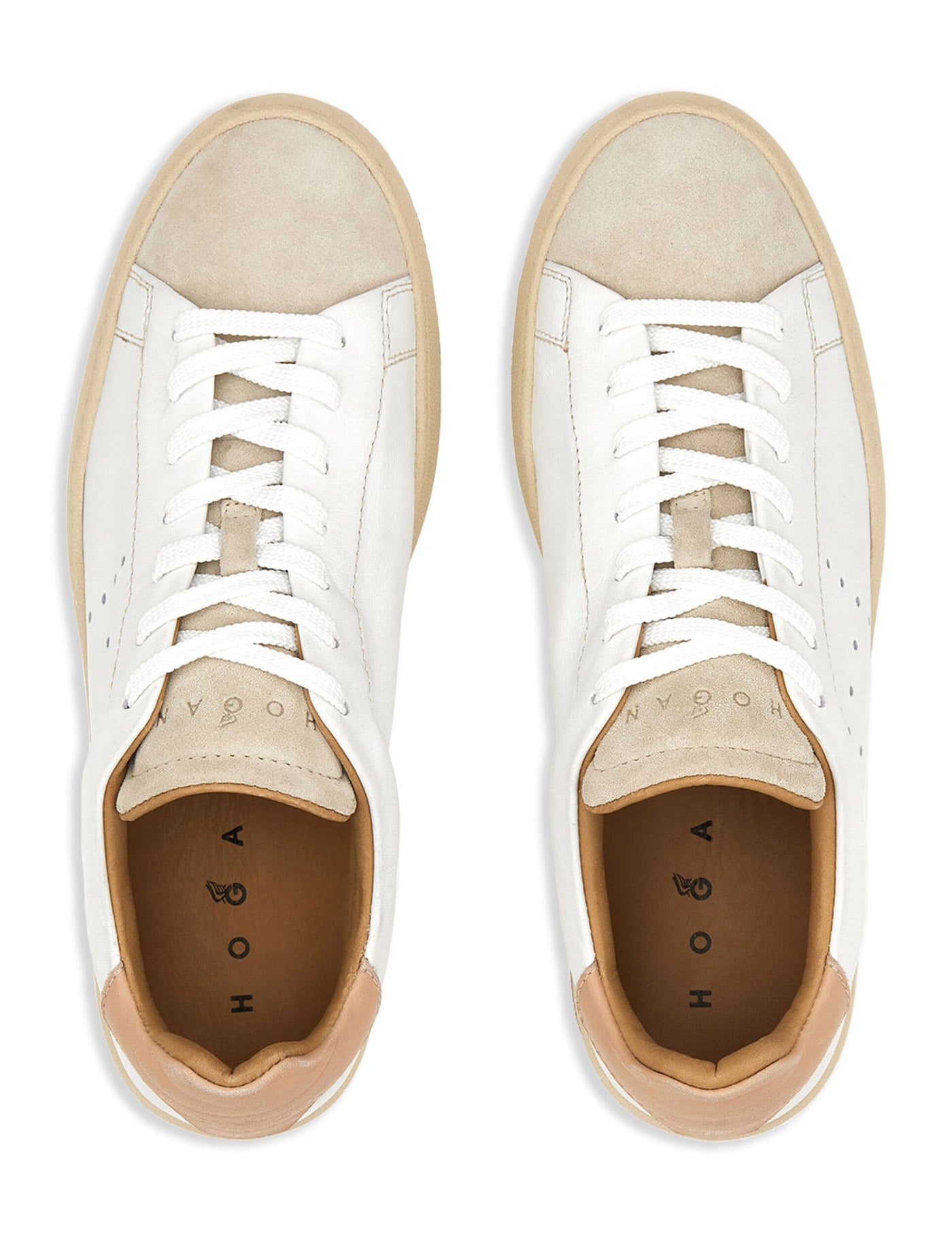 white/beige calf leather panelled design suede panels perforated detailing logo-debossed tongue contrasting heel counter round toe front lace-up fastening branded insole flat rubber sole