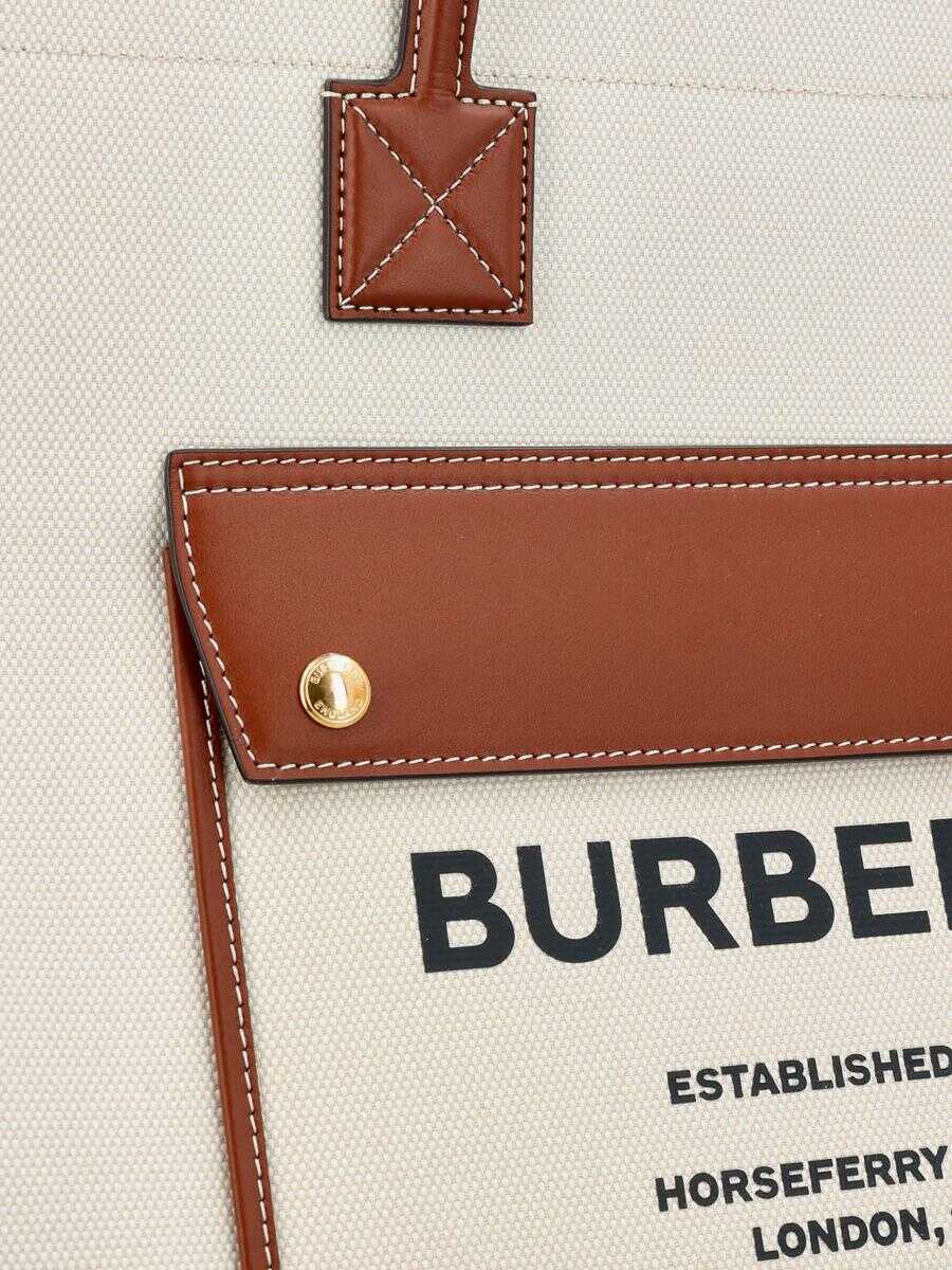- Material: 100% cotton - Color: beige and brown - Leather trim - Other details: Burberry lettering on front - Snap button closure - 2 leather handles - Made in Italy - Dust bag - Item number: 8044129A1395