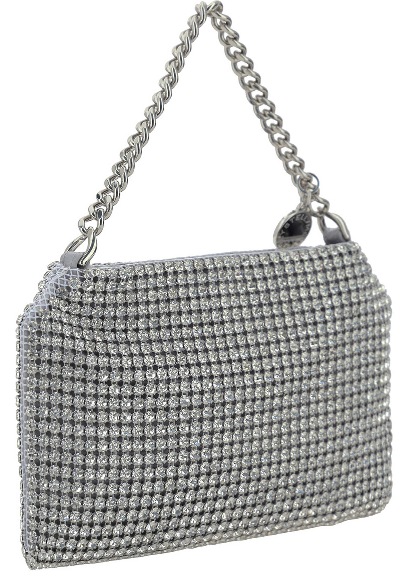 Falabella Shoulder Bag by Stella McCartney, double chain shoulder strap, top zipper closure, design made with shiny crystal decoration, silk satin interior lining.