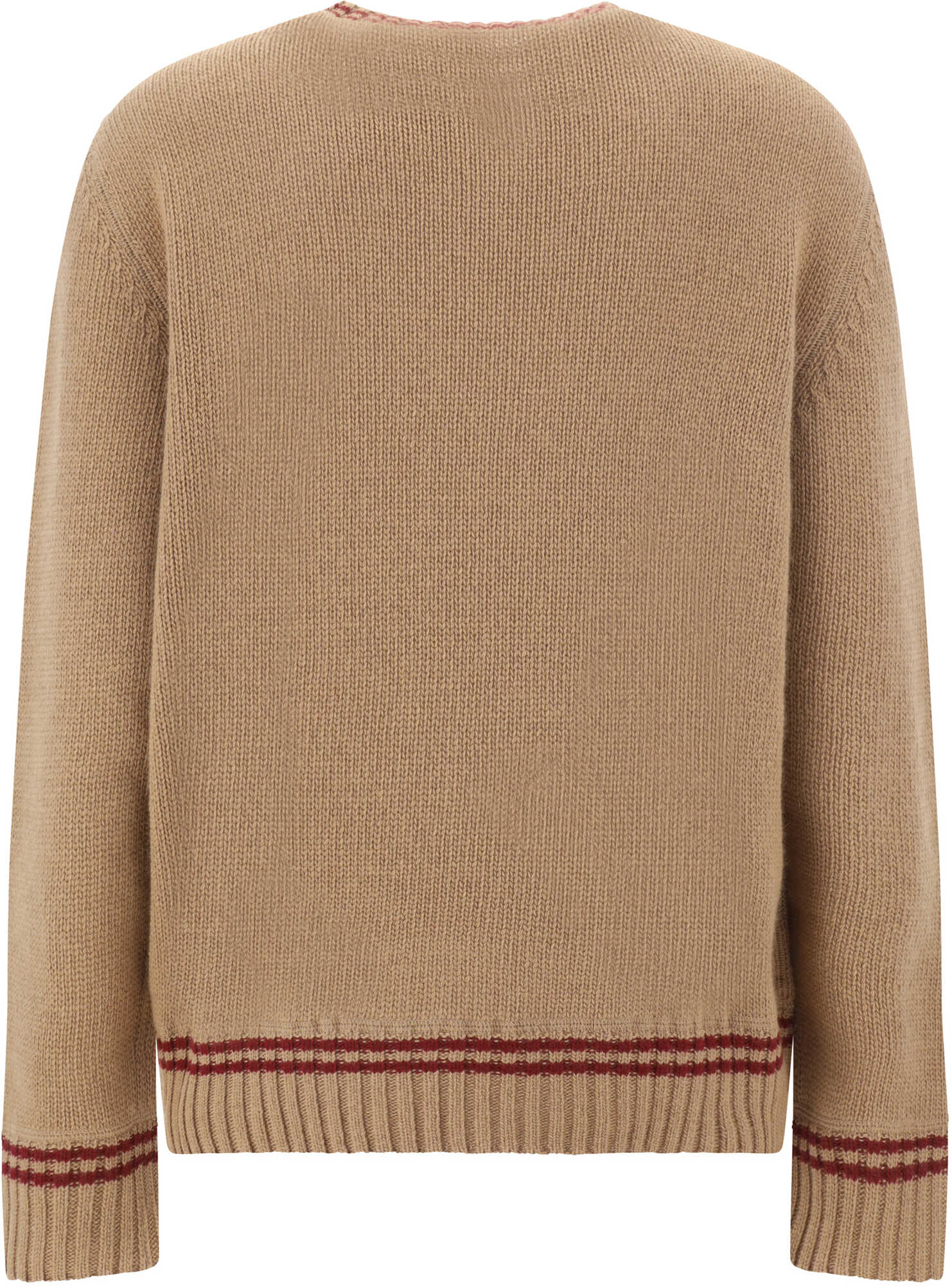 Cotton Sweater by Prada, ribbed crew neck, contrasting embroidered ribbed hem, contrasting embroidered ribbed cuffs, monochrome pattern, regular fit, iconic brand signature embroidered on front.