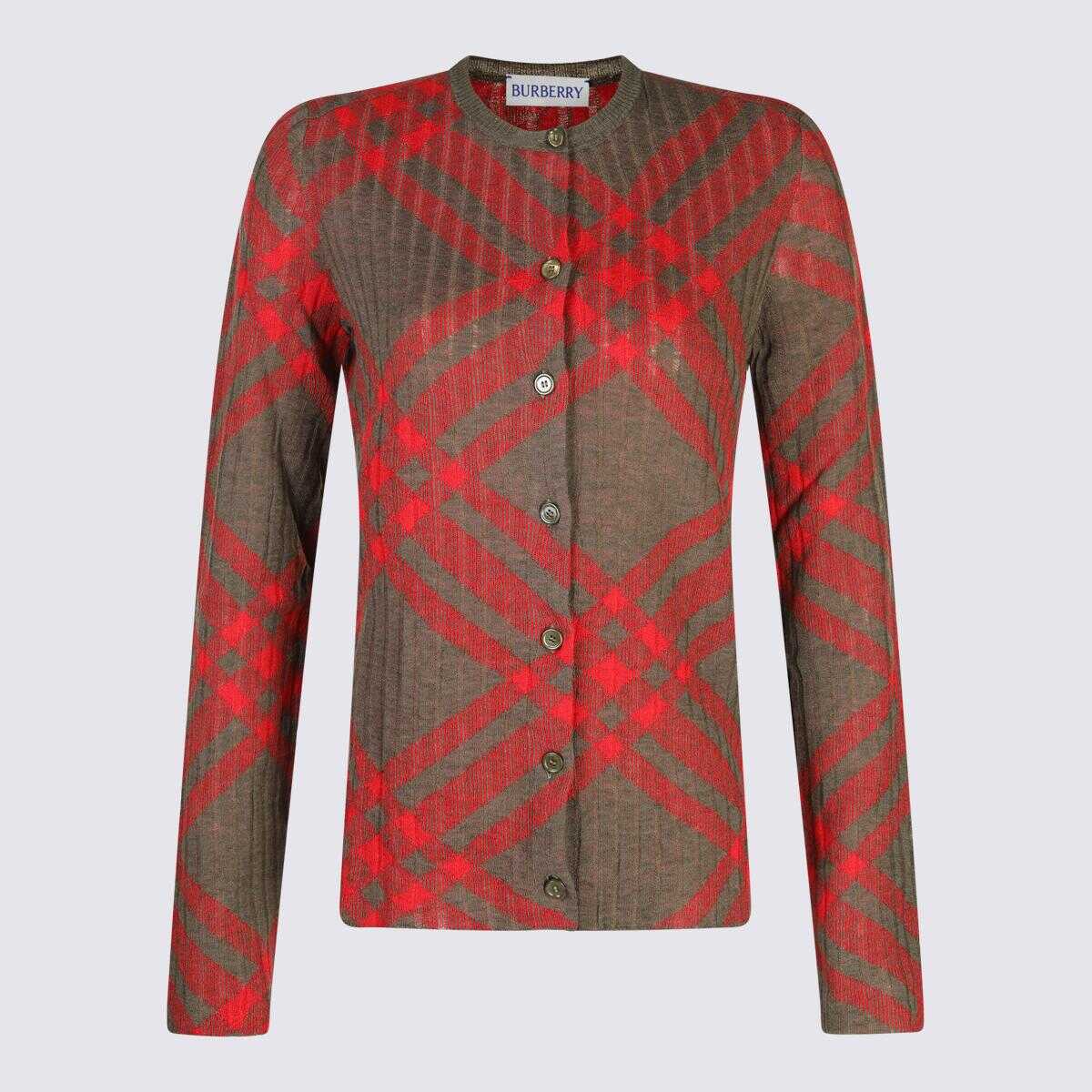 Brown and red knitwear from Burberry featuring long sleeves, round collar, buttons fastening, all over check motif and regular vestibility.