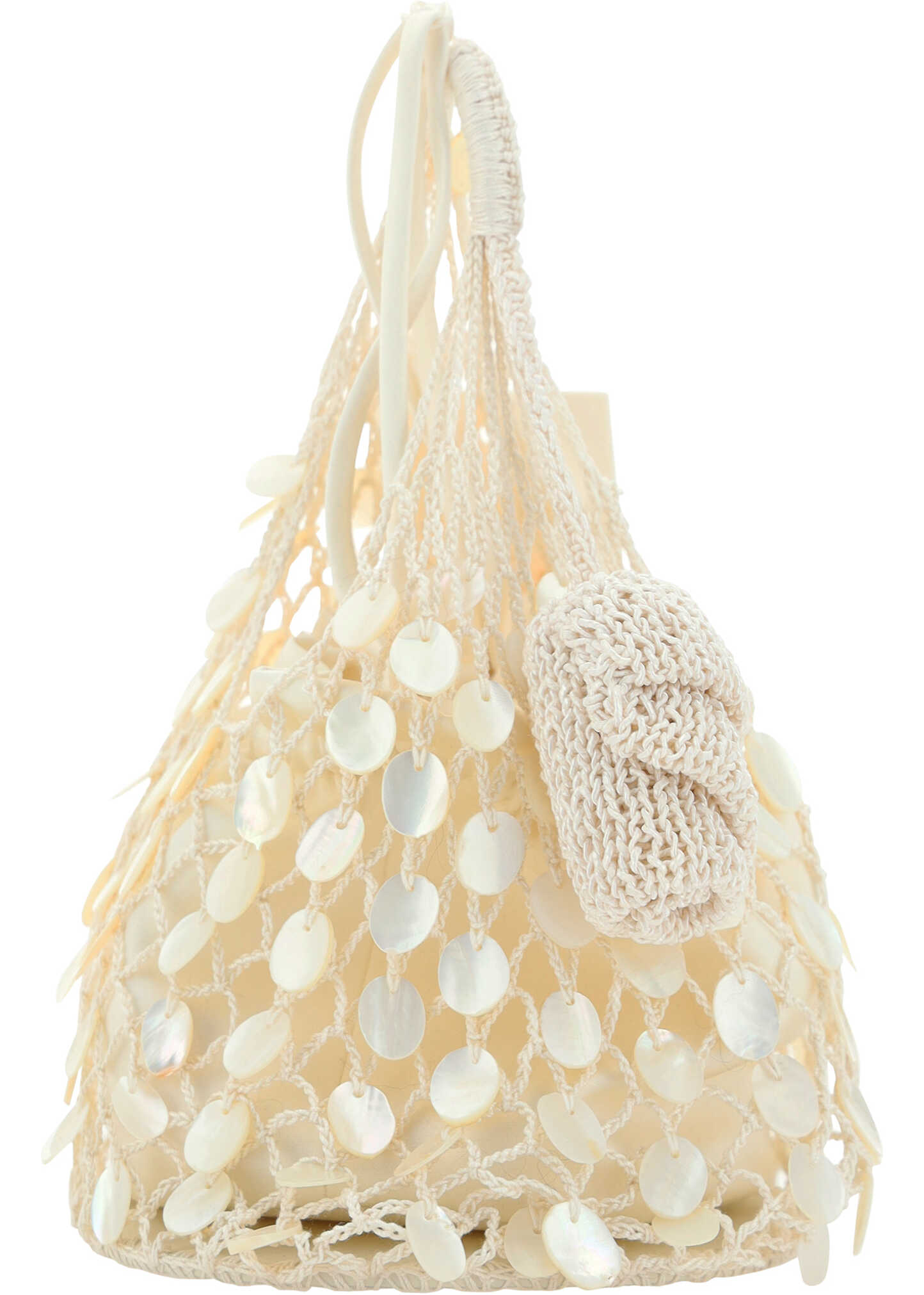Small Devana Handbag by Magda Butrym, crocheted in a wide net with natural fibers, mother-of-pearl and a crochet-effect flower adorn the exterior design.