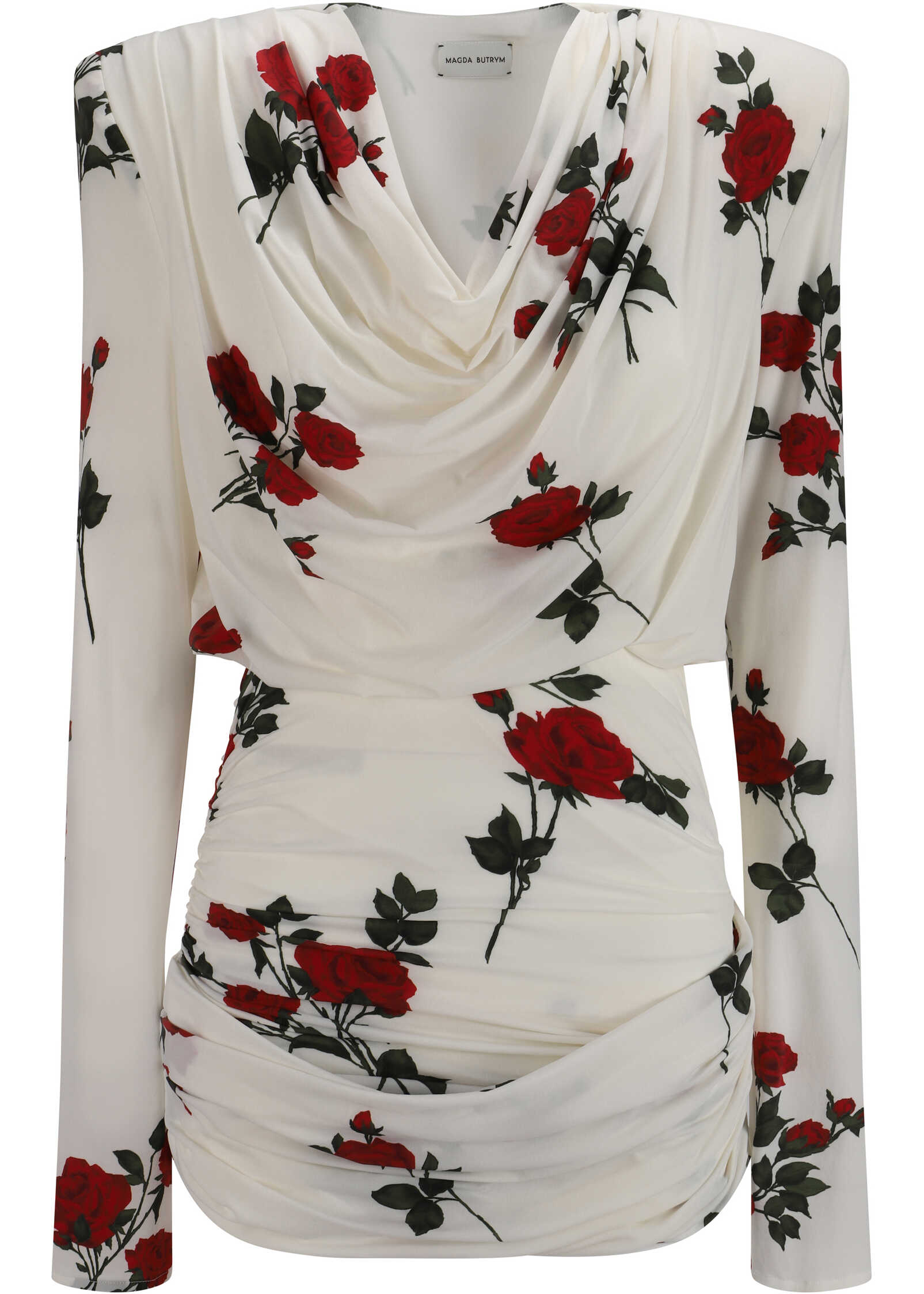 Dress by Magda Butrym, long-sleeved mini style, ruched ruffle effect details on side panels, soft front neckline, all-over repeated floral print.