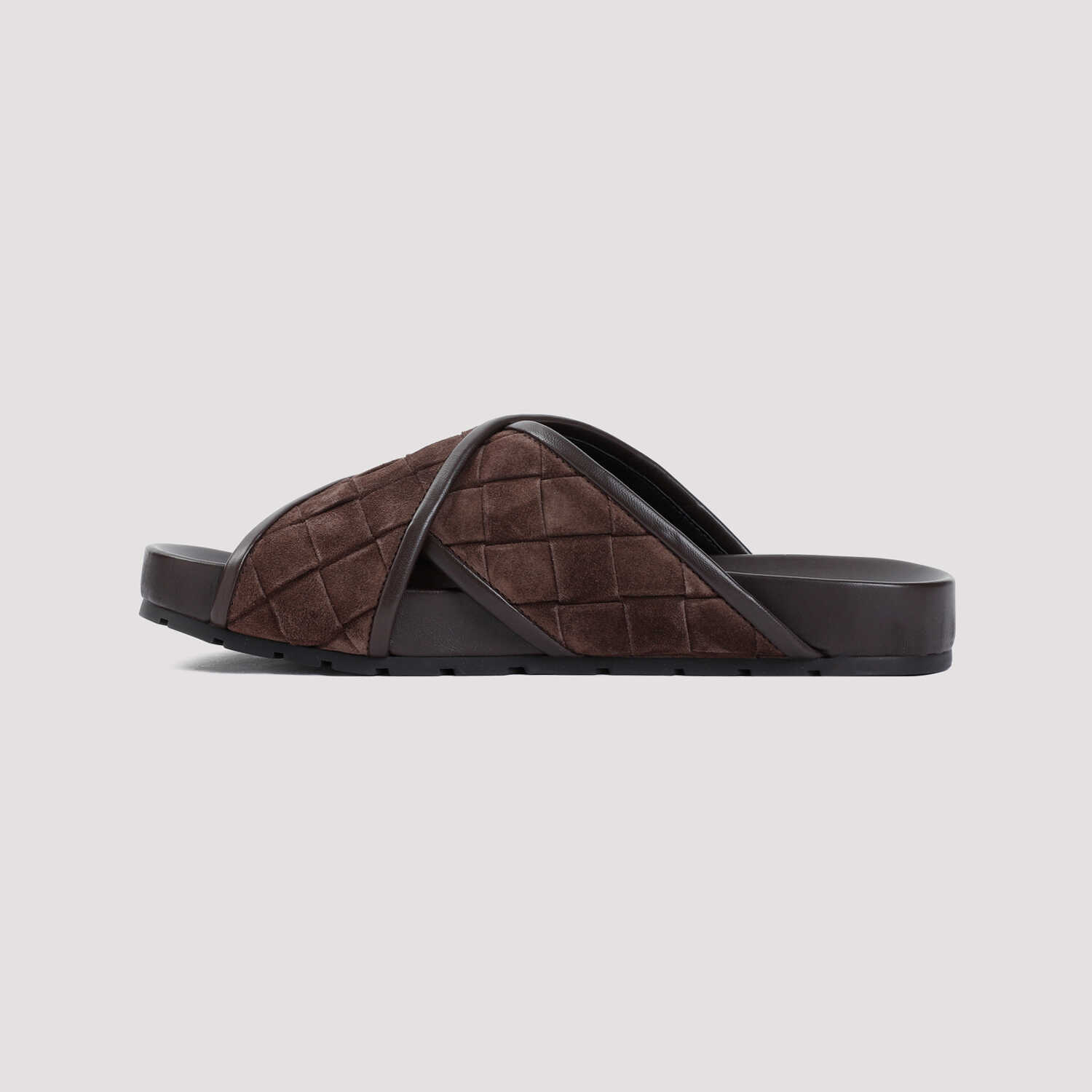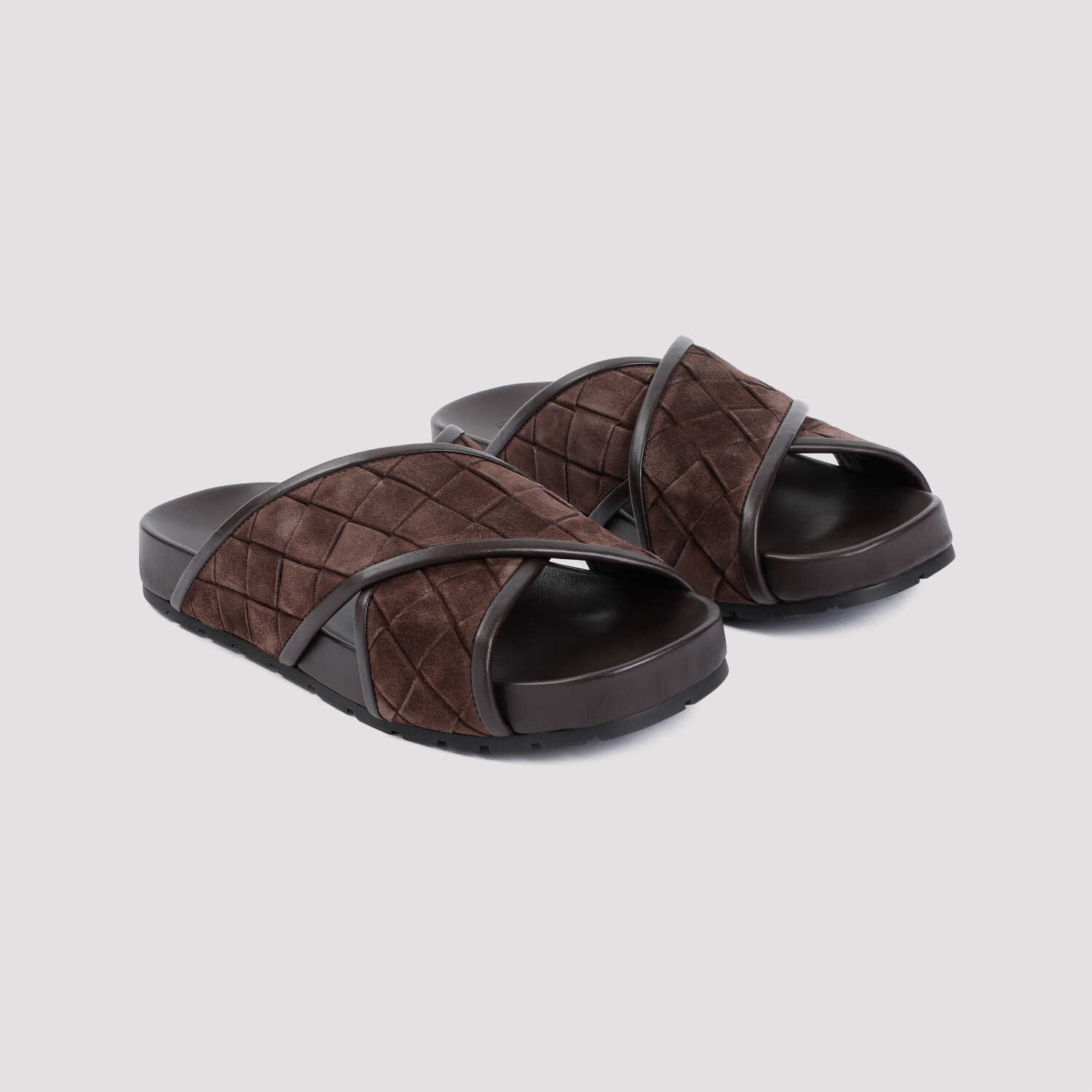 Bottega Veneta Fondant Brown Suede Leather Tarik Criss Cross Sandal. Pure fondant brown suede leather sandal, round and open toe, crisscross detail on the upper, top signature intreccio design, tonal stitching, tonal leather sole, slip-on style.