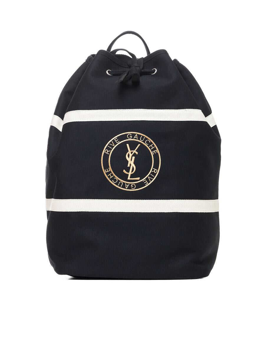 Saint Laurent's black cotton one-shoulder backpack featuring white stripes, top handle, adjustable drawstring fastening, golden thread logo stamp embroidered on the front, adjustable back shoulder strap, detachable internal canvas and leather zip pouch and silver-tone metal hardware.