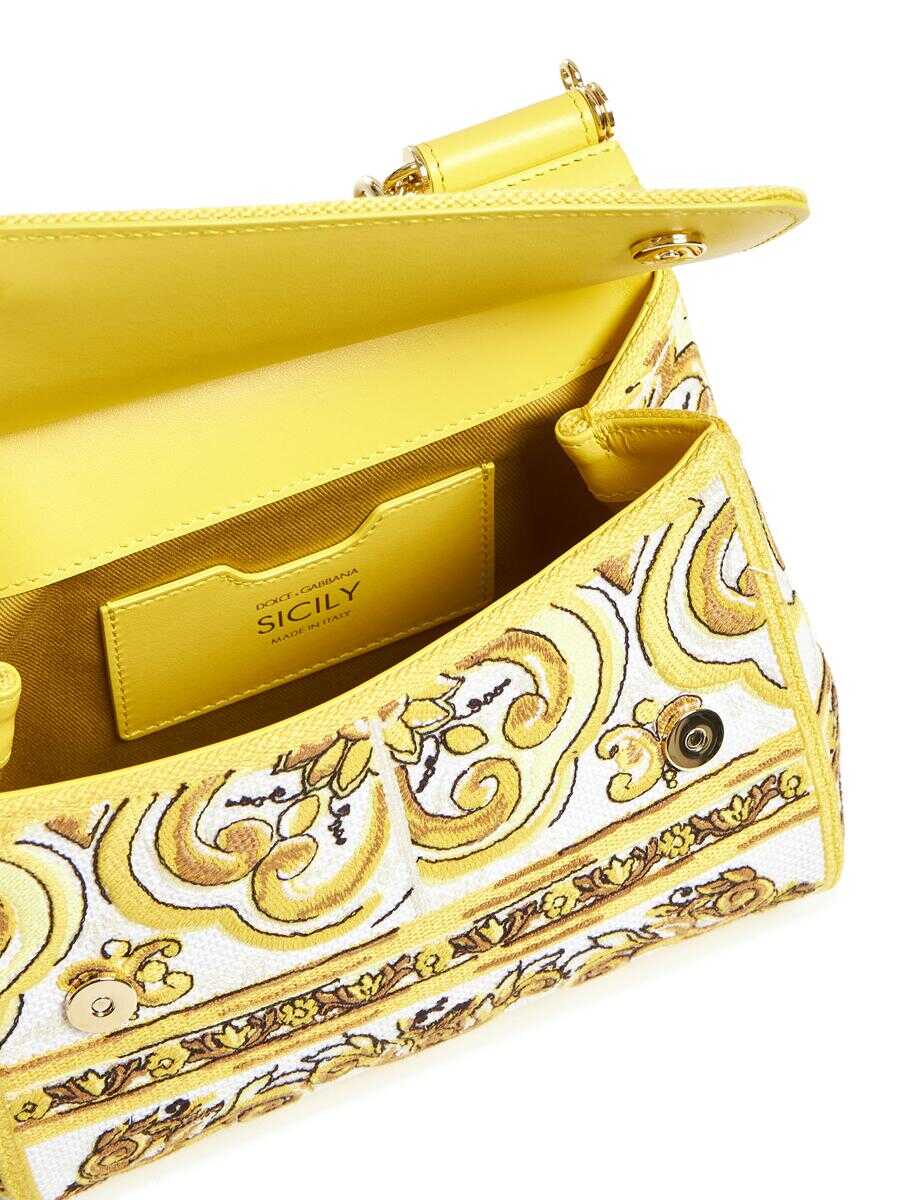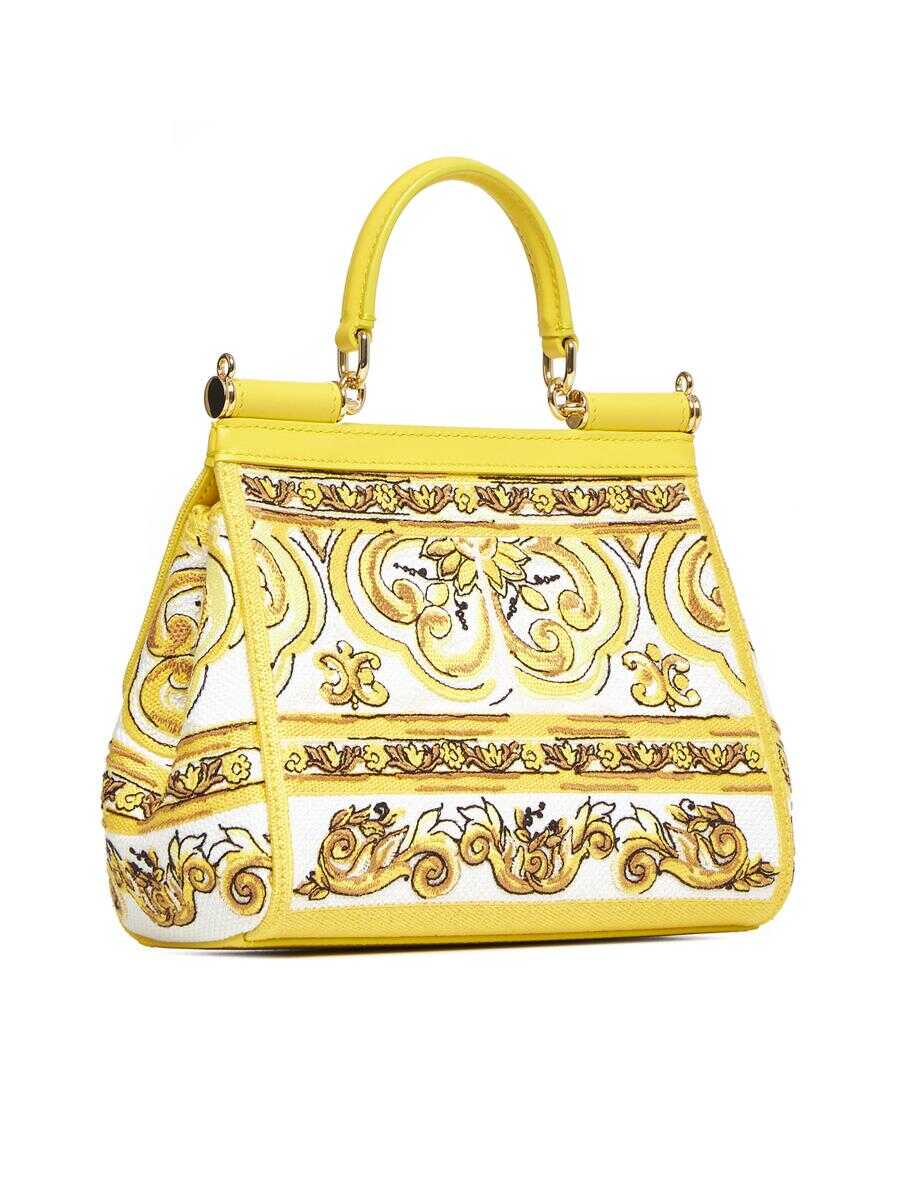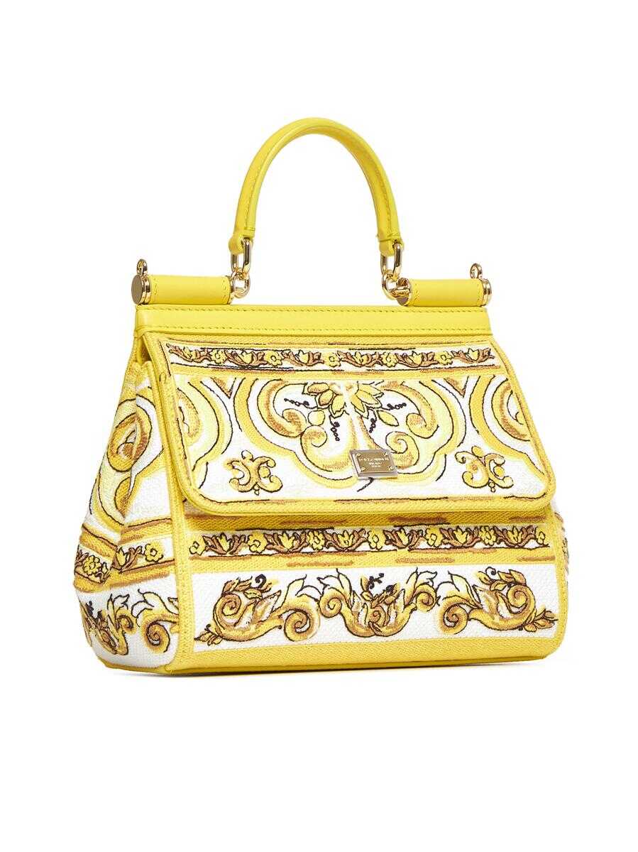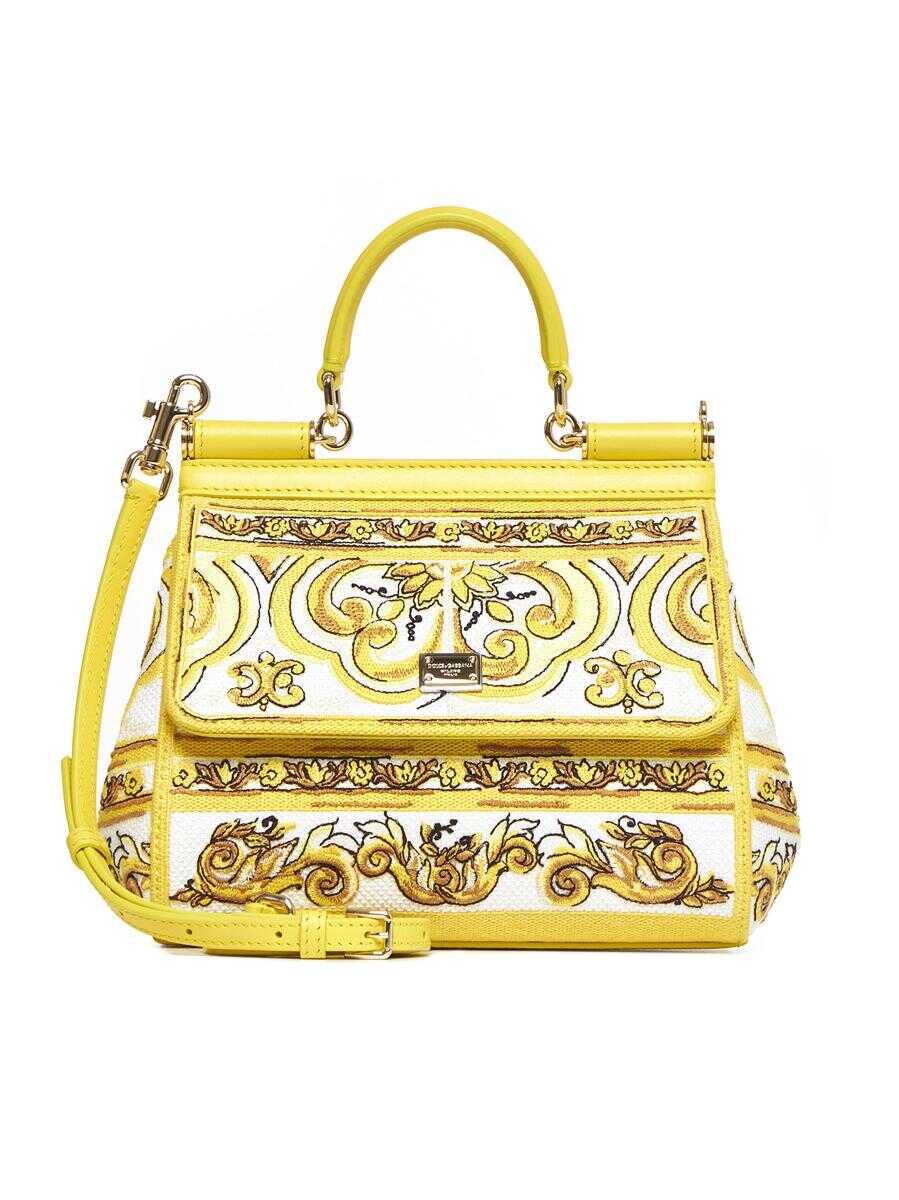 Dolce & Gabbana’s Sicily medium bag in cotton canvas embroidered with Majolica motifs in shades of yellow and white featuring yellow leather edges and details, top handle, adjustable and detachable shoulder strap, logo plaque on the lapel, concealed magnetic fastening, internal card slot and gold-tone metal hardware.