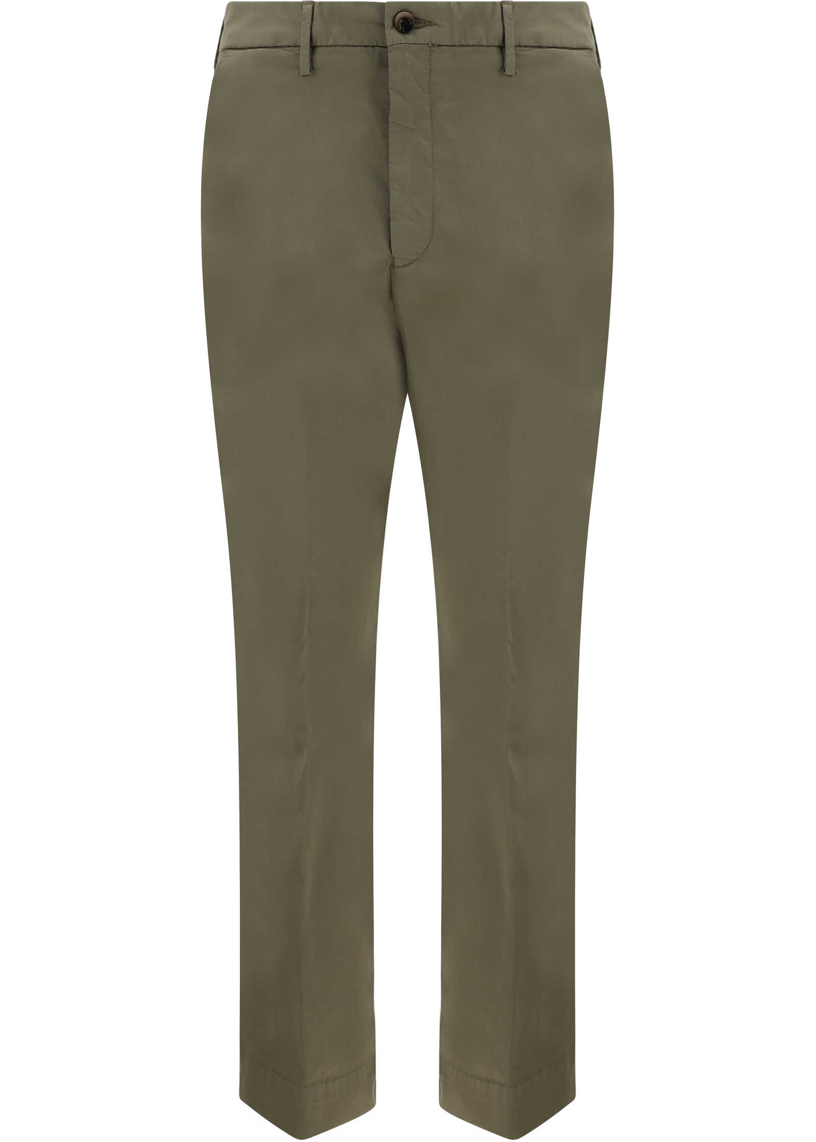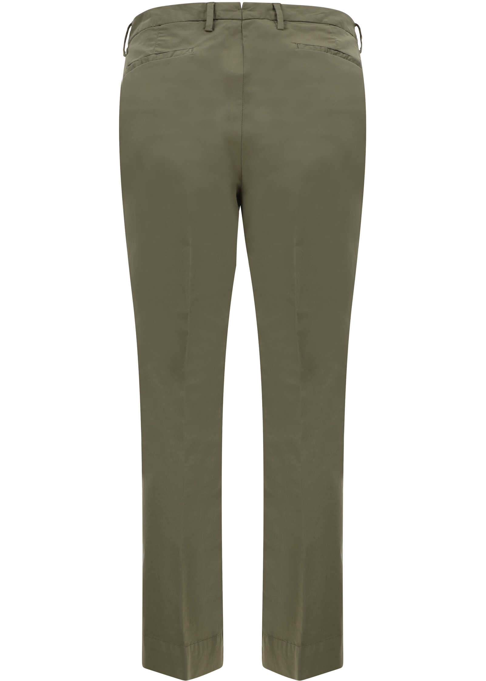 Cotton Diana Pants by Germano, front closure with contrasting button and zipper, two side slash pockets, two welt pockets at back, waistband loops, all-over tone-on-tone stitching, monochrome pattern.