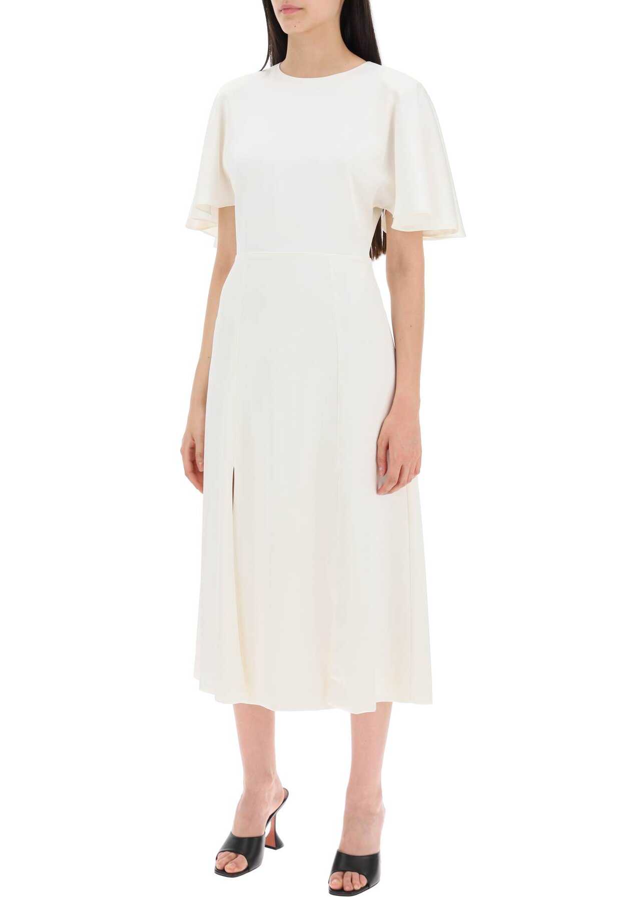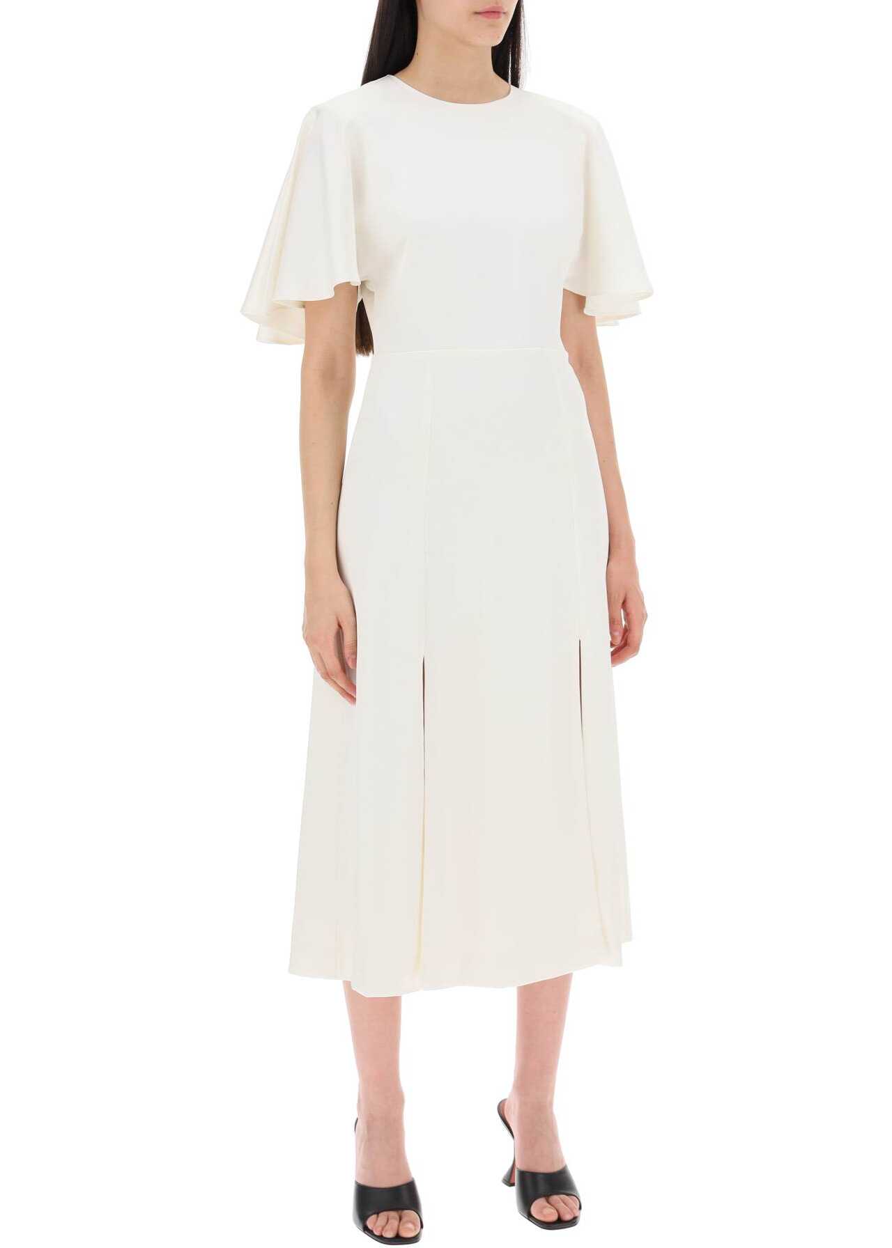 The Rotate midi dress is made of recycled technical satin, featuring structured butterfly sleeves and a double front slit. It has a round neckline, hidden closure at the back, and a high waistline. Fully lined. The model is 177 cm tall and wears an EU size 34.