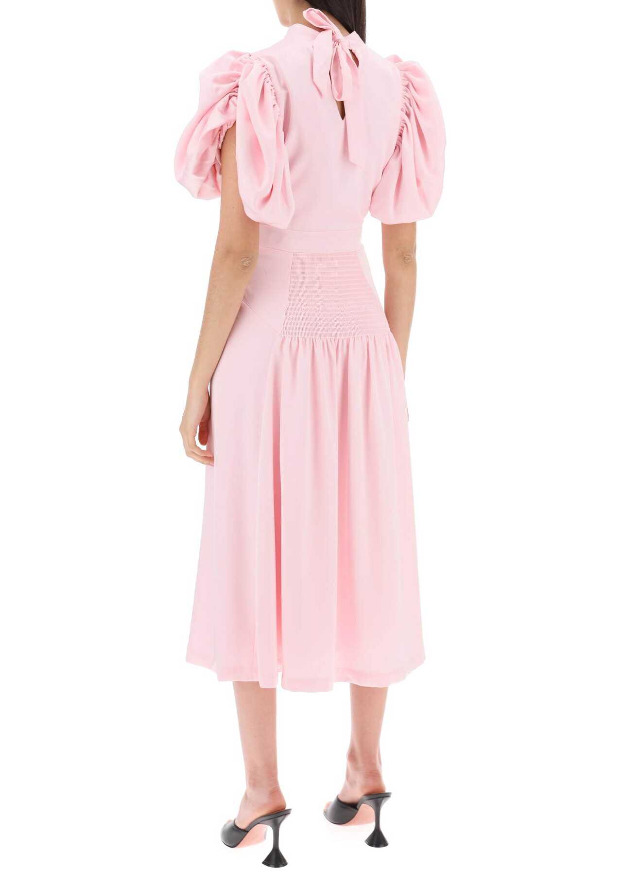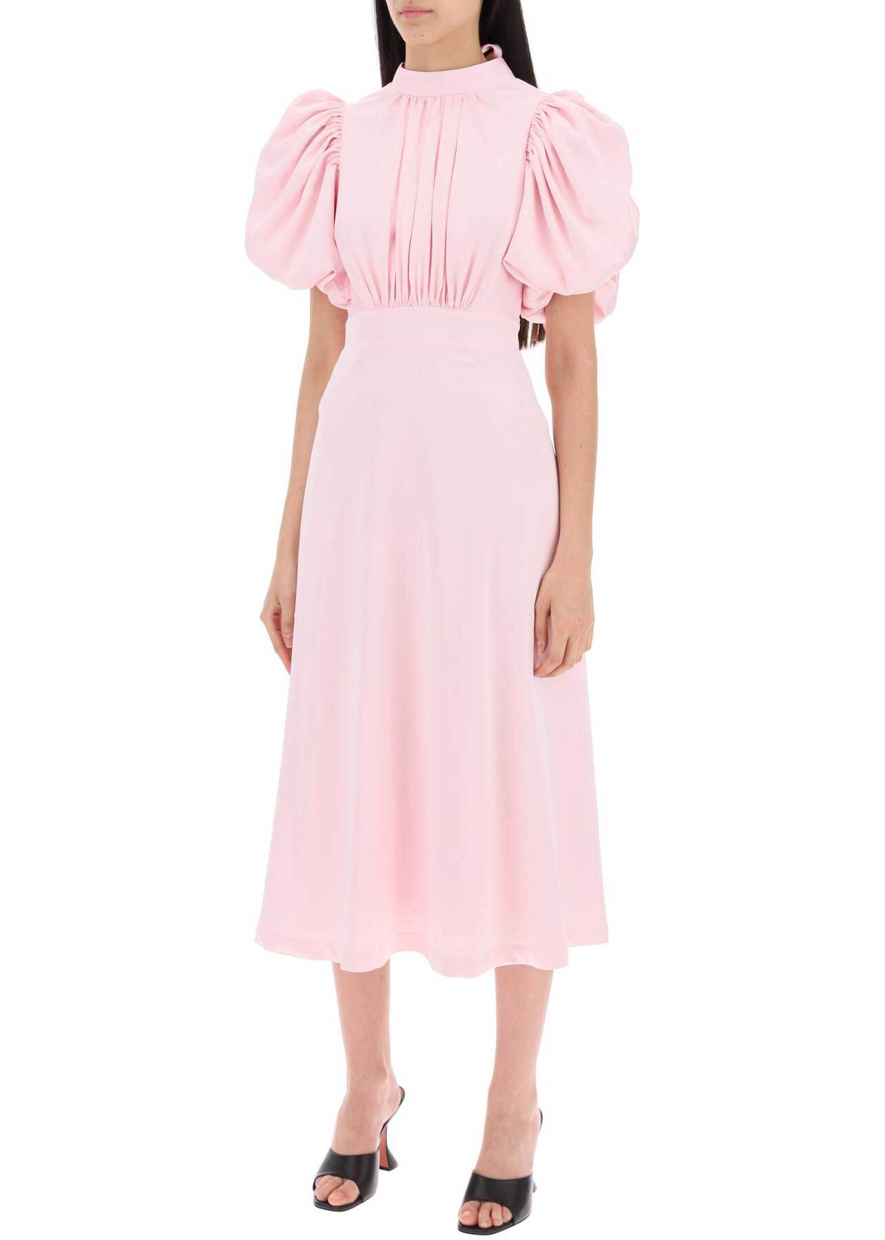 The Rotate midi dress is made of recycled technical satin and comes with a slip. The design features balloon sleeves with a central ruffle and a stand-up collar with a cut-out and bow to tie at the back. The fitted waist is enhanced by gathers, while the flared skirt has a smocked panel on the back. The model is 177 cm tall and wears an EU size 34.
