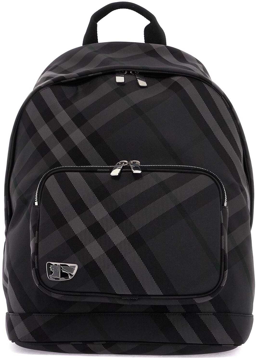 The Grid backpack in nylon with a durable ribbed construction and iconic Burberry Check pattern woven into the fabric. Lined design with main zip compartment, internal laptop pocket, and front zip pocket adorned with an enamel Equestrian Knight shield plaque. Hand-painted edges, adjustable B buckle shoulder straps, padded mesh back panel, top handle. Brushed metal hardware.