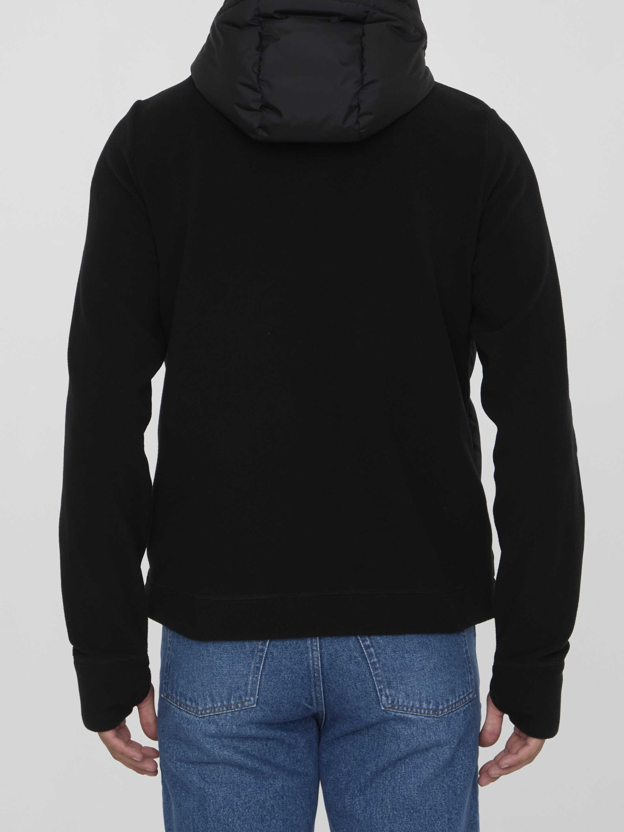 Cardigan in black fleece with hood and front part in padded nylon. It features drawstring hood, front two-way zip closure, two side zip pockets, logo patch on left sleeve and drawstring on hem. Regular fit.