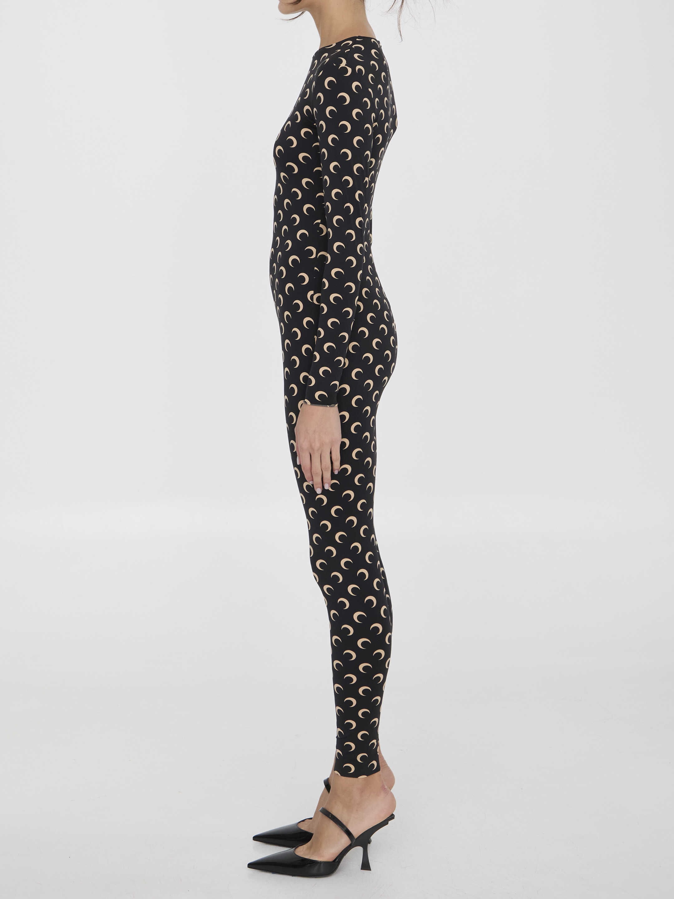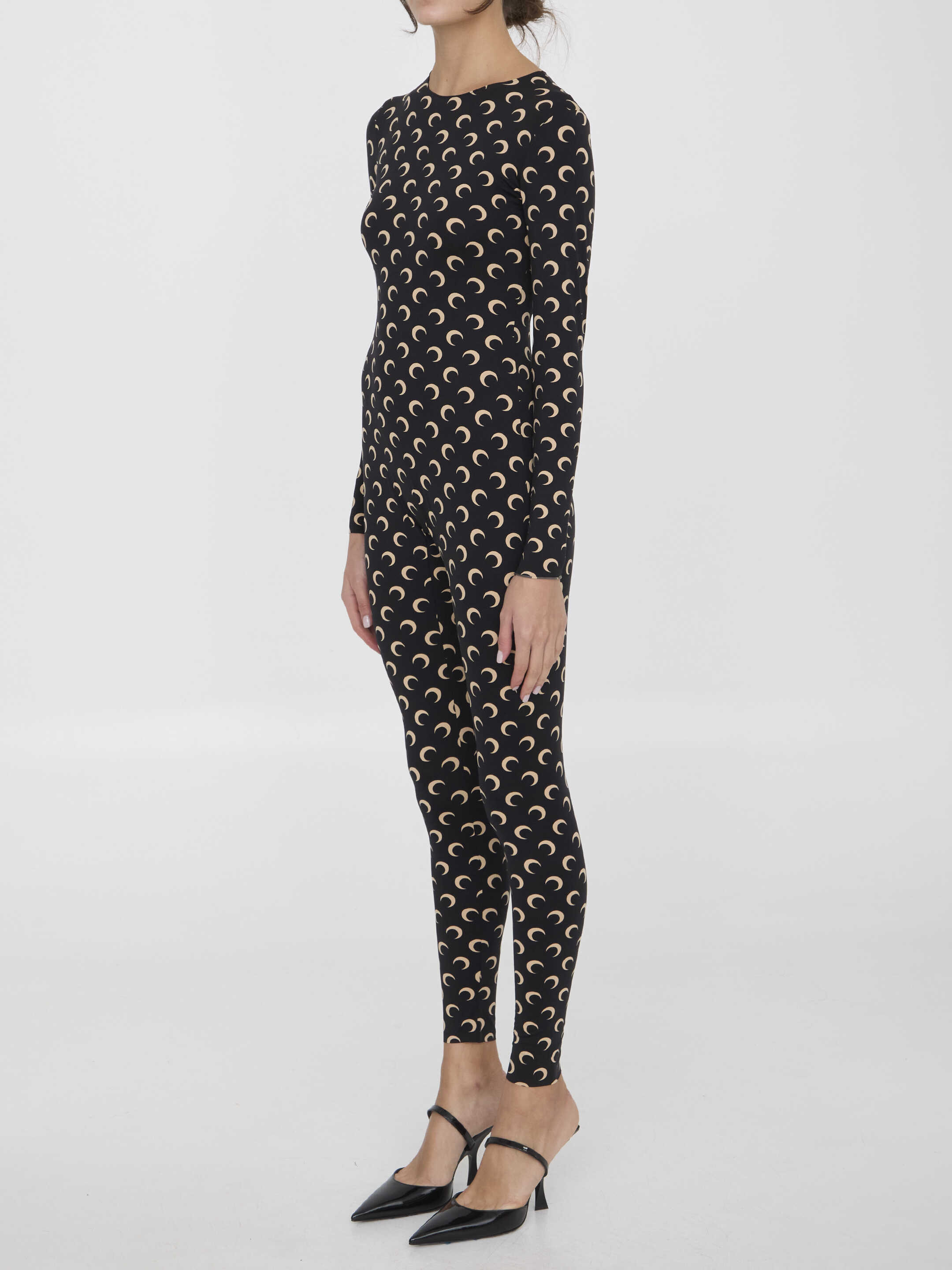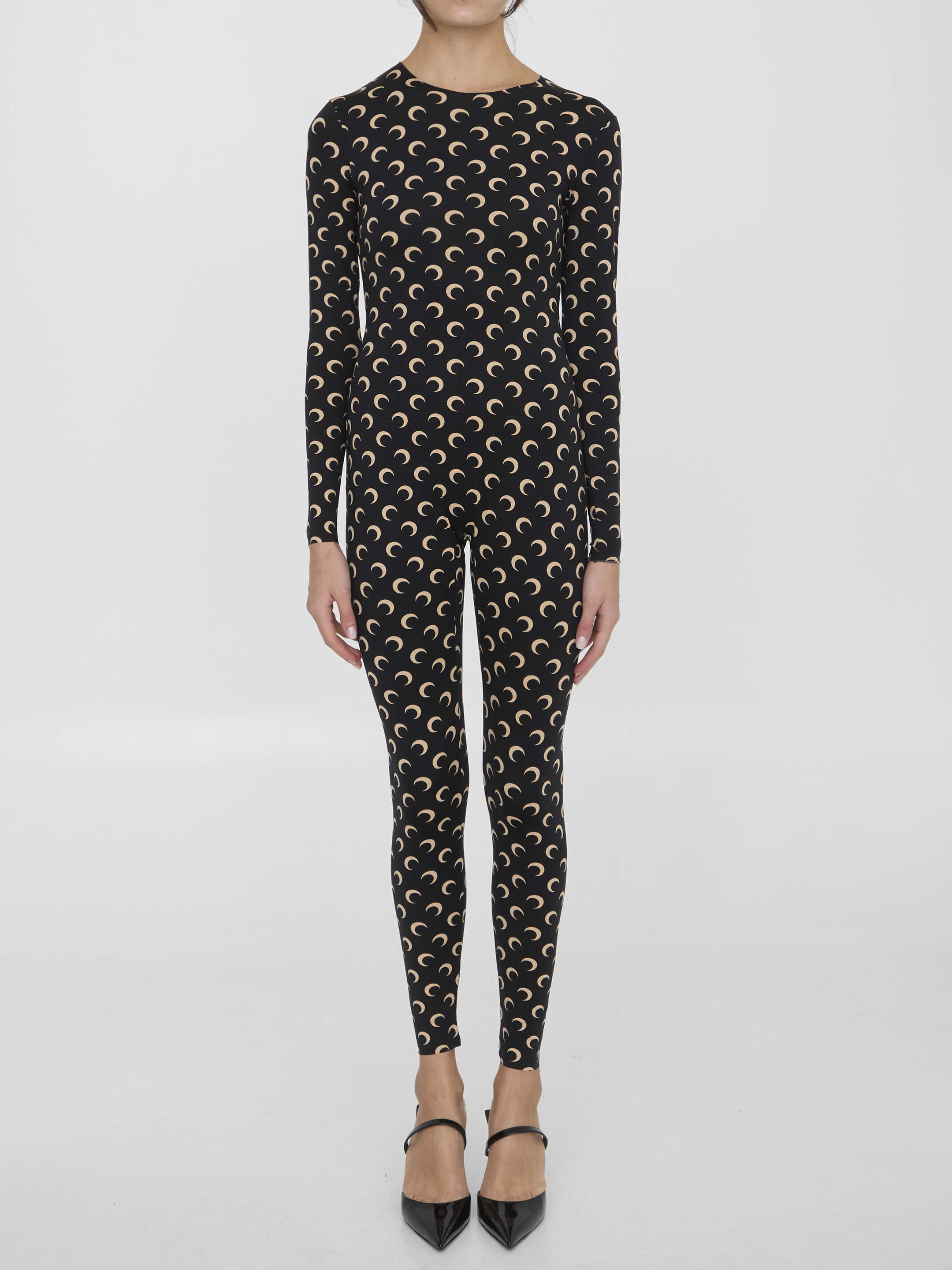 Catsuit in black and nude recycled jersey with all-over Moon print. It features rear zip closure and cuffs and hem finished with raw edges. Second-skin effect. Regular fit.
