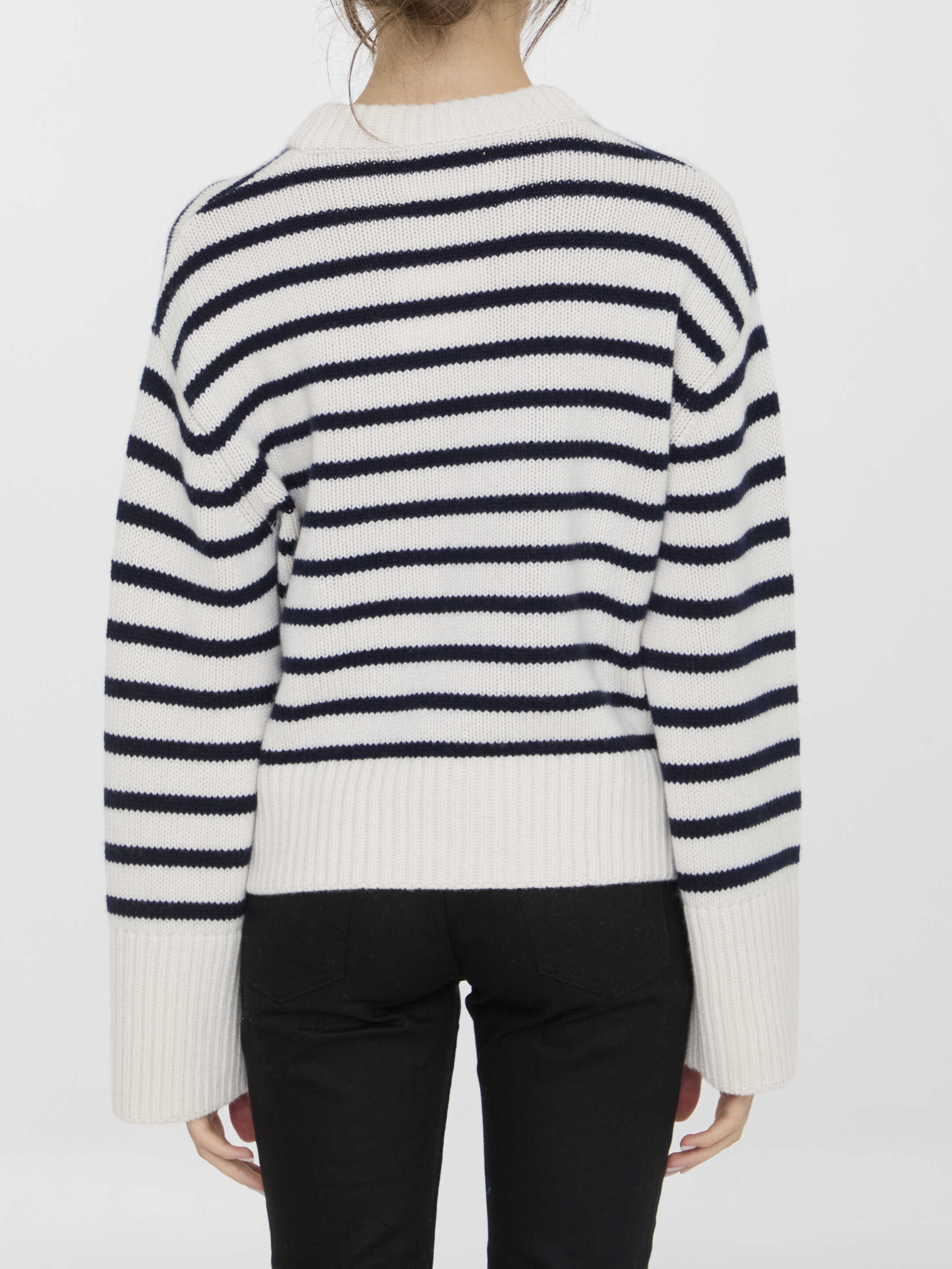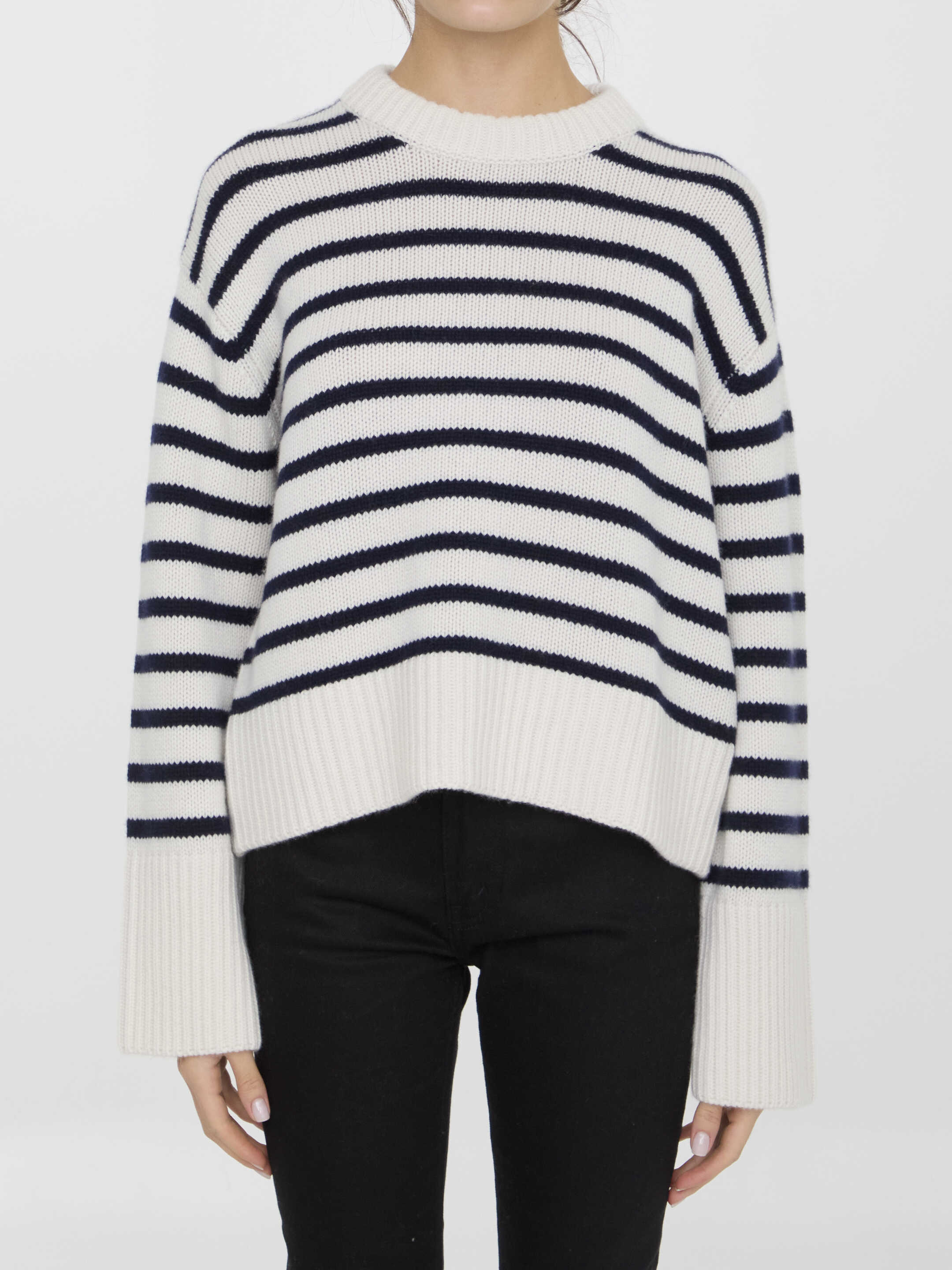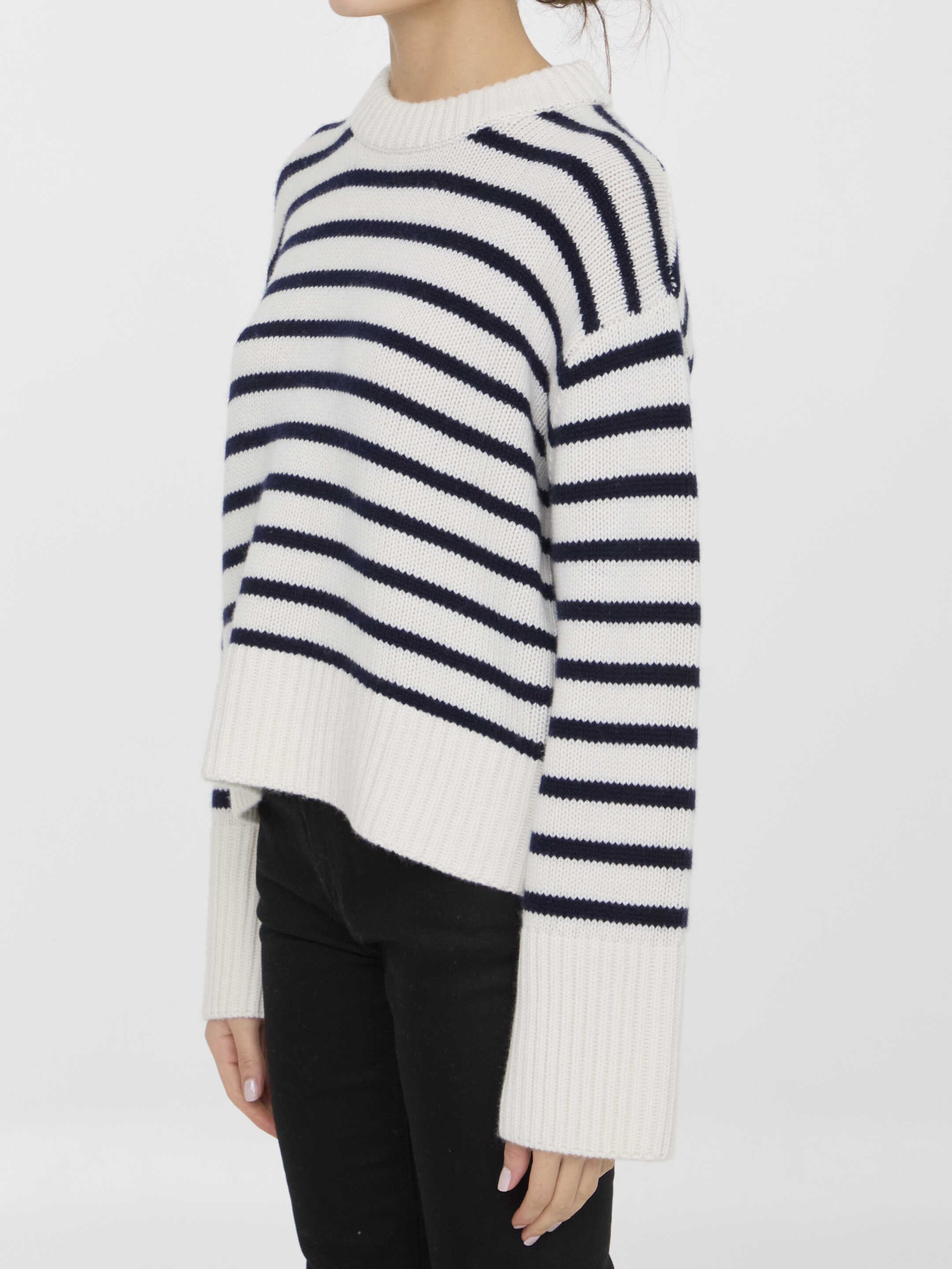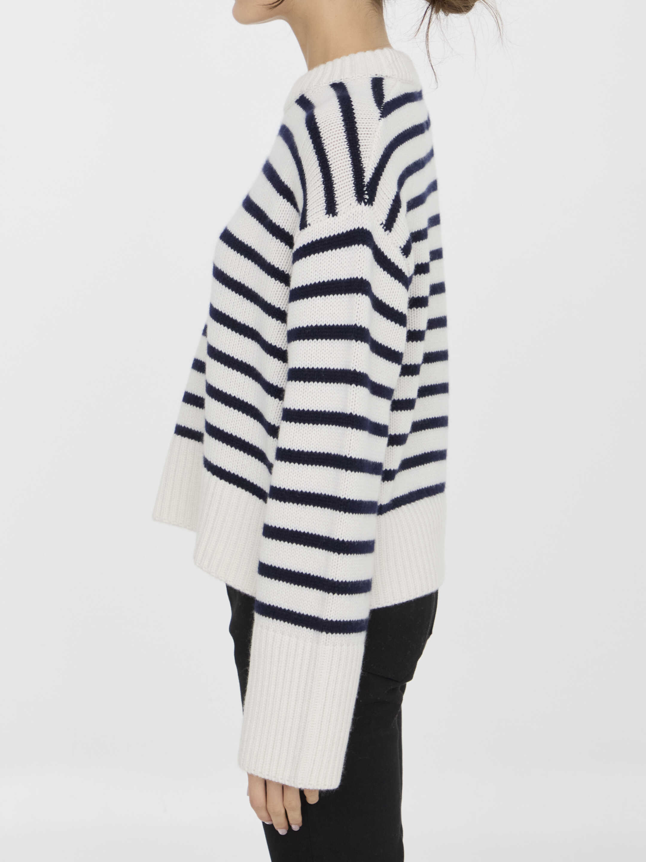 Long-sleeved crewneck Sony sweater in white and blue striped cashmere. Ribbed collar, cuffs and hem. Regular fit.