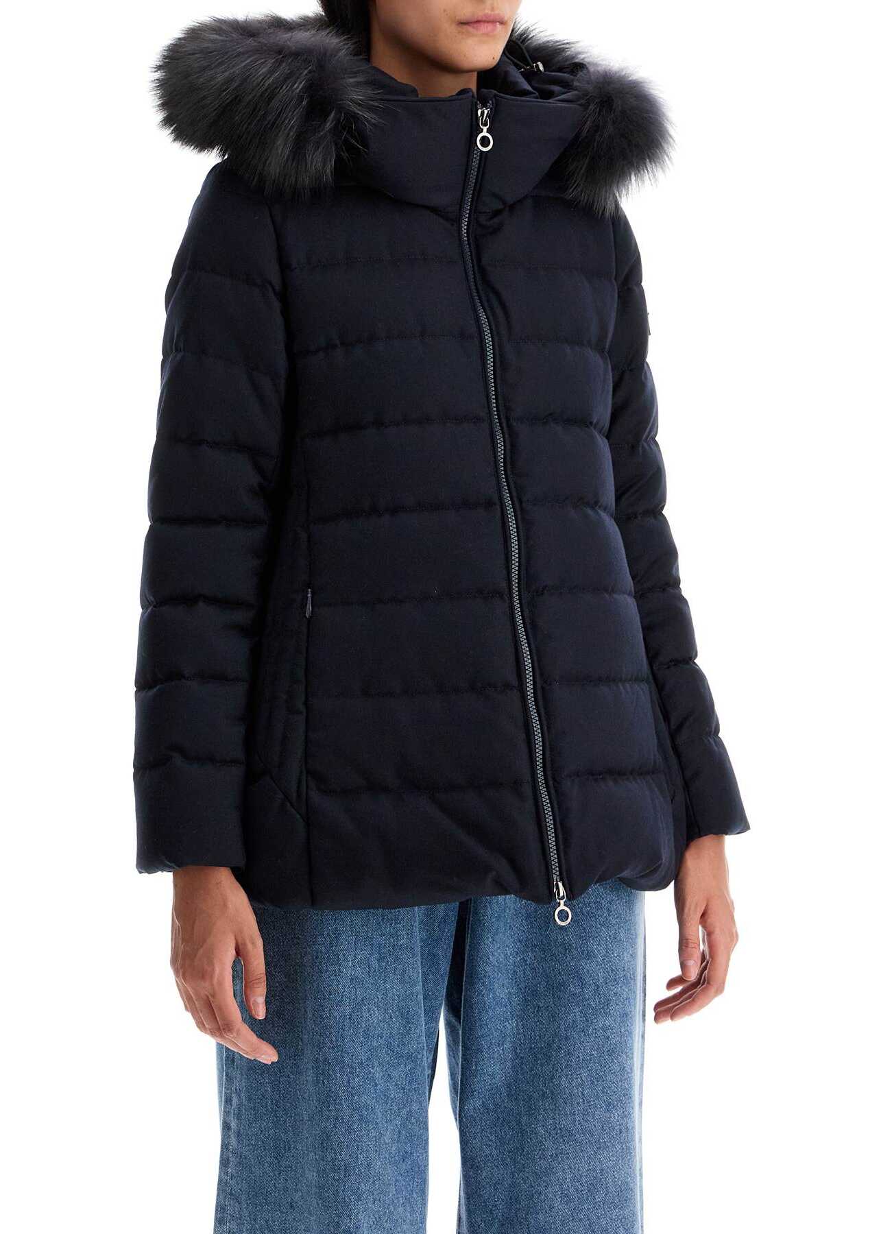 This short Tatras down jacket is made of soft wool fabric, with horizontal stitching and warm 90/10 goose feather and down filling. It features an adjustable hood outlined by a soft removable raccoon fur insert, fastened with buttons. The model also has a double-slider zip closure, invisible zip pockets inserted in the seams, and an adjustable bottom with internal drawstring. Lined and equipped with inner pockets, it is signed on the chest with a logo patch. The slim fit is defined