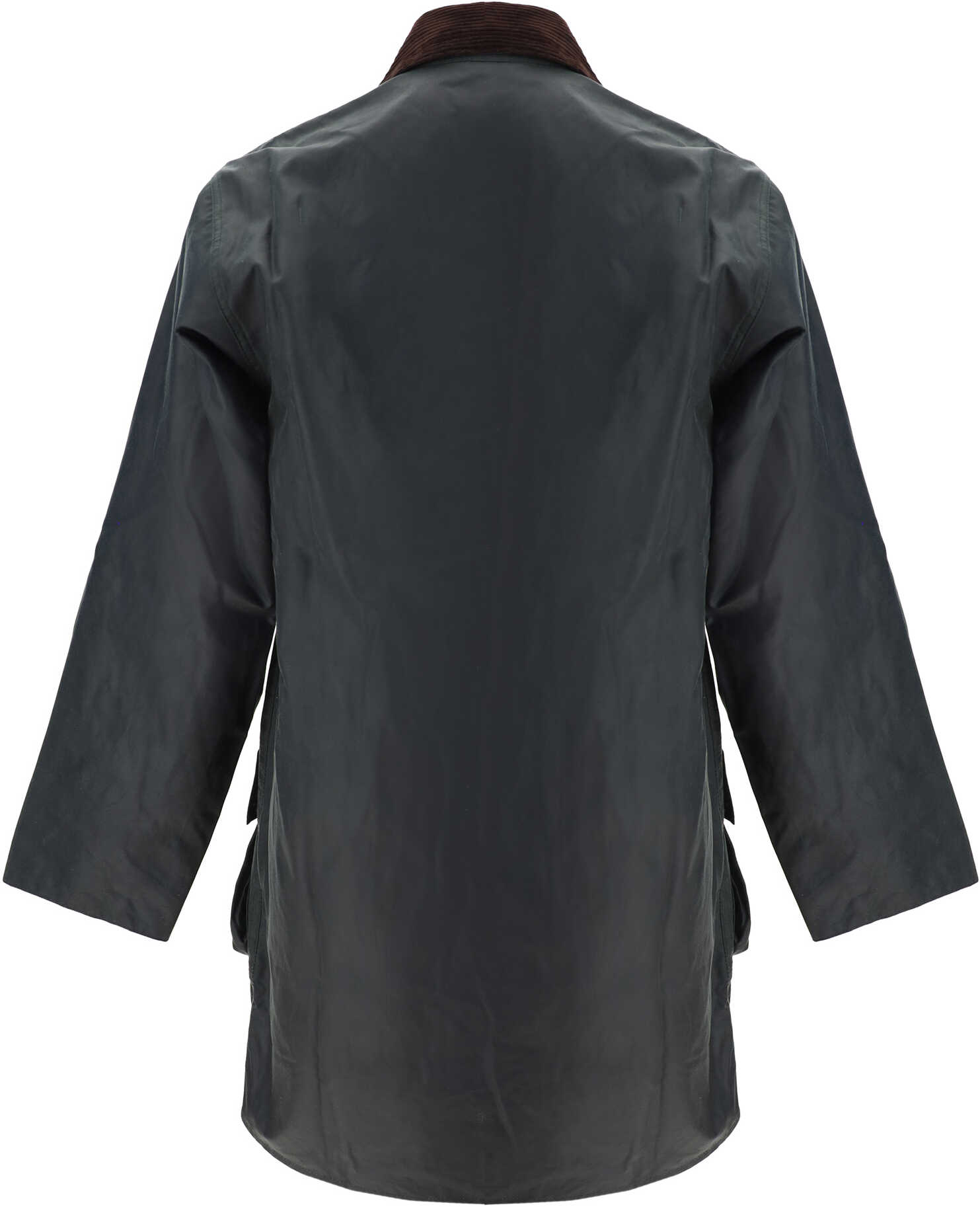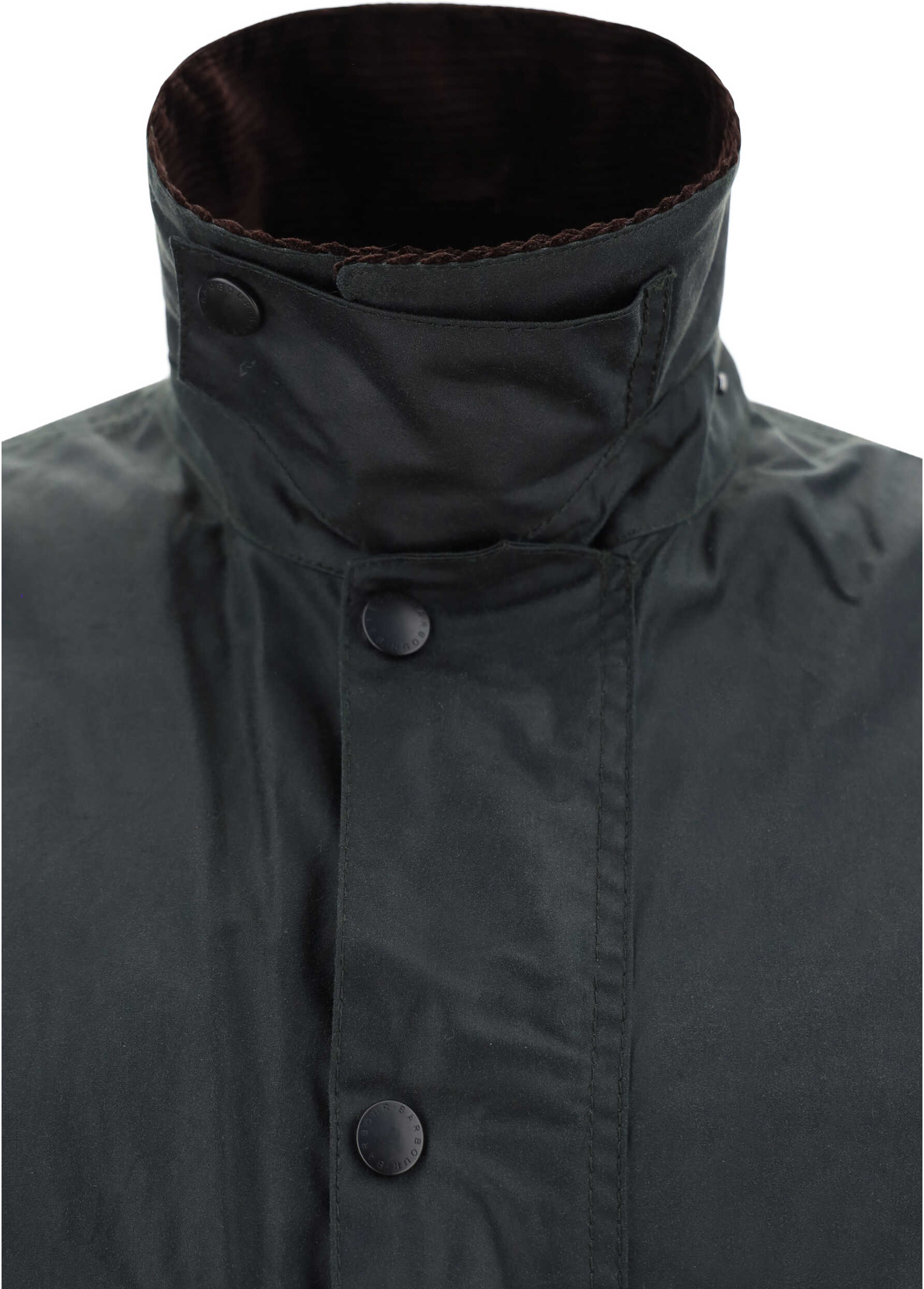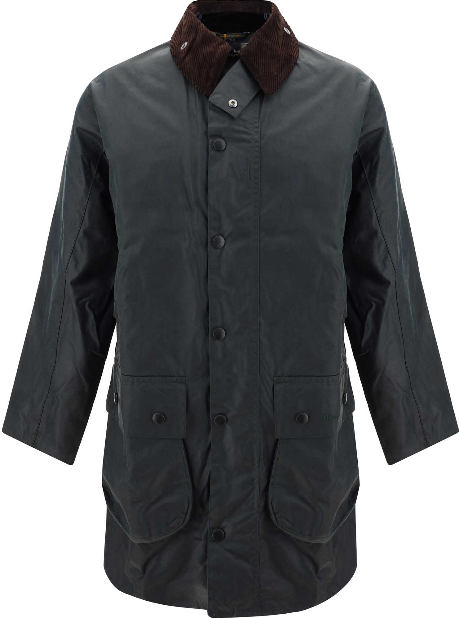 Border Wax Jacket by Barbour, front zipper and snap button closure, iconic corduroy collar, two side welt pockets, two large flap pockets with snap buttons, iconic brand monogram on front, iconic waxed design.