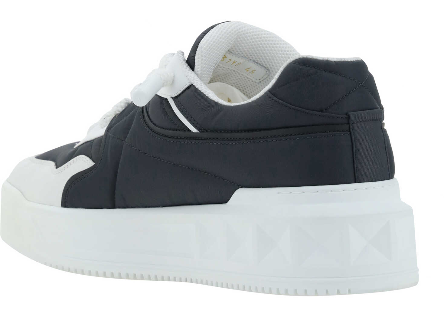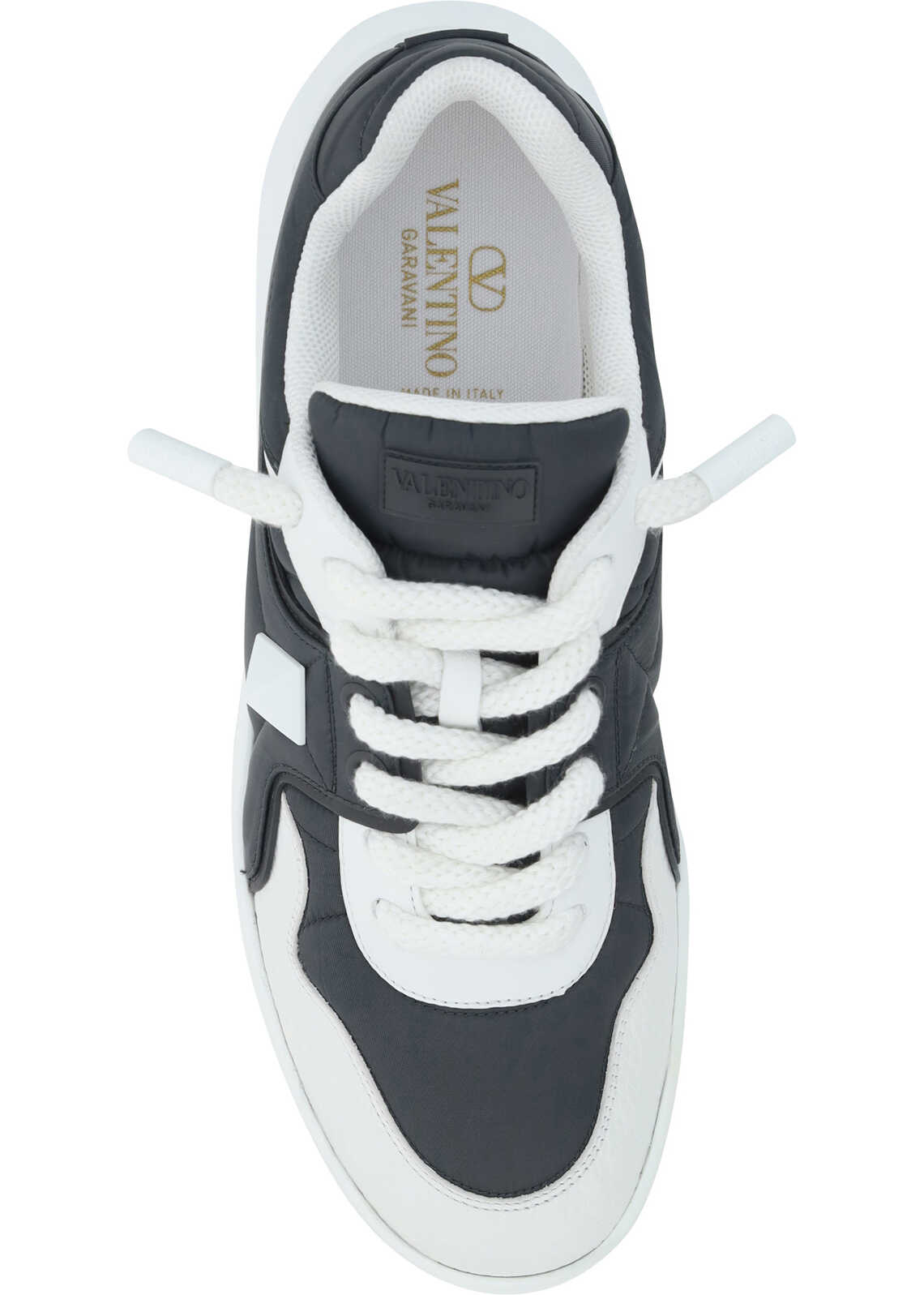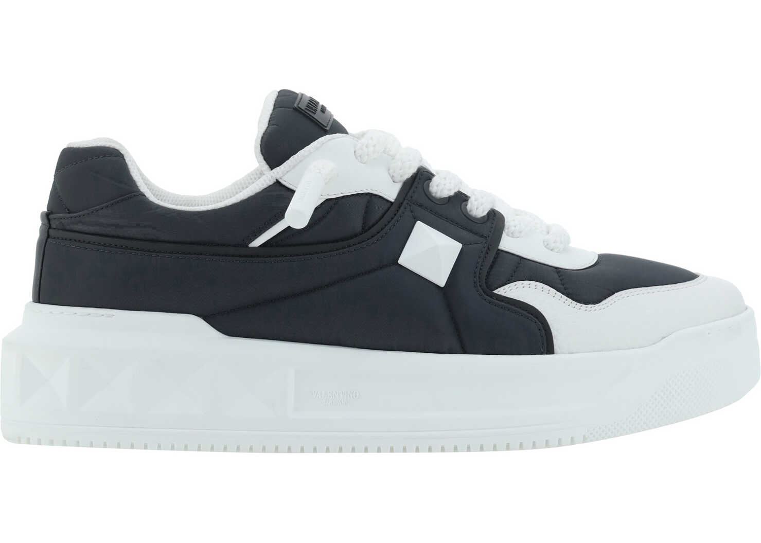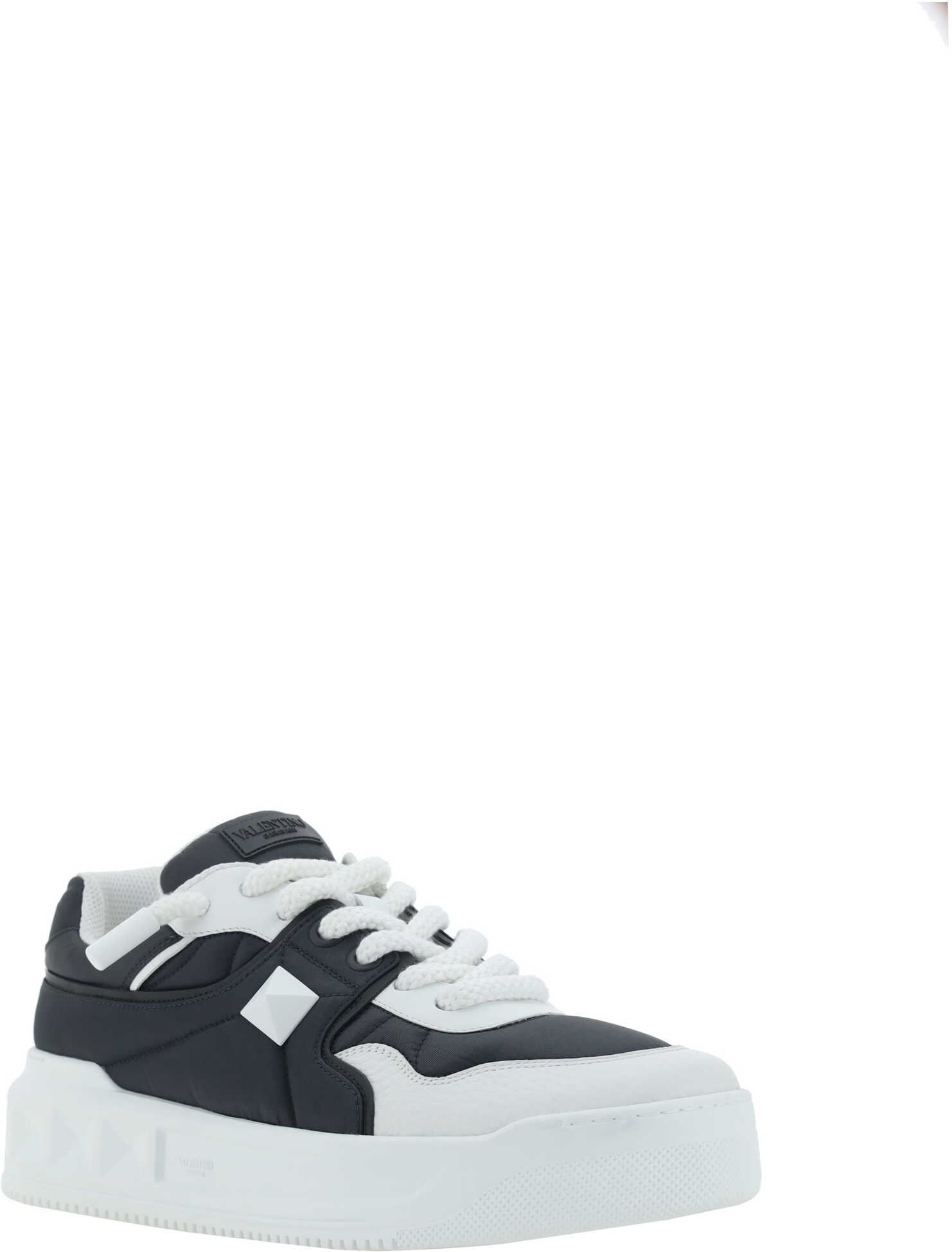 Calfskin Sneaker by Valentino Garavani, round toe, flat sole, front lace-up closure, iconic brand signature press-stamped on front tongue, iconic brand stud embossed on side panel, contrasting textured sole with stud design.