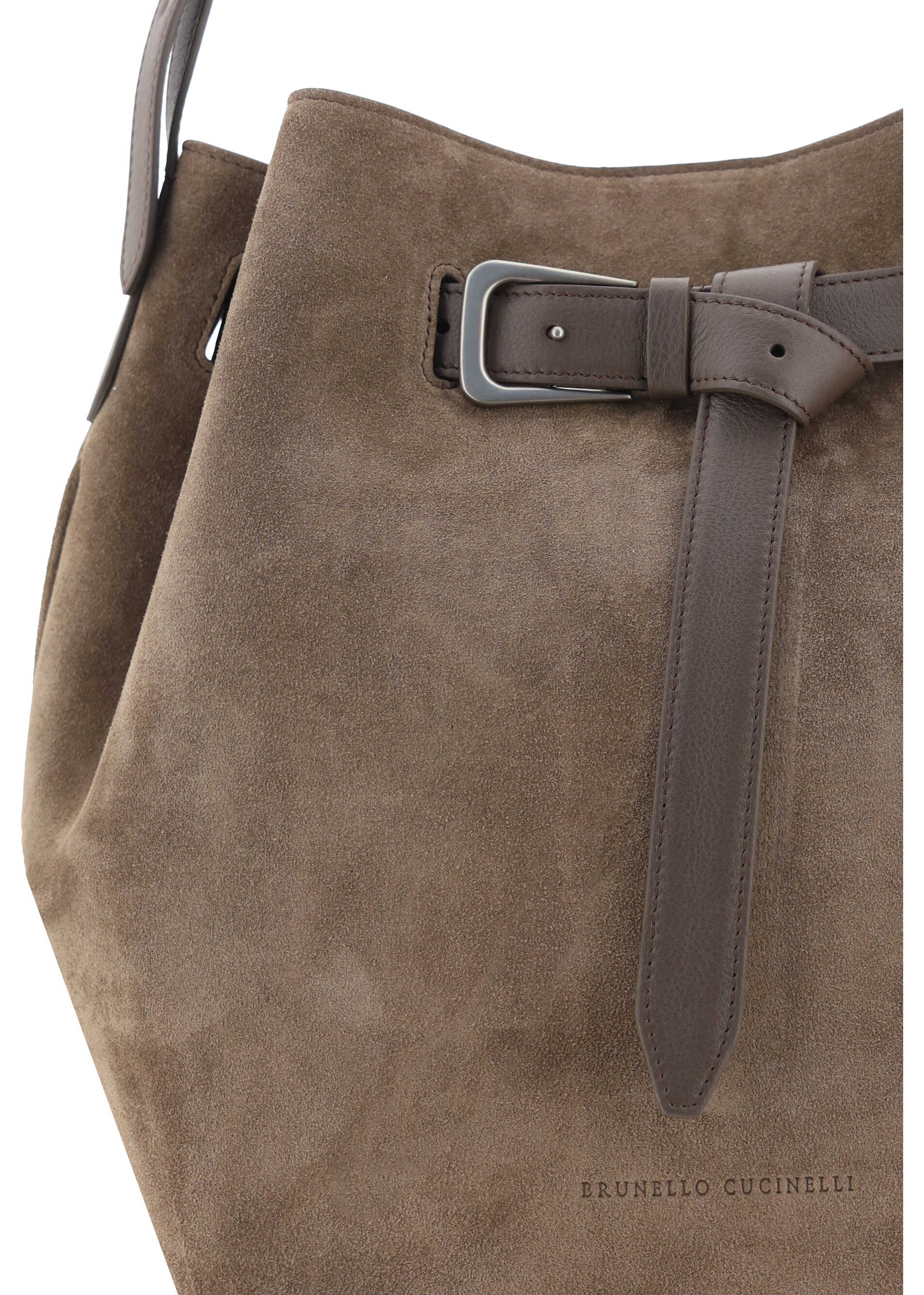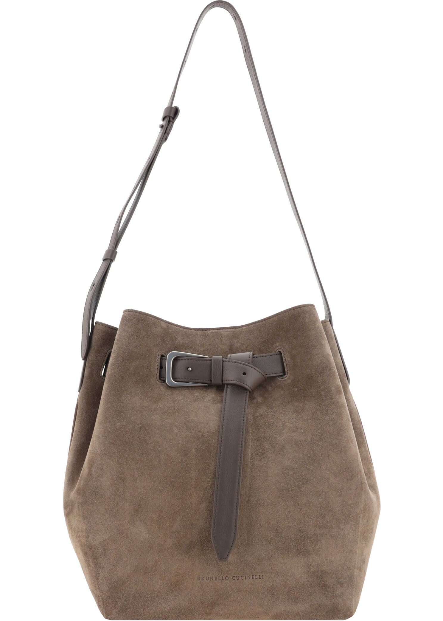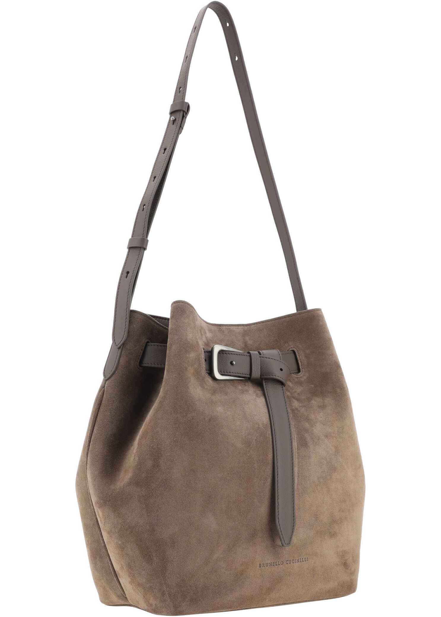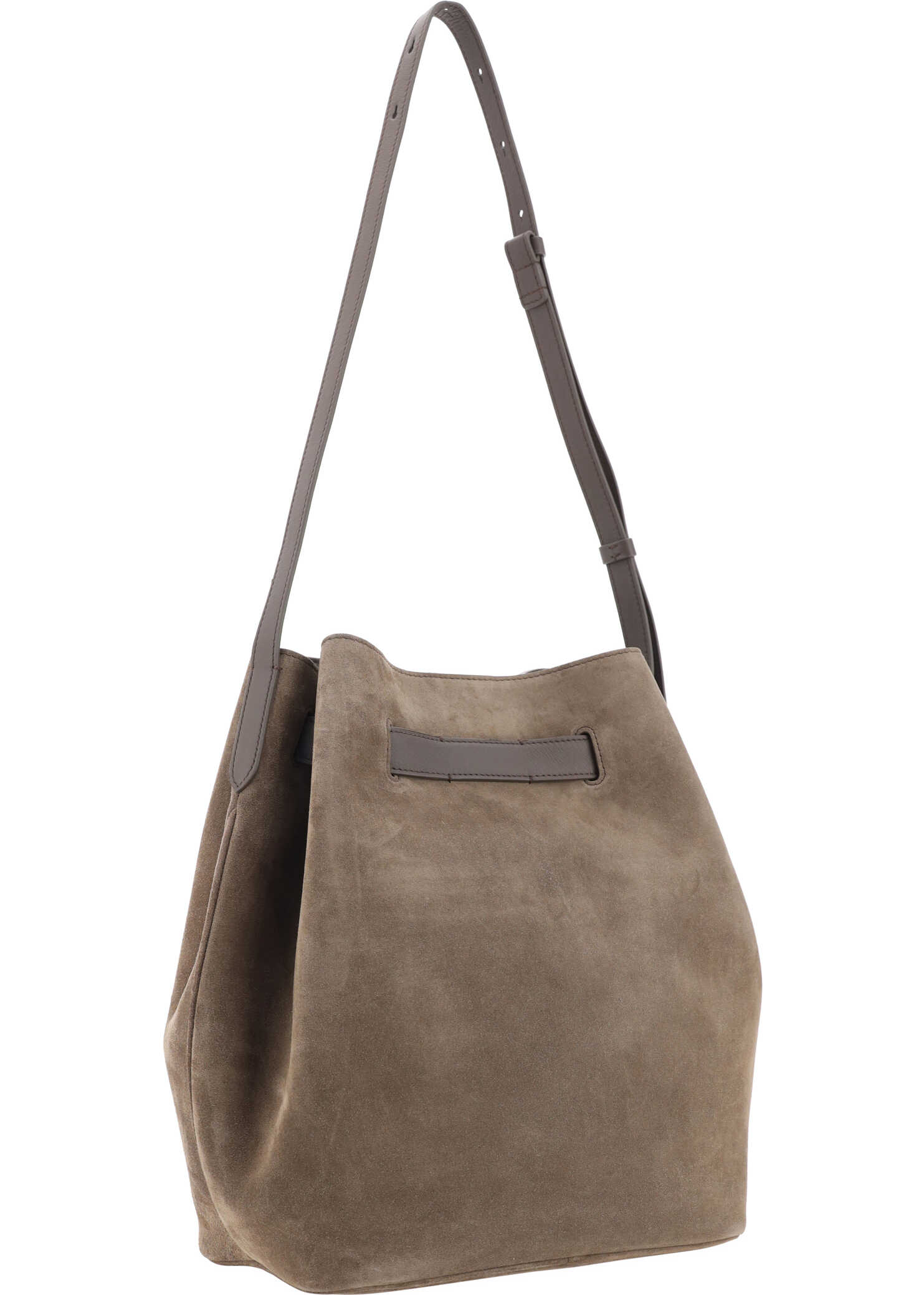 Leather Bucket Bag by Brunello Cucinelli, suede design, top closure by adjustable buckle, adjustable single flat handle at top, , three-dimensional plaque with iconic brand monogram press-stamped on front.